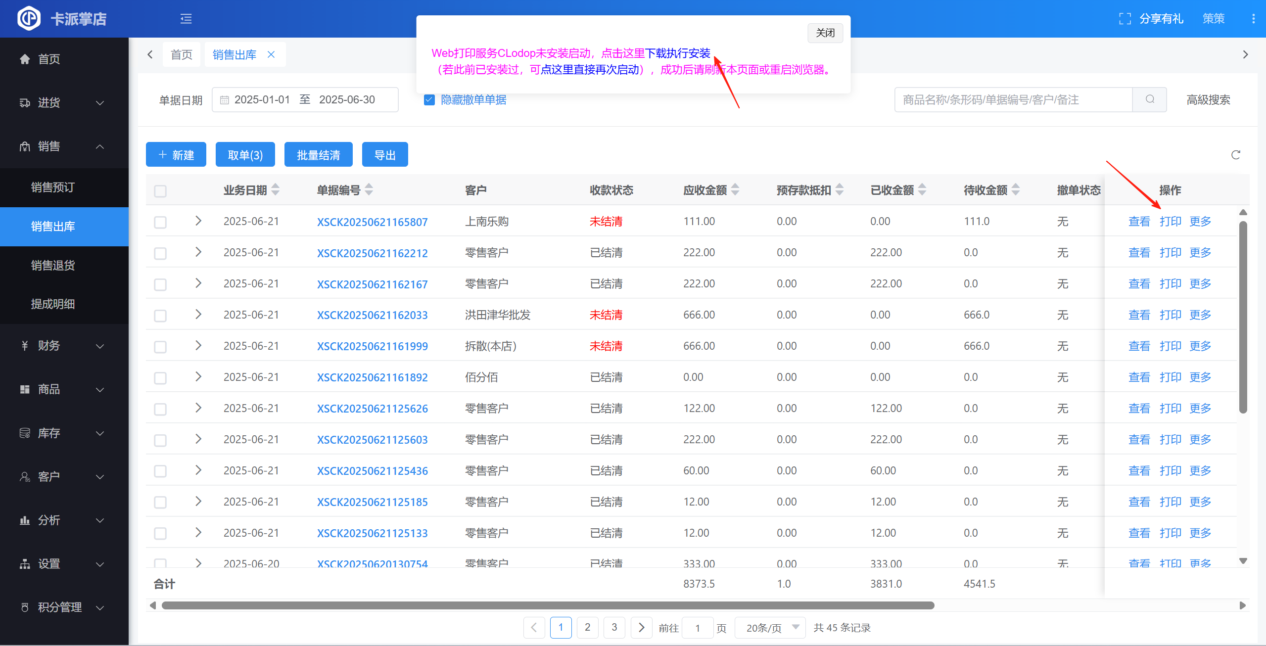 目录 搜索 了解卡派掌店新手指引如何导入原系统的商品及库存如何导入原系统的供应商或客户如何删除导入的数据常见问题导入数据时提示导入失败怎么办全部功能进货进货预订进货入库入错库怎么作废或撤销单据进货退货供应商销售销售预订销售出库没有库存,可以直接销售商品吗销售退货提成明细财务收款付款其它收入其它支出资金流水收支类型资金账户账户转账商品商品信息商品套餐提成设置单位设置属性设置收货行情如何订阅和使用收货行情如何复制订阅的行情表出货行情订阅记录库存库存查询库存盘点库存调拨库存流水库存预警质保期查询客户客户价格等级分析销售统计对账统计设置商户管理门店管理仓库管理角色管理为什么有些菜单或按钮我看不到员工管理打印设置无法打印或者系统提示未安装打印控件打印机默认配置系统设置系统初始化导出记录个人信息 暂无相关搜索结果! 本文档使用 MinDoc 发布 无法打印或者系统提示未安装打印控件 ▲ 如未安装过打印机控件,请点击上方的下载执行安装,将打印机驱动下载后安装即可 ▲ 安装后请运行打开打印控件文档更新时间: 2025-08-06 08:27 作者:admin
