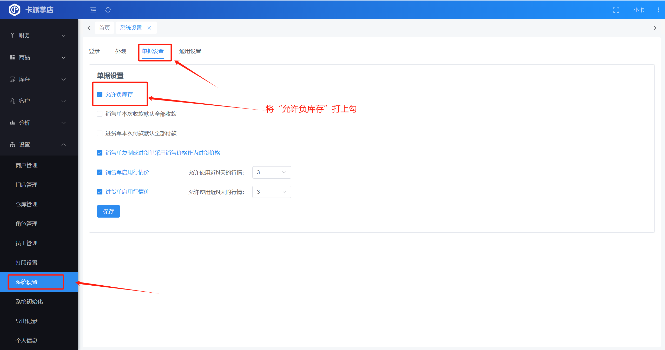 目录 搜索 了解卡派掌店新手指引如何导入原系统的商品及库存如何导入原系统的供应商或客户如何删除导入的数据常见问题导入数据时提示导入失败怎么办全部功能进货进货预订进货入库入错库怎么作废或撤销单据进货退货供应商销售销售预订销售出库没有库存,可以直接销售商品吗销售退货提成明细财务收款付款其它收入其它支出资金流水收支类型资金账户账户转账商品商品信息商品套餐提成设置单位设置属性设置收货行情如何订阅和使用收货行情如何复制订阅的行情表出货行情订阅记录库存库存查询库存盘点库存调拨库存流水库存预警质保期查询客户客户价格等级分析销售统计对账统计设置商户管理门店管理仓库管理角色管理为什么有些菜单或按钮我看不到员工管理打印设置无法打印或者系统提示未安装打印控件打印机默认配置系统设置系统初始化导出记录个人信息 暂无相关搜索结果! 本文档使用 MinDoc 发布 没有库存,可以直接销售商品吗 没有库存是可以直接销售商品的,首先需要在【系统设置】-【单据设置】下的“允许负库存”功能打上勾,然后再创建销售出库单,即可实现无库存商品出库。文档更新时间: 2025-08-06 08:30 作者:admin