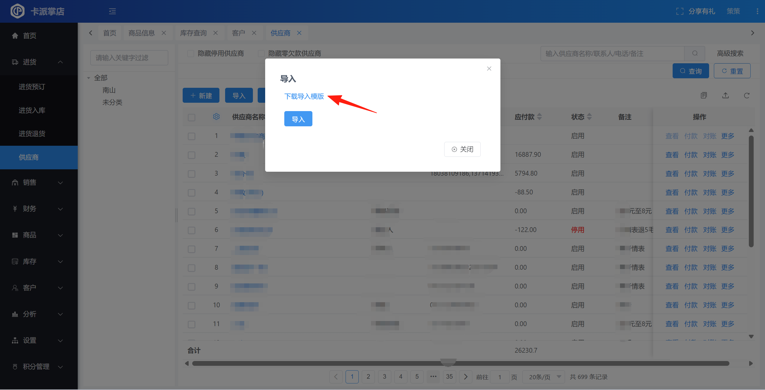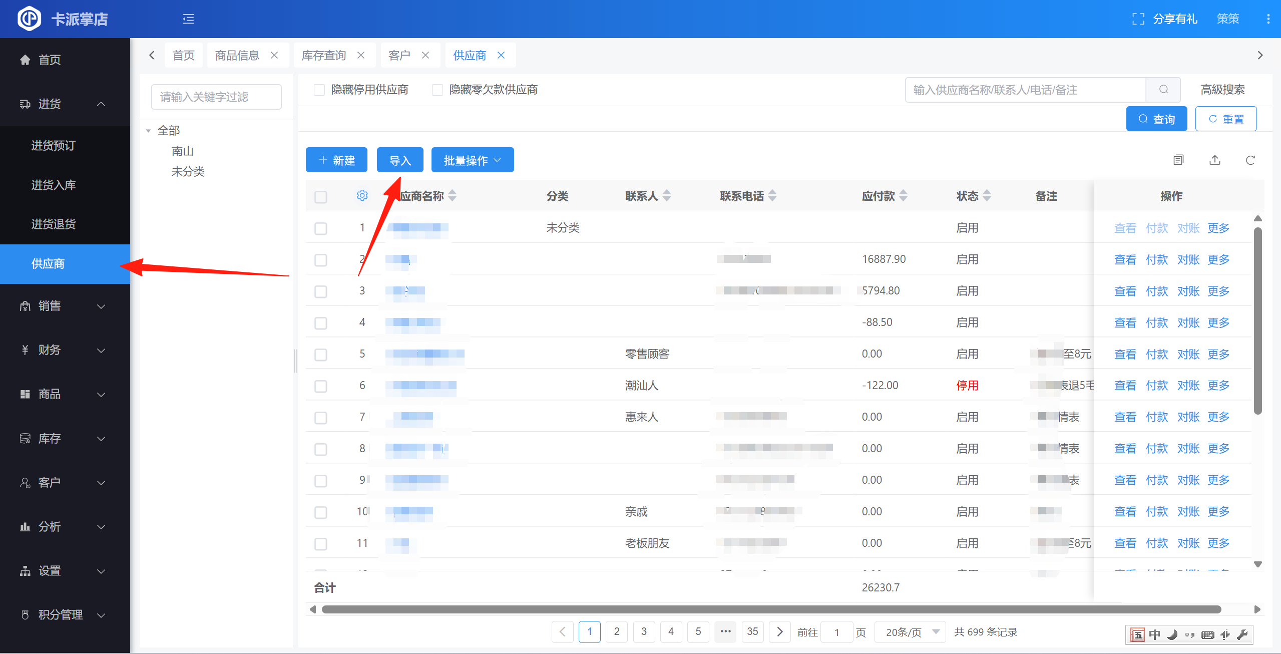 ▲ 供应商导入,找到供应商菜单,点击【导入】