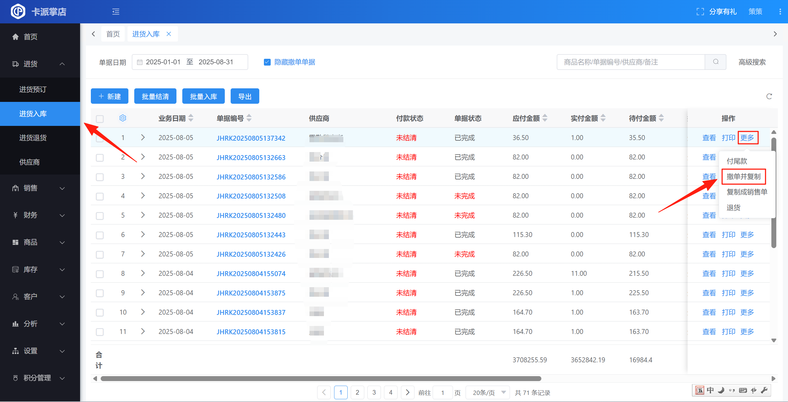 目录 搜索 了解卡派掌店新手指引如何导入原系统的商品及库存如何导入原系统的供应商或客户如何删除导入的数据常见问题导入数据时提示导入失败怎么办全部功能进货进货预订进货入库入错库怎么作废或撤销单据进货退货供应商销售销售预订销售出库没有库存,可以直接销售商品吗销售退货提成明细财务收款付款其它收入其它支出资金流水收支类型资金账户账户转账商品商品信息商品套餐提成设置单位设置属性设置收货行情如何订阅和使用收货行情如何复制订阅的行情表出货行情订阅记录库存库存查询库存盘点库存调拨库存流水库存预警质保期查询客户客户价格等级分析销售统计对账统计设置商户管理门店管理仓库管理角色管理为什么有些菜单或按钮我看不到员工管理打印设置无法打印或者系统提示未安装打印控件打印机默认配置系统设置系统初始化导出记录个人信息 暂无相关搜索结果! 本文档使用 MinDoc 发布 入错库怎么作废或撤销单据 路径:【进货】-【进货入库】▲ 点击【更多】点击【撤单并复制】按钮文档更新时间: 2025-08-06 14:17 作者:admin