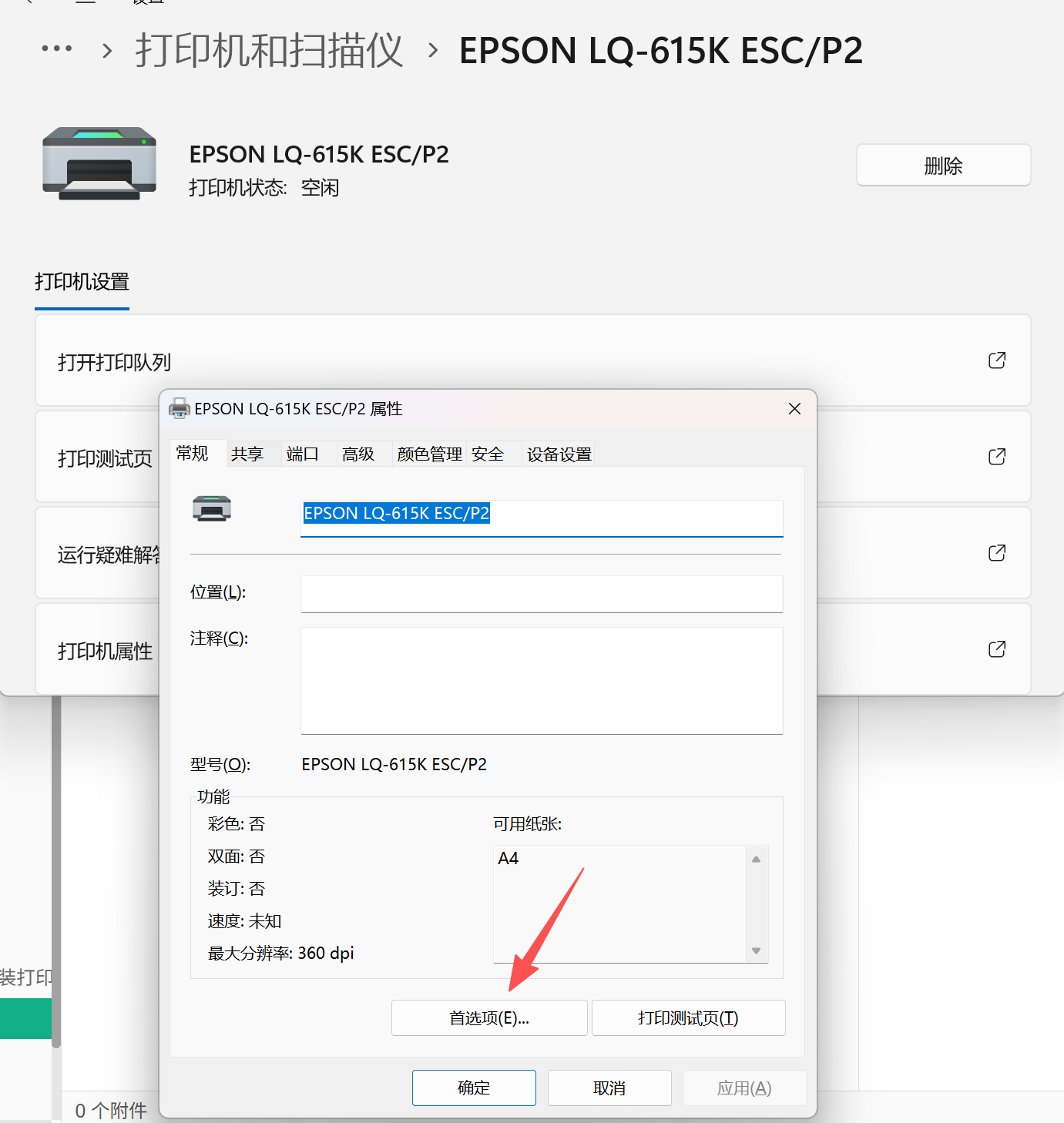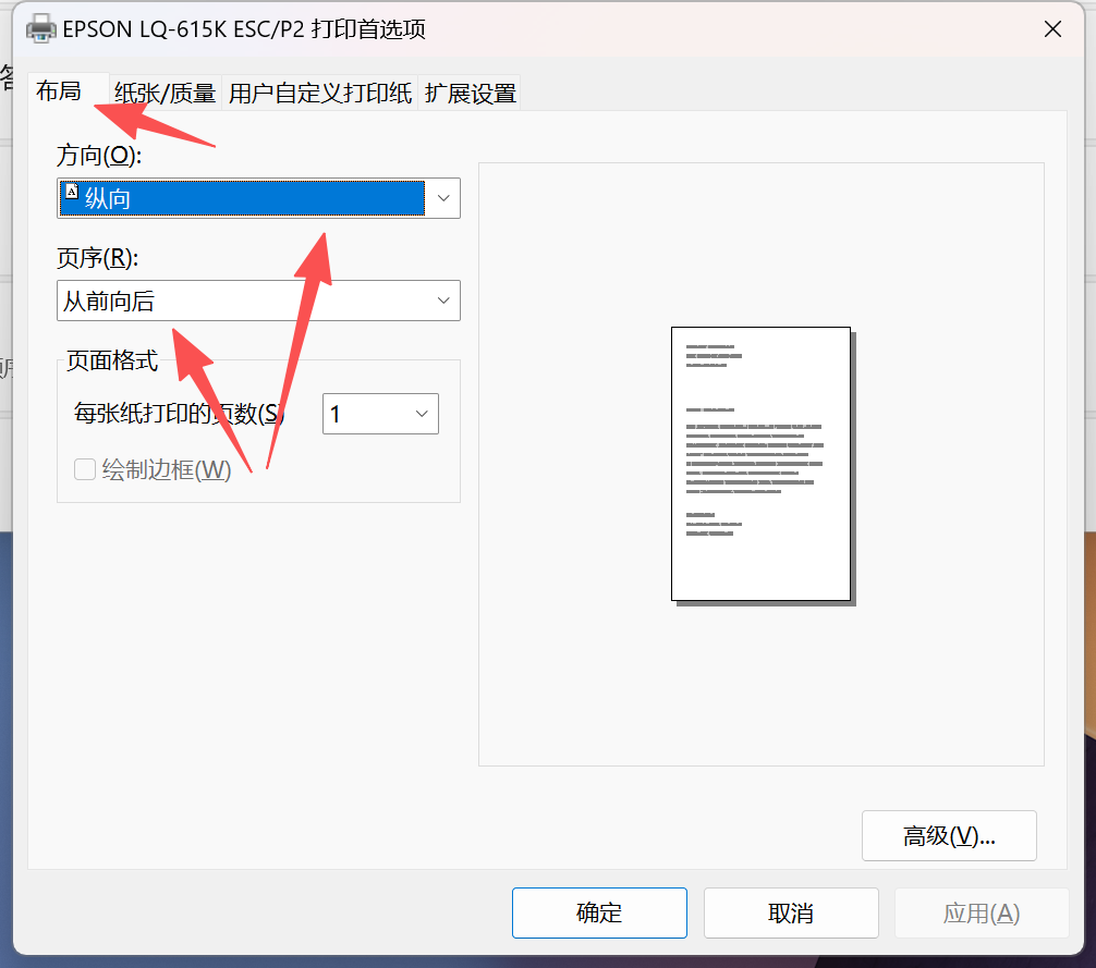 ▲ 在【常规】中配置为纵向打印,以及打印机进纸方向是从前向后