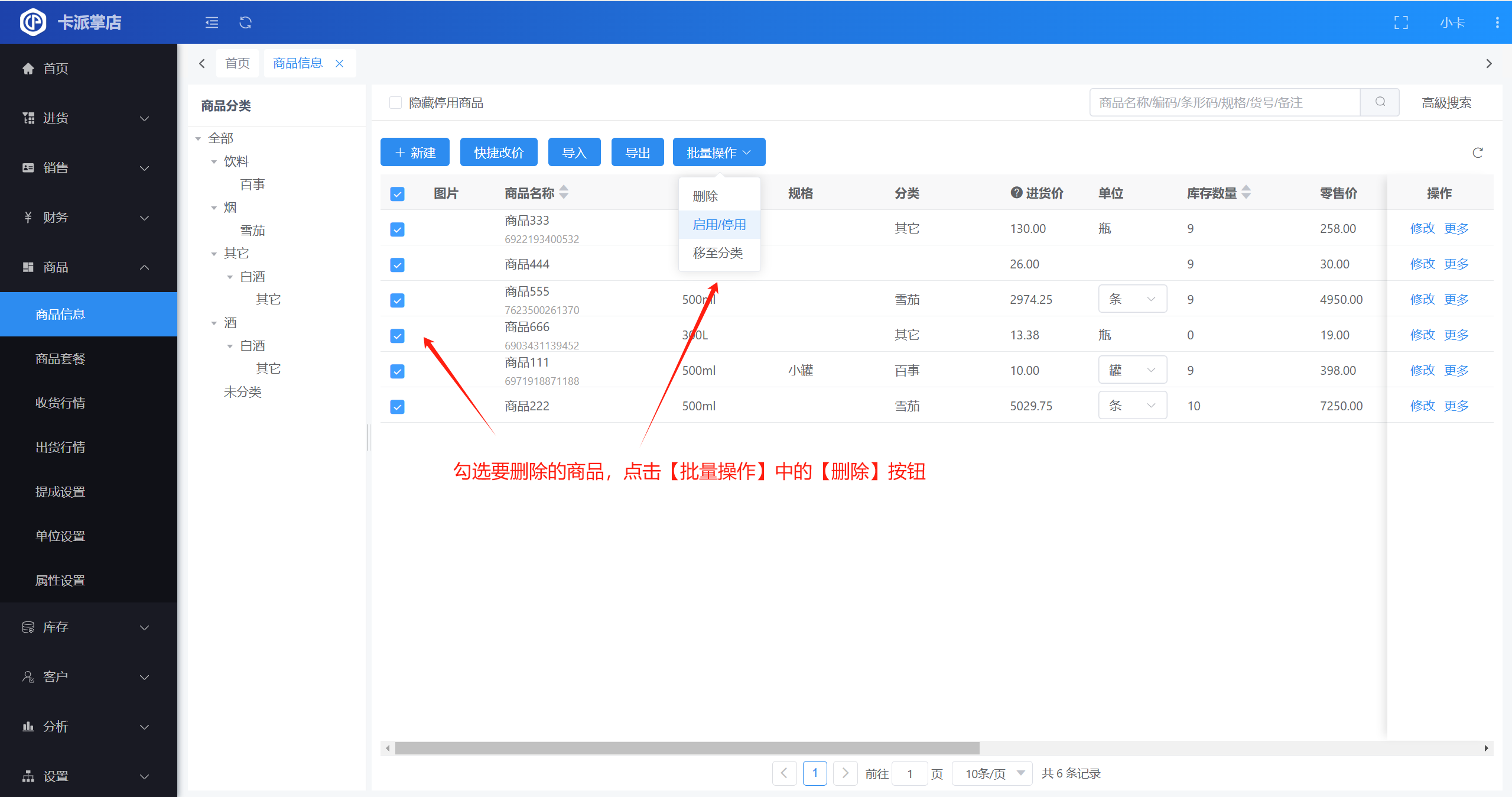 ▲ 勾选要删除的商品,点击【批量操作】中的【删除】按钮