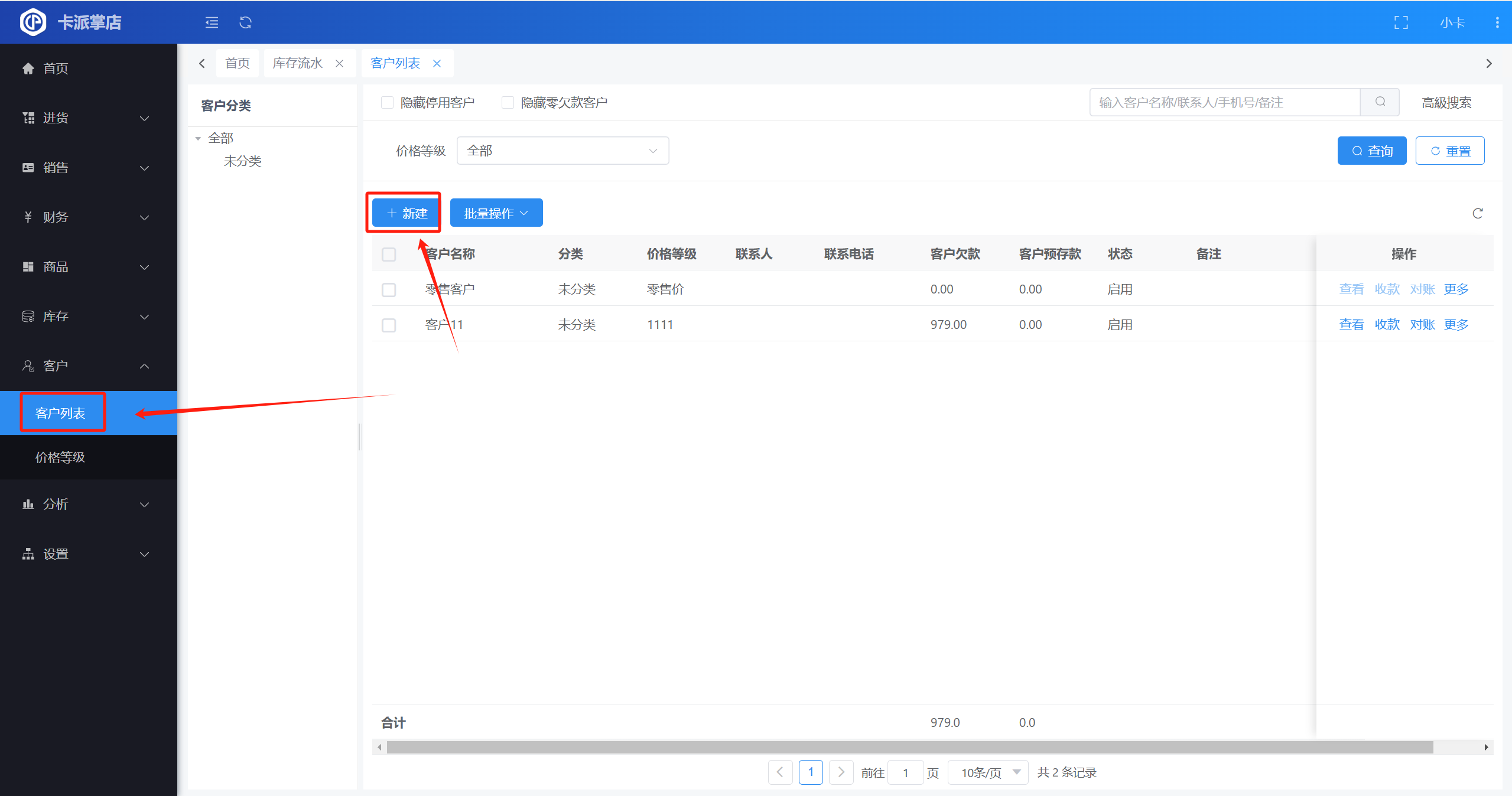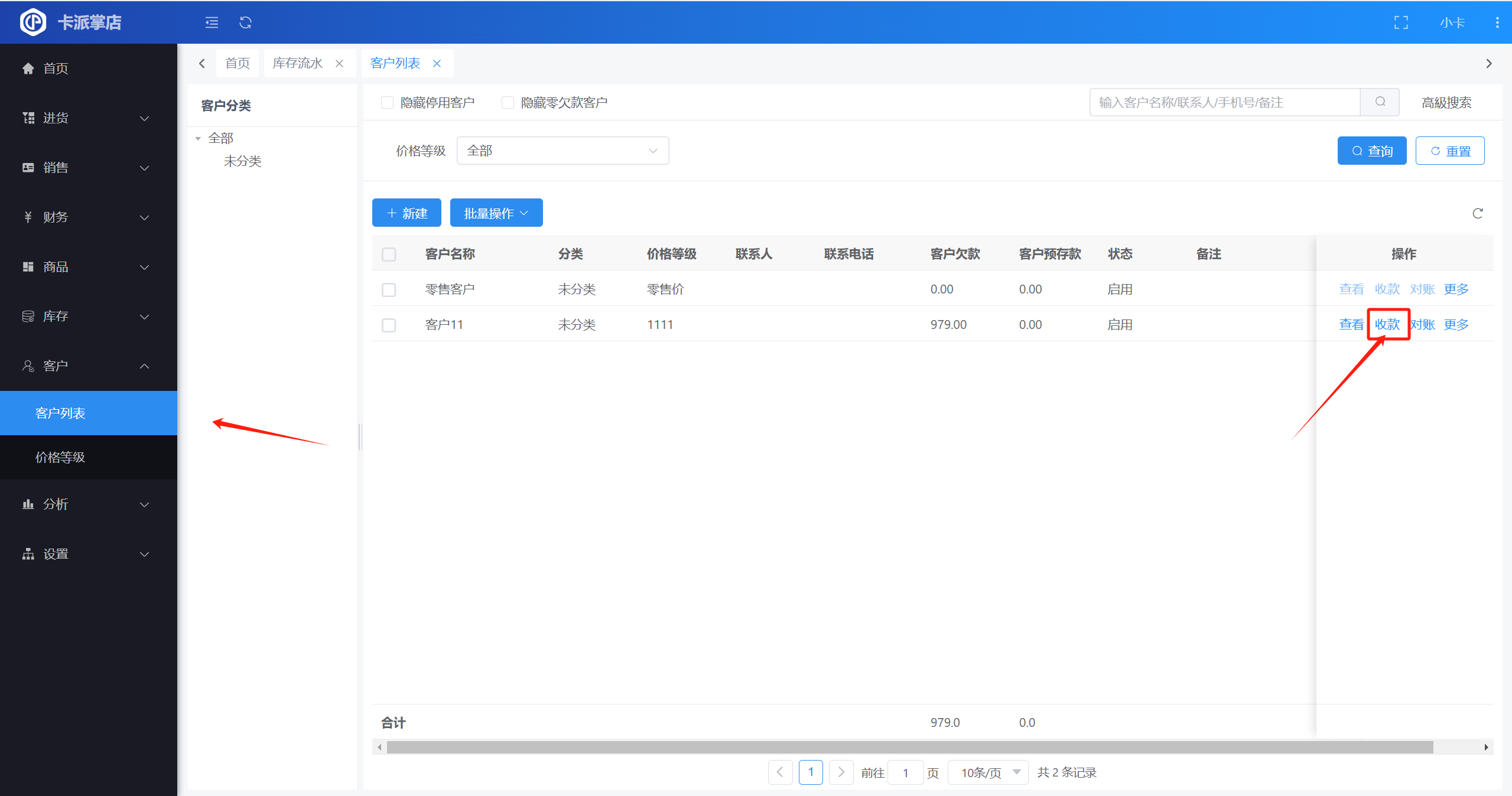当需要向某个客户收应收款的时候,也可以在客户列表进行新增收款单操作