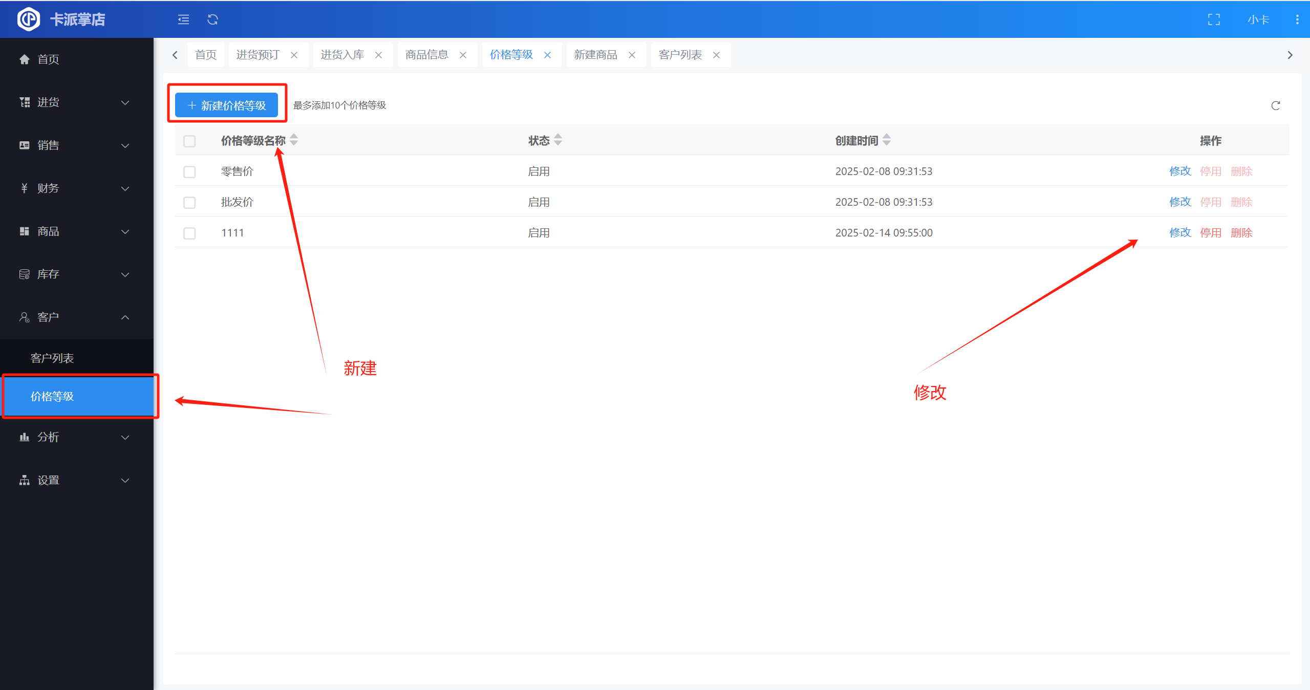 目录 搜索 了解卡派掌店新手指引如何导入原系统的商品及库存如何导入原系统的供应商或客户如何删除导入的数据常见问题导入数据时提示导入失败怎么办全部功能进货进货预订进货入库入错库怎么作废或撤销单据进货退货供应商销售销售预订销售出库没有库存,可以直接销售商品吗销售退货提成明细财务收款付款其它收入其它支出资金流水收支类型资金账户账户转账商品商品信息商品套餐提成设置单位设置属性设置收货行情如何订阅和使用收货行情如何复制订阅的行情表出货行情订阅记录库存库存查询库存盘点库存调拨库存流水库存预警质保期查询客户客户价格等级分析销售统计对账统计设置商户管理门店管理仓库管理角色管理为什么有些菜单或按钮我看不到员工管理打印设置无法打印或者系统提示未安装打印控件打印机默认配置系统设置系统初始化导出记录个人信息 暂无相关搜索结果! 本文档使用 MinDoc 发布 价格等级 商品价格等级是指根据不同销售场景与批量差异,为同一商品设定的多种价格体系,如批发价、零售价、团购价,满足多元交易需求。怎样增加或修改商品的价格管理下的价格等级路径:【客户】-【价格等级】 说明:1、系统默认的零售价和批发价不能删除,只能修改名称。2、其它自定义的价格可以删除,请谨慎删除,删除之后将不可恢复,且客户关联的价格等级将变为零售价 文档更新时间: 2025-02-17 14:33 作者:admin