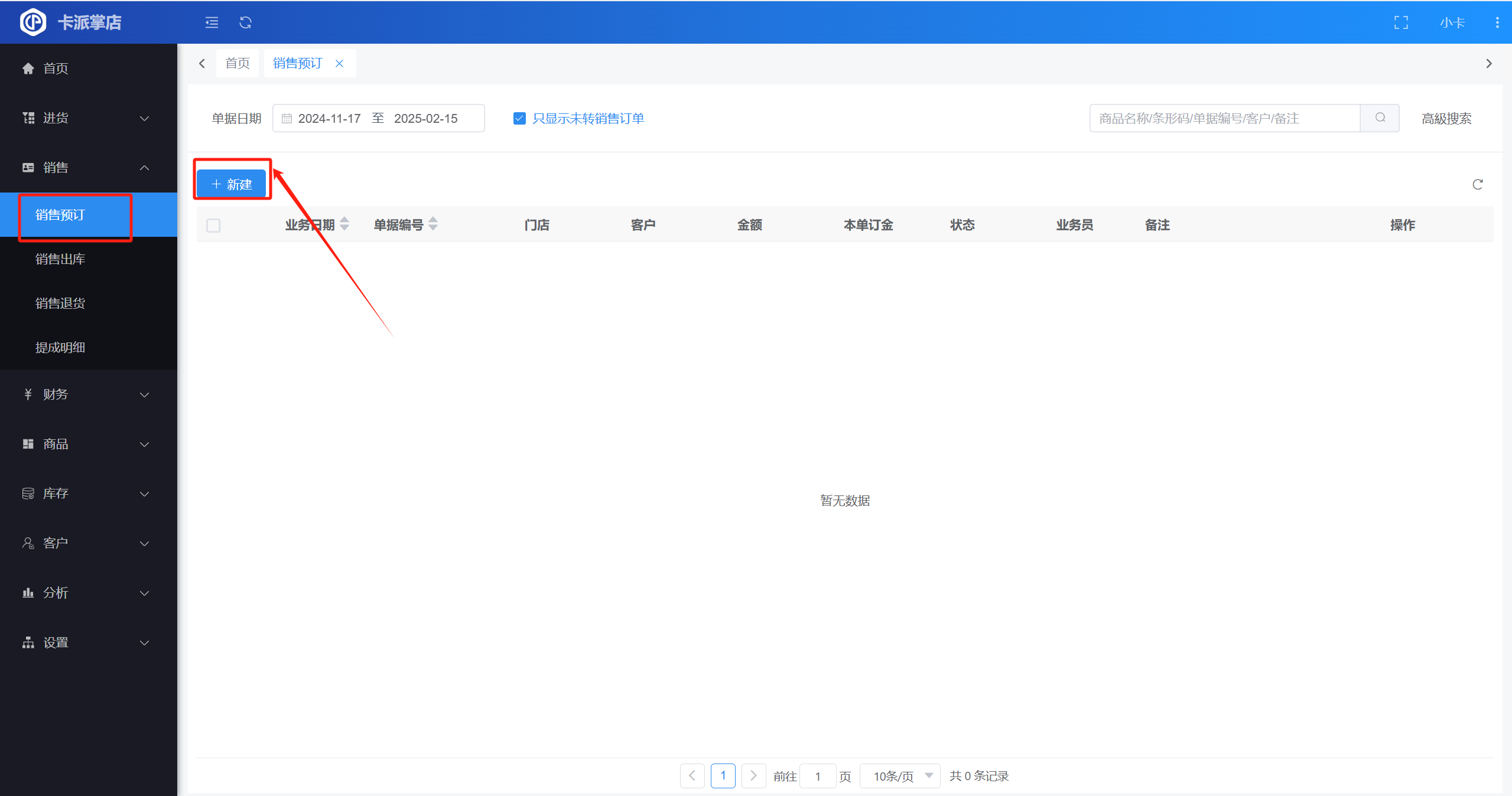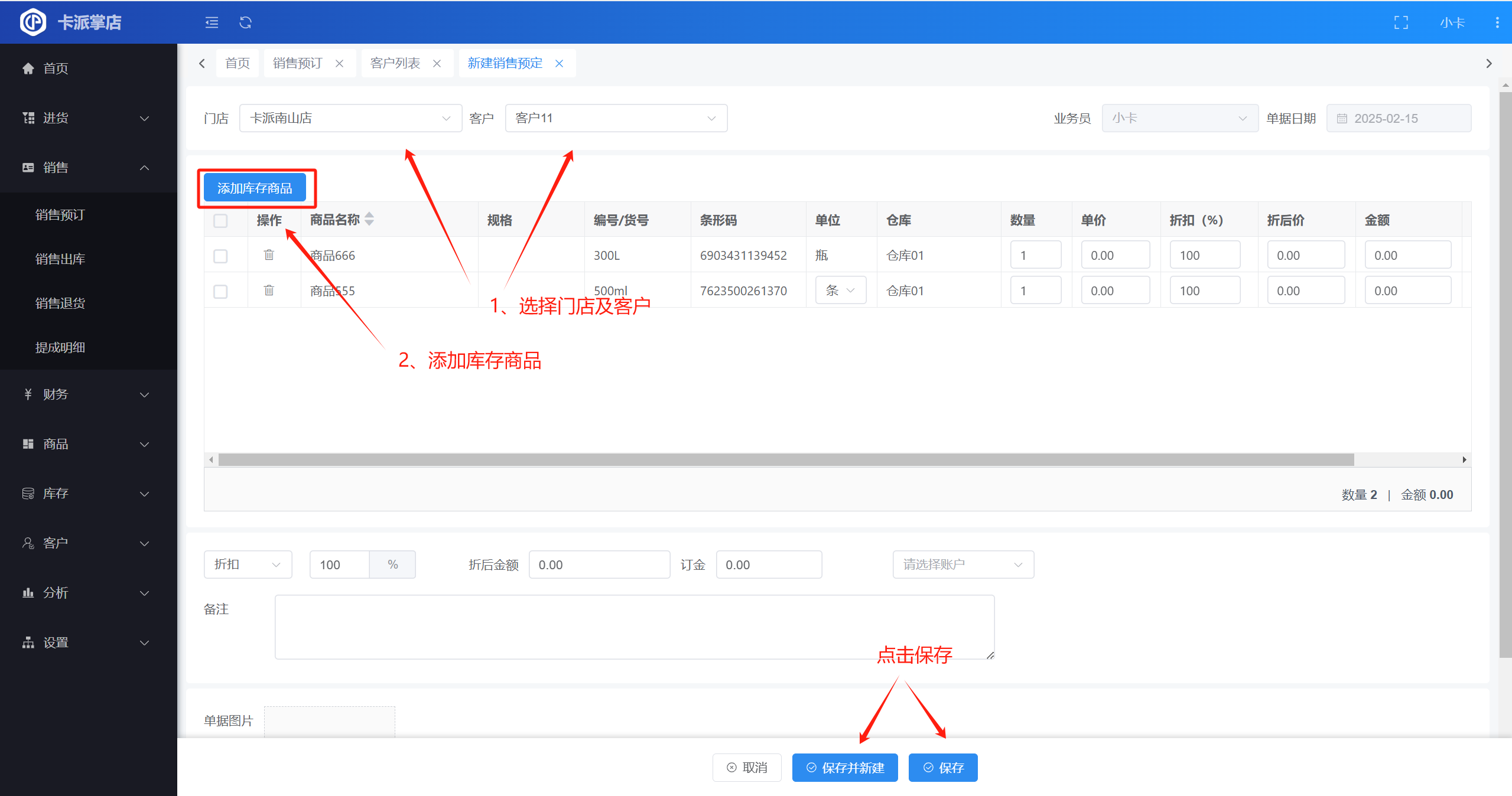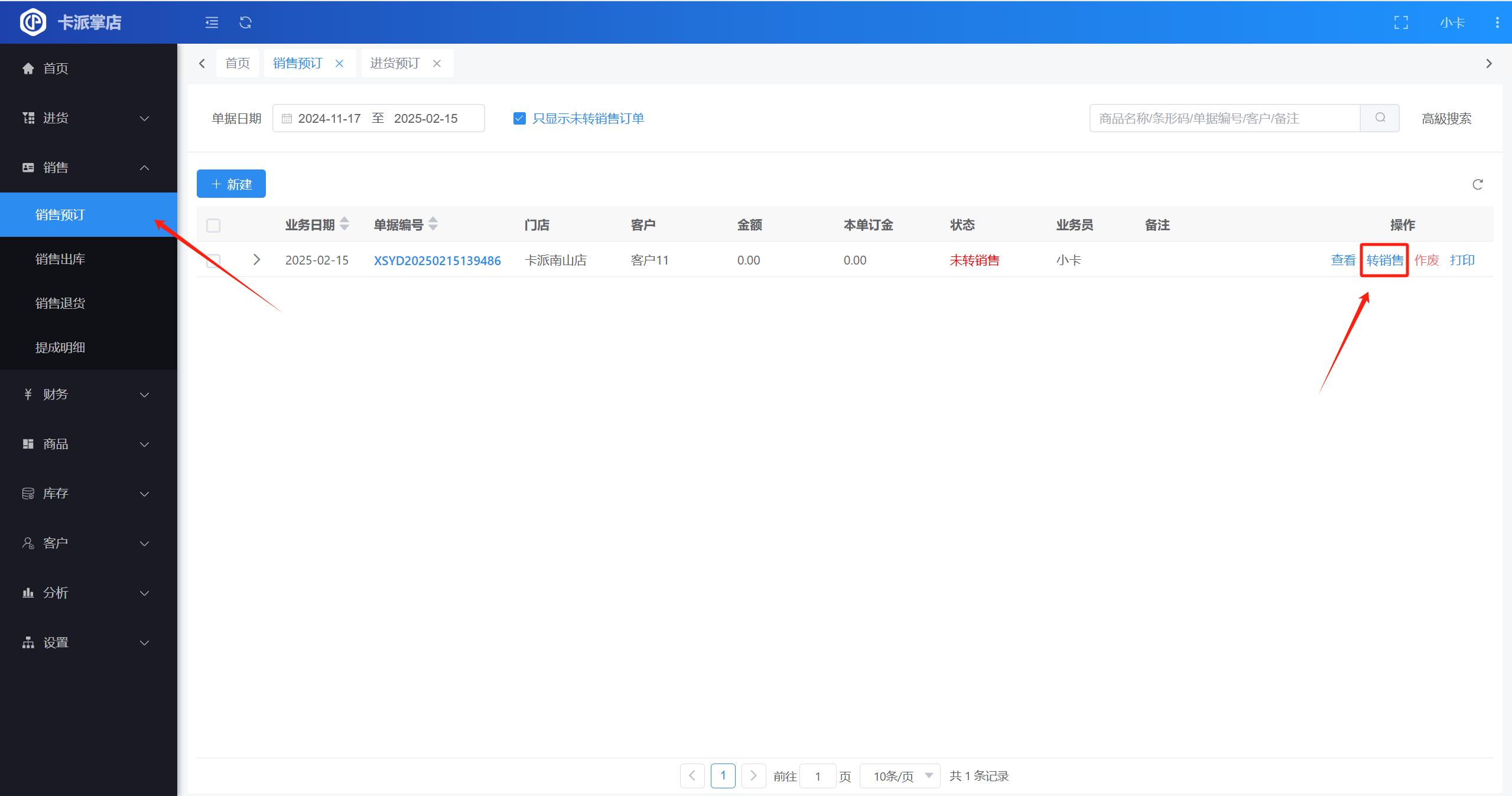 目录 搜索 了解卡派掌店新手指引如何导入原系统的商品及库存如何导入原系统的供应商或客户如何删除导入的数据常见问题导入数据时提示导入失败怎么办全部功能进货进货预订进货入库入错库怎么作废或撤销单据进货退货供应商销售销售预订销售出库没有库存,可以直接销售商品吗销售退货提成明细财务收款付款其它收入其它支出资金流水收支类型资金账户账户转账商品商品信息商品套餐提成设置单位设置属性设置收货行情如何订阅和使用收货行情如何复制订阅的行情表出货行情订阅记录库存库存查询库存盘点库存调拨库存流水库存预警质保期查询客户客户价格等级分析销售统计对账统计设置商户管理门店管理仓库管理角色管理为什么有些菜单或按钮我看不到员工管理打印设置无法打印或者系统提示未安装打印控件打印机默认配置系统设置系统初始化导出记录个人信息 暂无相关搜索结果! 本文档使用 MinDoc 发布 销售预订 新增销售预订单操作路径:【销售】-【销售预订】▲ 点击【新建】按钮 ▲ 在新增的销售预订单中选择库存商品点击保存 说明:1、预订单不支持选择“零售客户”。 销售预订单作废操作路径:【销售】-【销售预订】▲ 在销售预订单列表点击【作废】按钮 销售预订单转成销售出库单操作路径:【销售】-【销售预订】▲ 在销售预订单列表点击【转销售】按钮文档更新时间: 2025-02-15 13:33 作者:admin