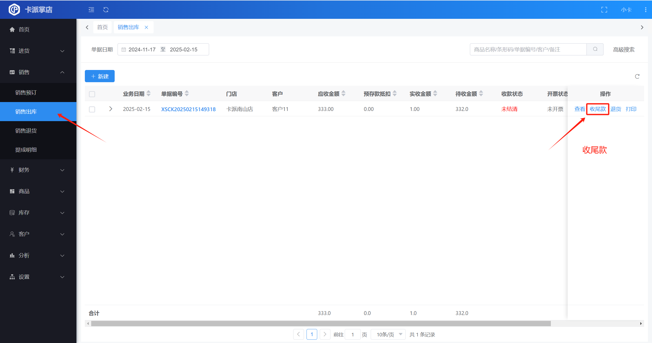 销售出库单收客户尾款
