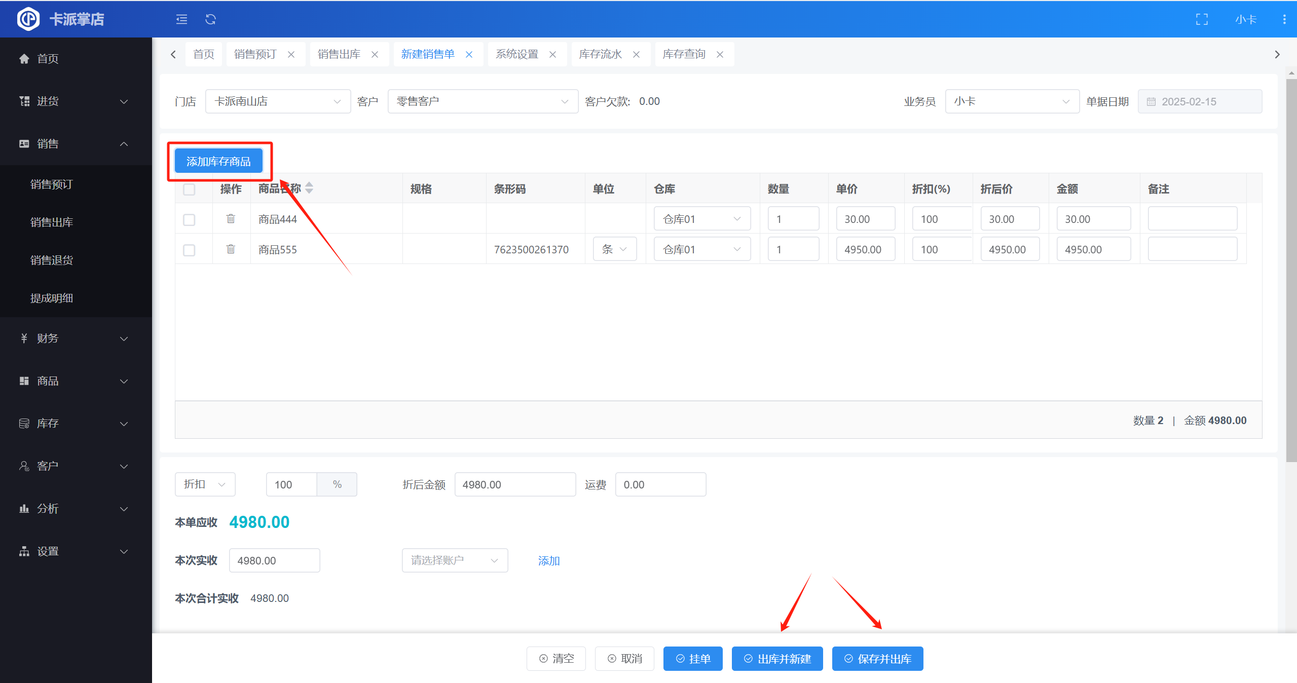 ▲ 在新增的销售出库单中选择商品点击保存,或者直接在新增的销售单中用扫码枪扫商品条码