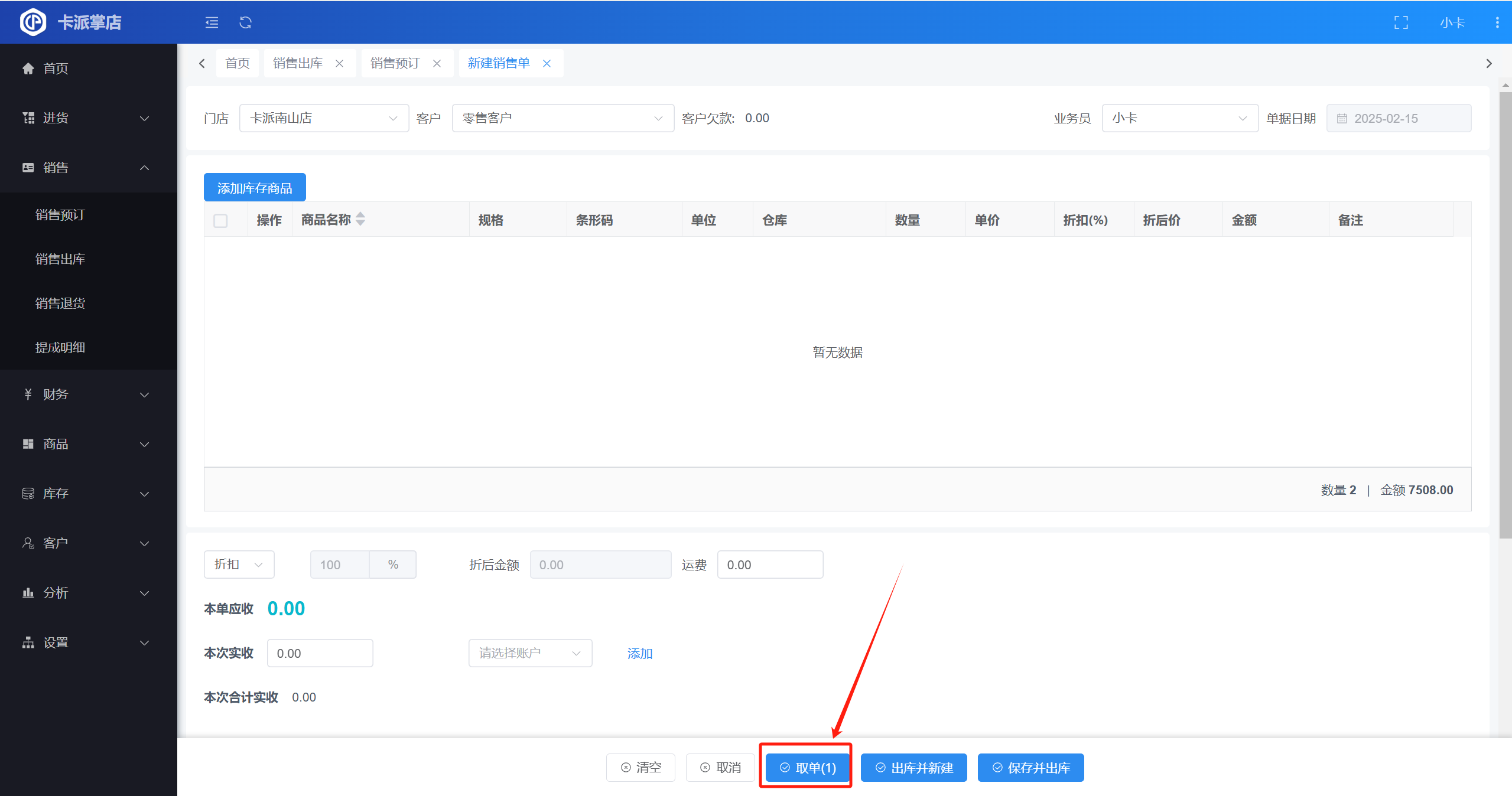 ▲ 方法二:在新增的销售出库单还未添加商品时,可以点击【取单】