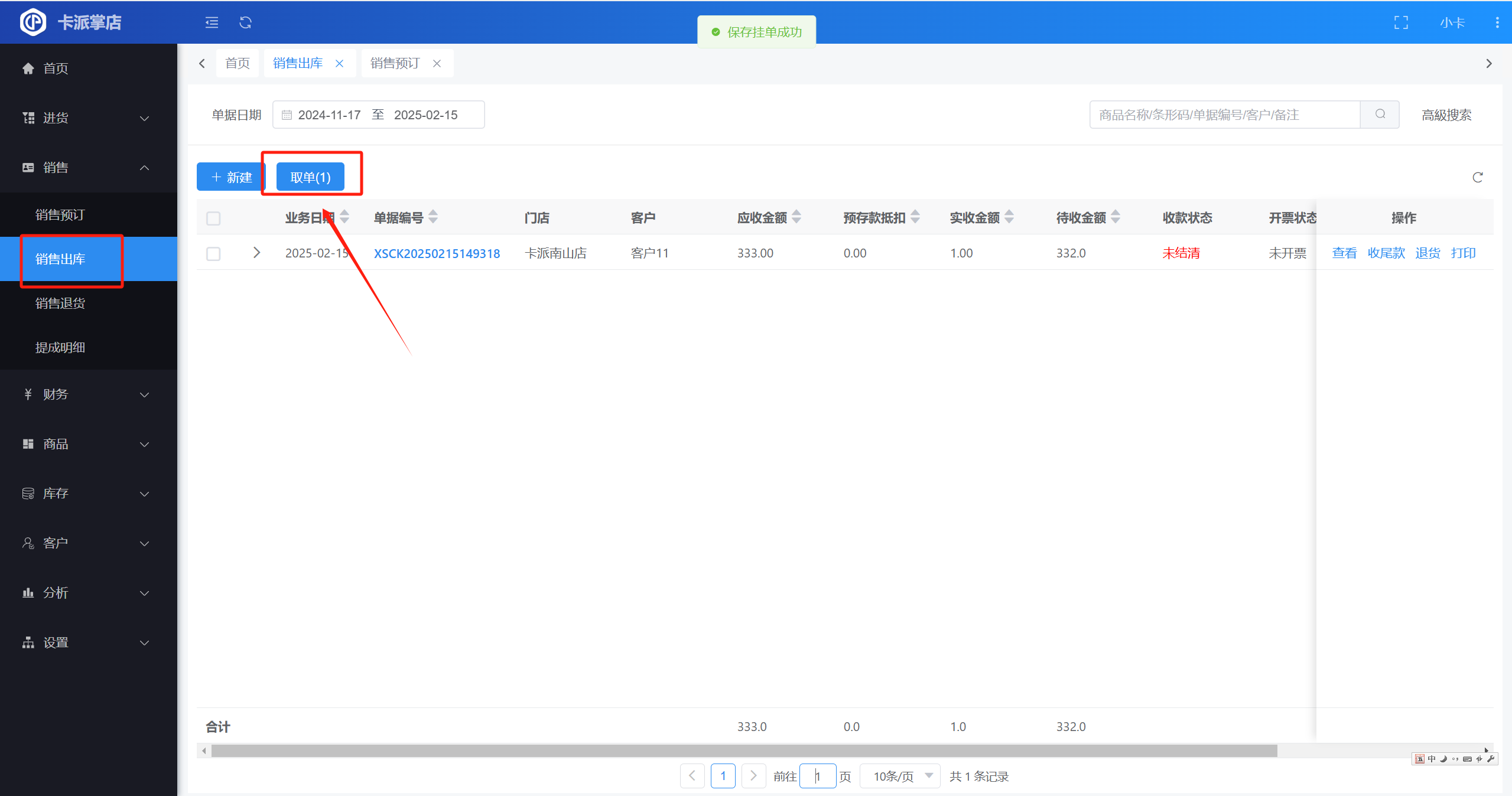 ▲ 方法一:在销售出库单列表点击【取单】