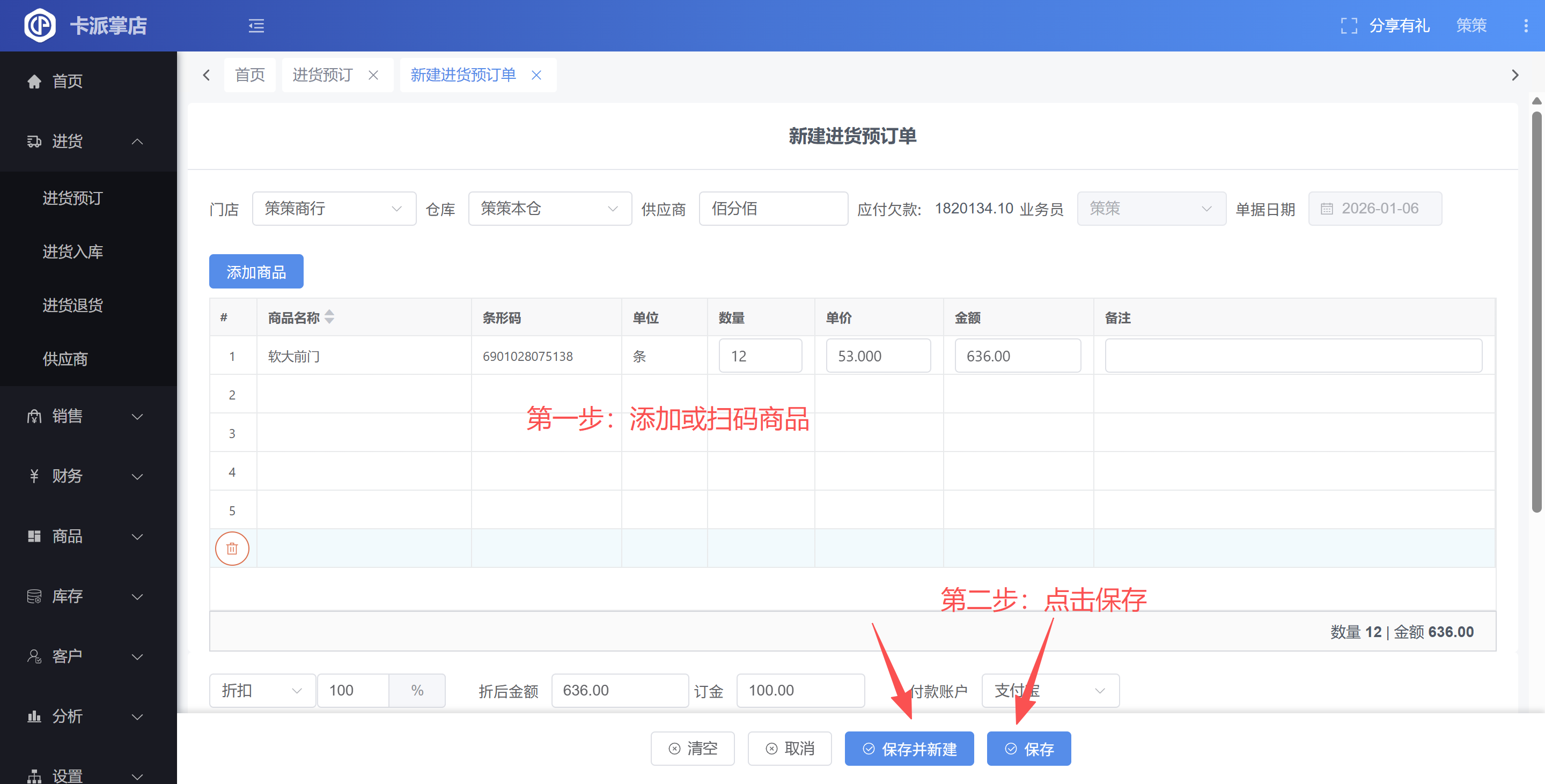 ▲ 在新增的进货预订单中选择商品点击保存