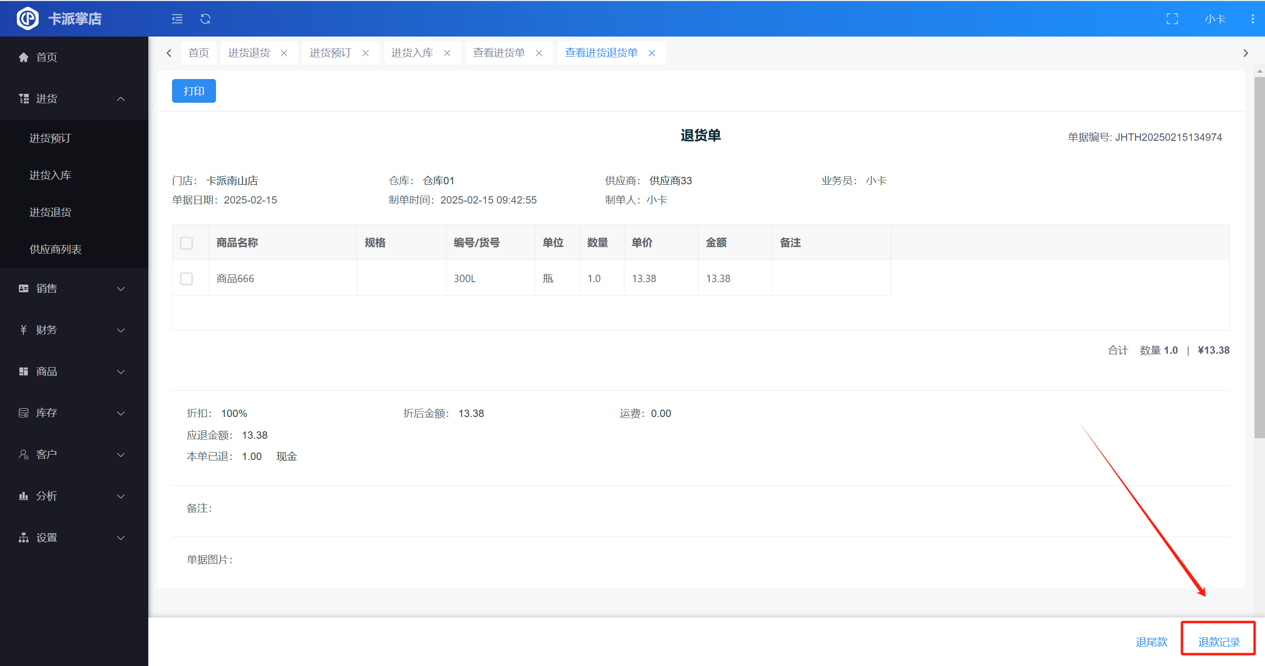 当供应商未能一次性退回商品货款需多笔退款时,则可分多笔记录。