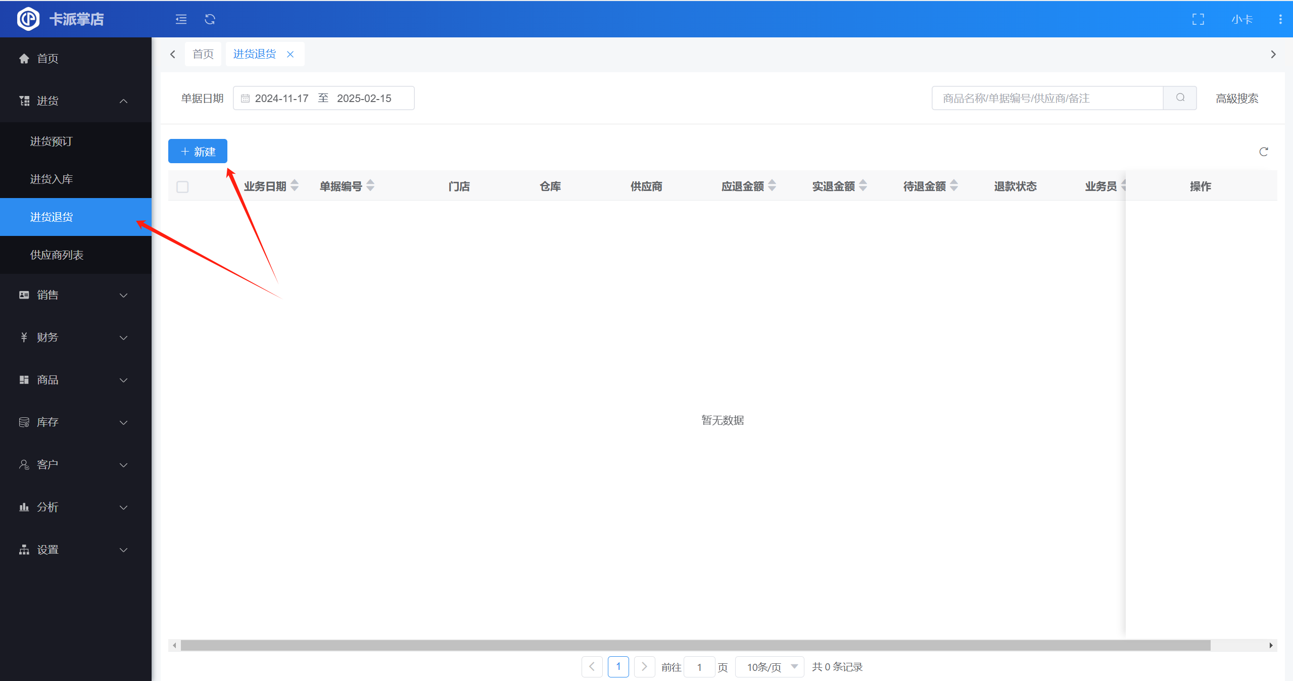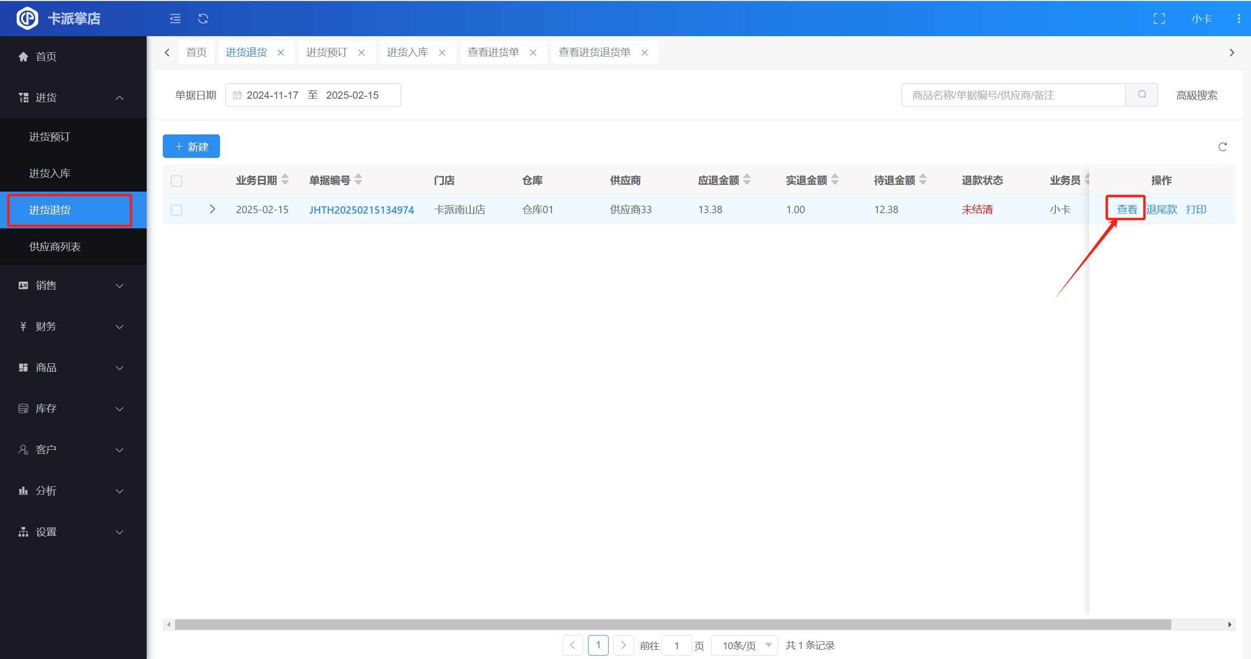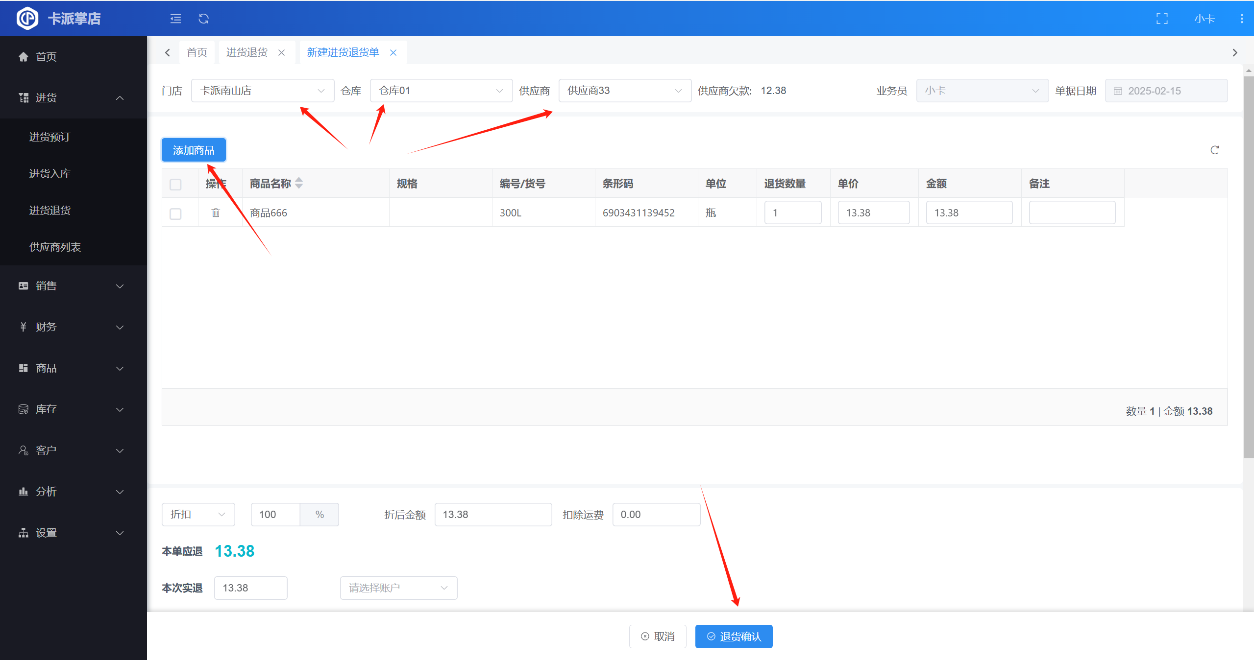 ▲ 在新增的进货退货单中选择商品点击退货确认