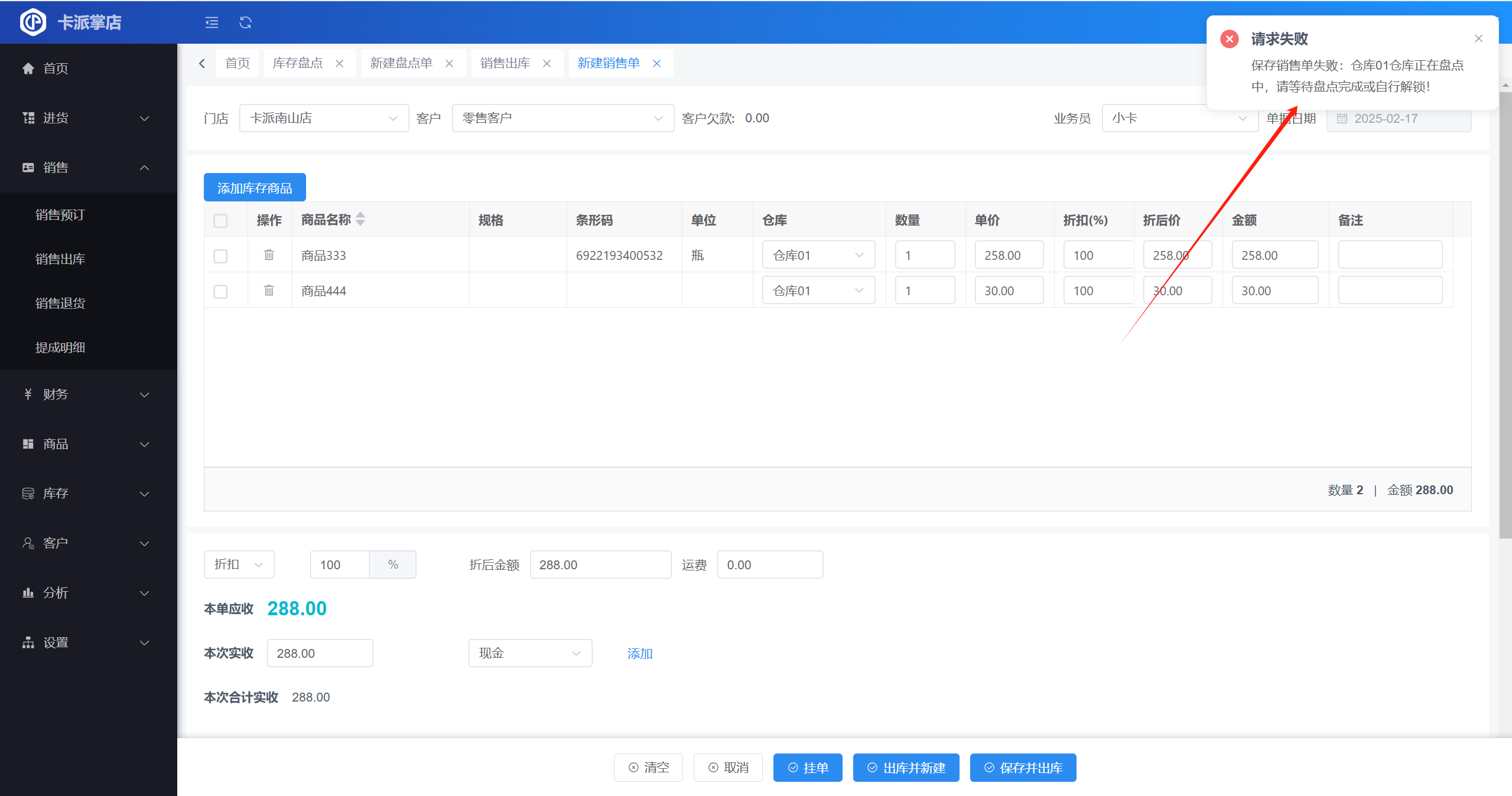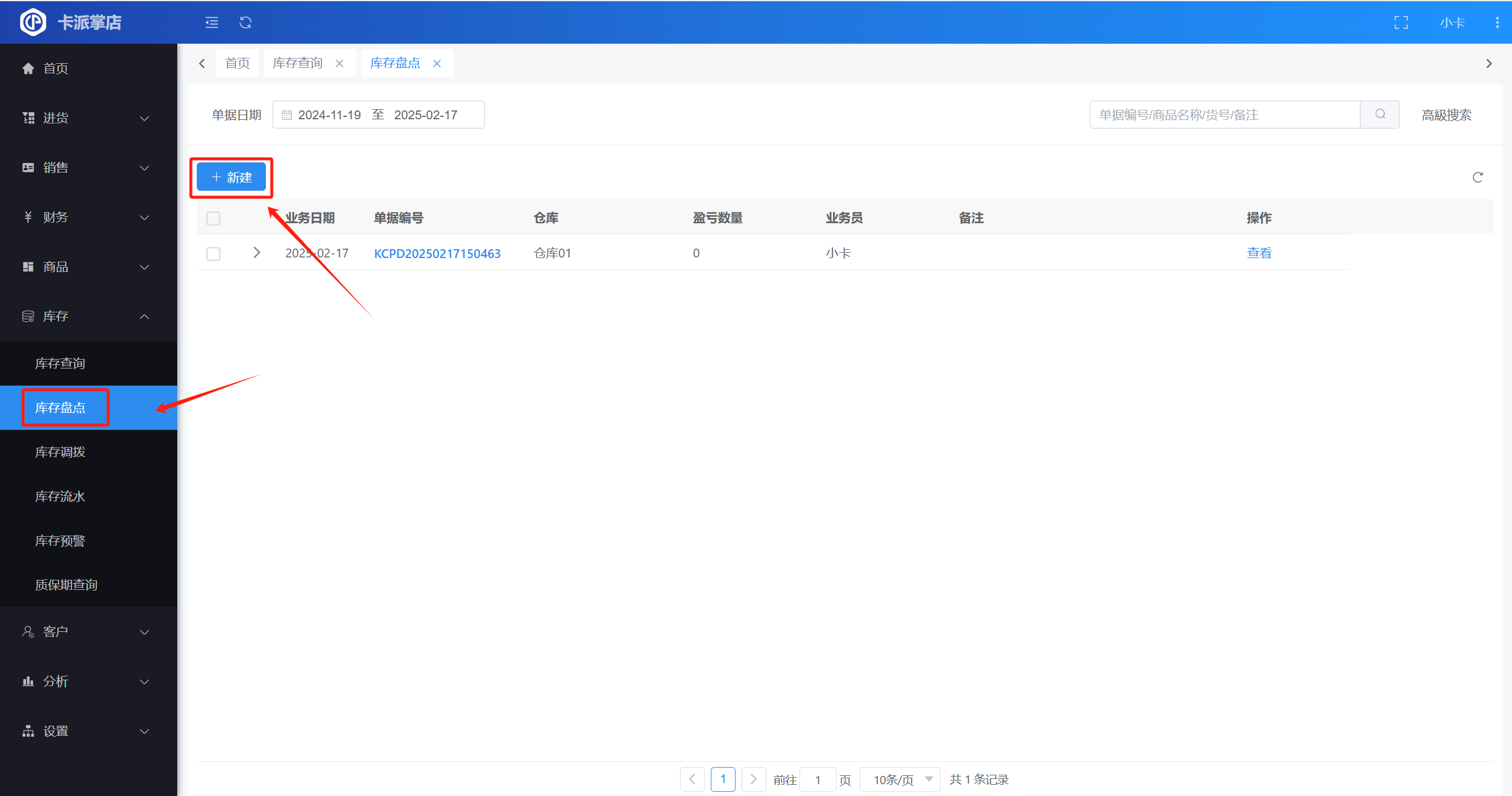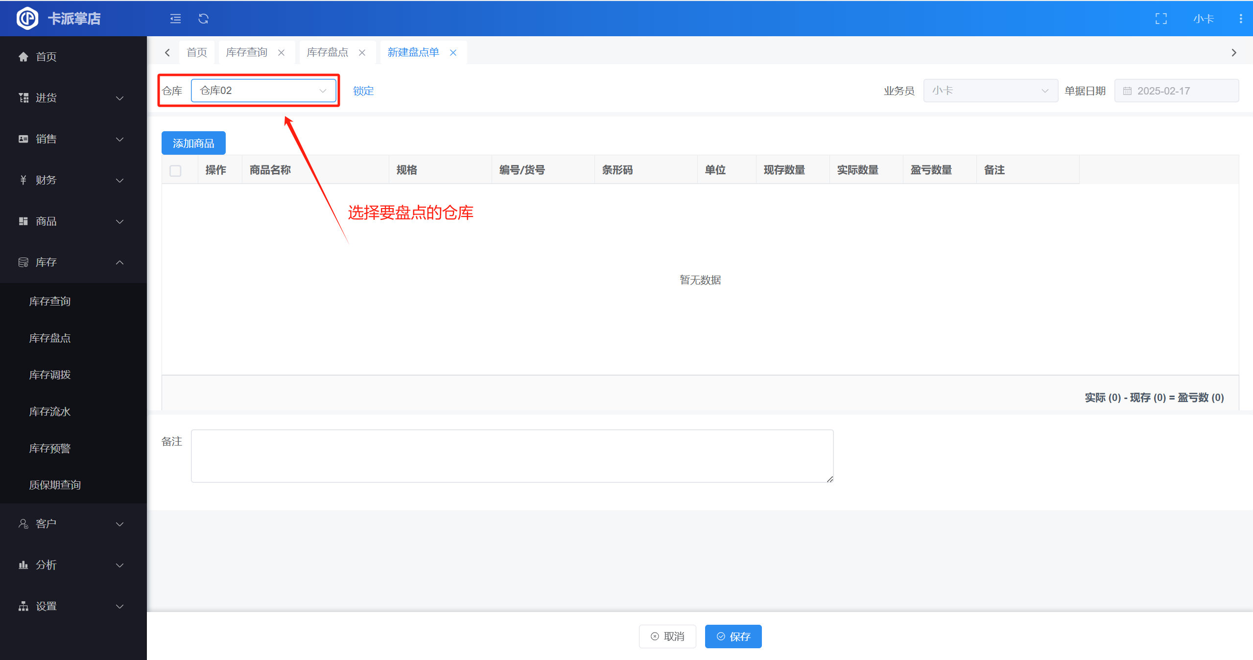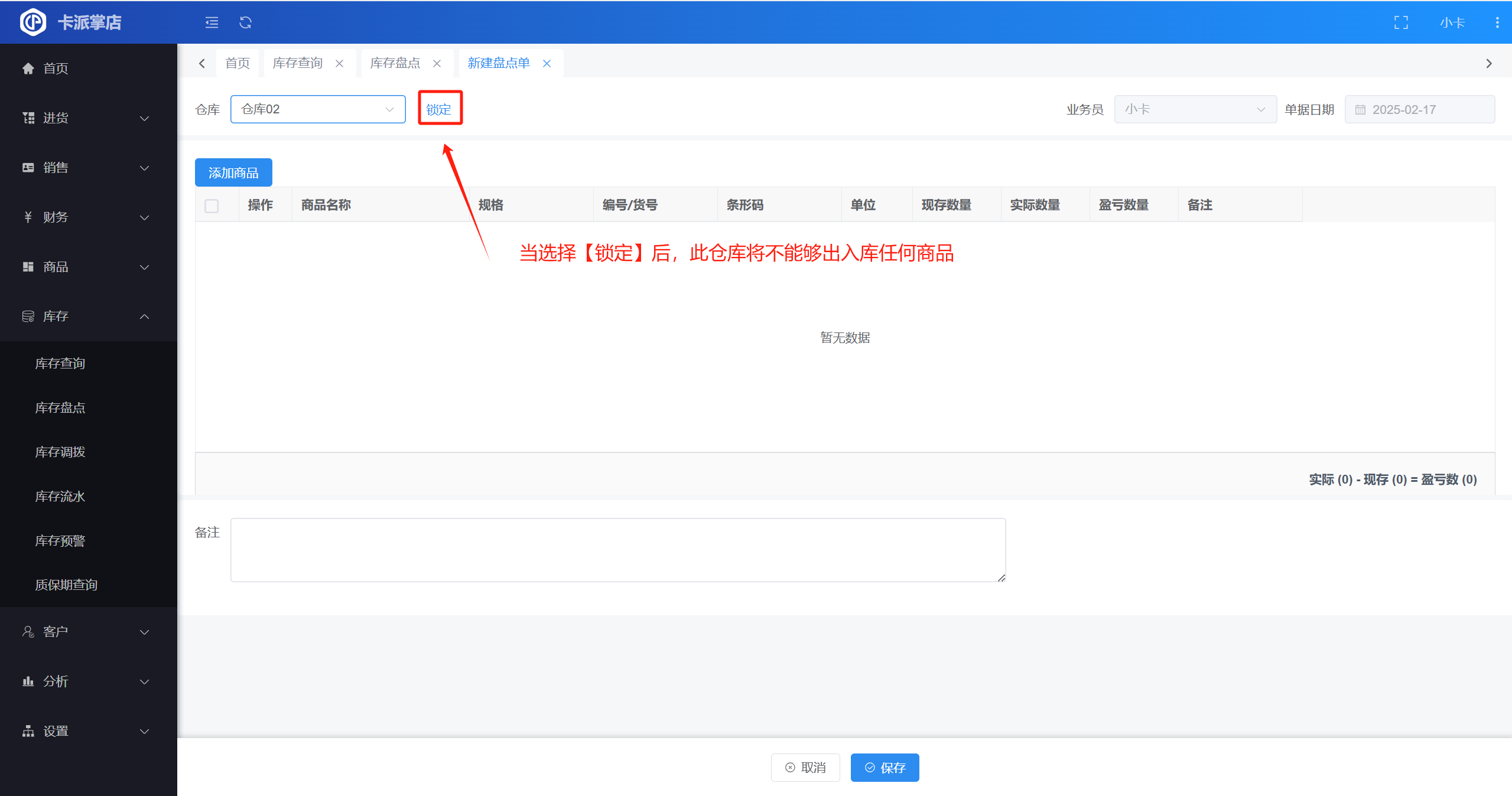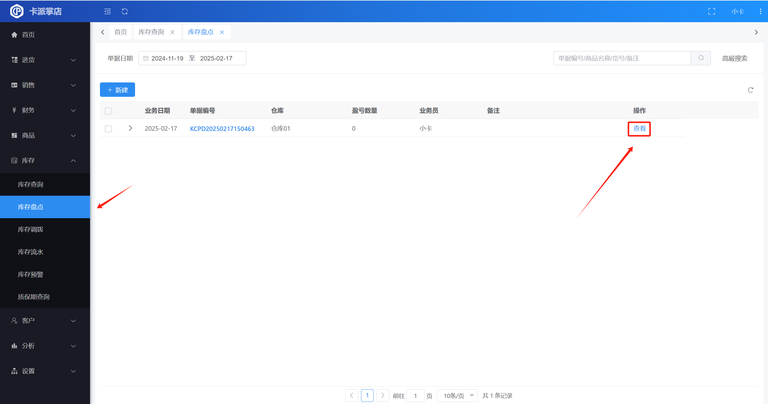目录 搜索 了解卡派掌店新手指引如何导入原系统的商品及库存如何导入原系统的供应商或客户如何删除导入的数据常见问题导入数据时提示导入失败怎么办全部功能进货进货预订进货入库入错库怎么作废或撤销单据进货退货供应商销售销售预订销售出库没有库存,可以直接销售商品吗销售退货提成明细财务收款付款其它收入其它支出资金流水收支类型资金账户账户转账商品商品信息商品套餐提成设置单位设置属性设置收货行情如何订阅和使用收货行情如何复制订阅的行情表出货行情订阅记录库存库存查询库存盘点库存调拨库存流水库存预警质保期查询客户客户价格等级分析销售统计对账统计设置商户管理门店管理仓库管理角色管理为什么有些菜单或按钮我看不到员工管理打印设置无法打印或者系统提示未安装打印控件打印机默认配置系统设置系统初始化导出记录个人信息 暂无相关搜索结果! 本文档使用 MinDoc 发布 库存盘点 新增库存盘点单操作路径:【库存】-【库存盘点】用于对库存物资进行全面清查、计数、核对,精准确定实际库存数量与账面记录是否相符,保障库存数据准确。▲ 点击【新建】按钮 ▲ 选择要盘点的仓库 说明:1、当选择【锁定】盘点的仓库时,此仓库的商品在盘点单完成前,将不能出入库任何商品 ▲ 当选择【锁定】后,此仓库将不能够出入库任何商品▲ 提示不能出库 查看盘点单▲ 点击【查看】按钮文档更新时间: 2025-02-17 14:43 作者:admin