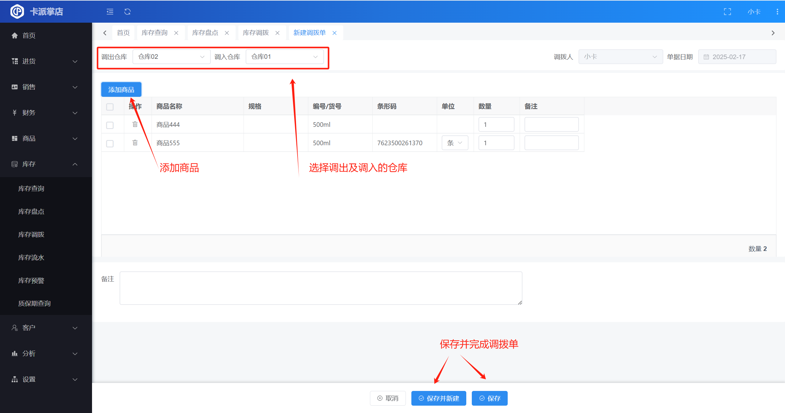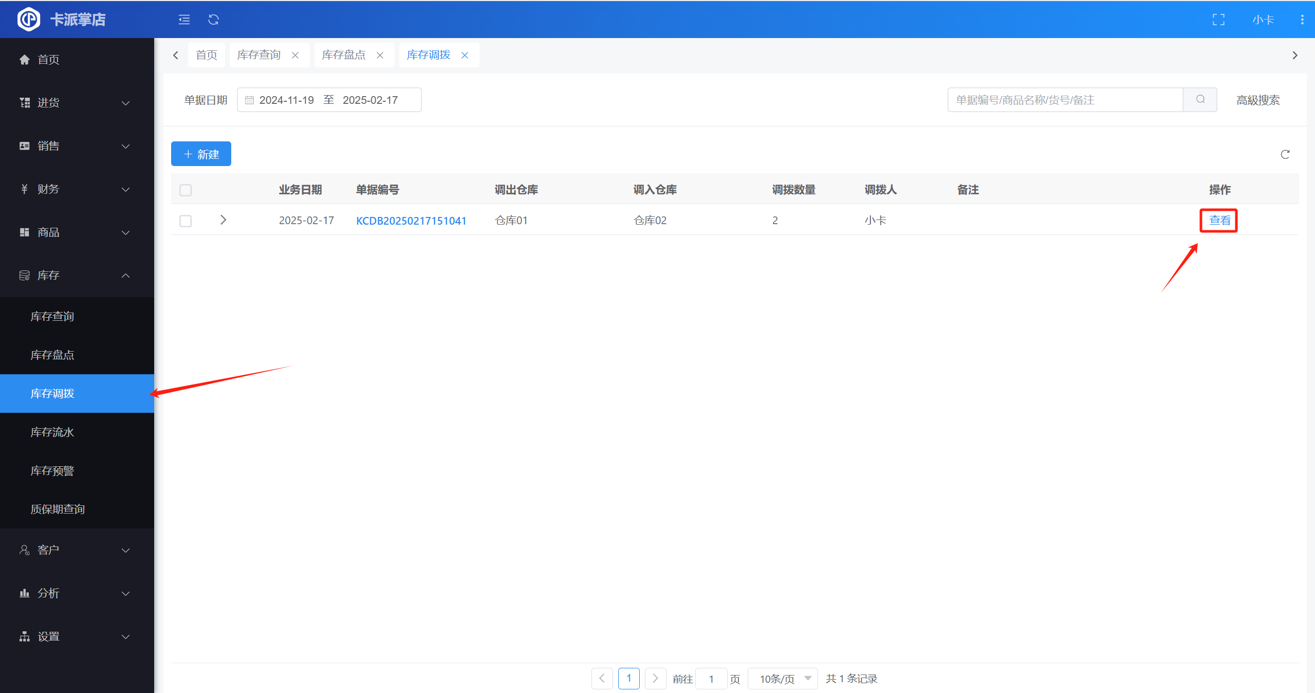 目录 搜索 了解卡派掌店新手指引如何导入原系统的商品及库存如何导入原系统的供应商或客户如何删除导入的数据常见问题导入数据时提示导入失败怎么办全部功能进货进货预订进货入库入错库怎么作废或撤销单据进货退货供应商销售销售预订销售出库没有库存,可以直接销售商品吗销售退货提成明细财务收款付款其它收入其它支出资金流水收支类型资金账户账户转账商品商品信息商品套餐提成设置单位设置属性设置收货行情如何订阅和使用收货行情如何复制订阅的行情表出货行情订阅记录库存库存查询库存盘点库存调拨库存流水库存预警质保期查询客户客户价格等级分析销售统计对账统计设置商户管理门店管理仓库管理角色管理为什么有些菜单或按钮我看不到员工管理打印设置无法打印或者系统提示未安装打印控件打印机默认配置系统设置系统初始化导出记录个人信息 暂无相关搜索结果! 本文档使用 MinDoc 发布 库存调拨 新增库存调拨单操作路径:【库存】-【库存调拨】商户可在内部不同仓库间按需转移商品数量,灵活调整库存分布,以优化资源配置,满足运营需求。▲ 点击【新建】按钮 查看调拨单商户可在内部不同仓库间按需转移商品数量,灵活调整库存分布,以优化资源配置,满足运营需求。▲ 点击【查看】按钮文档更新时间: 2025-02-17 14:46 作者:admin