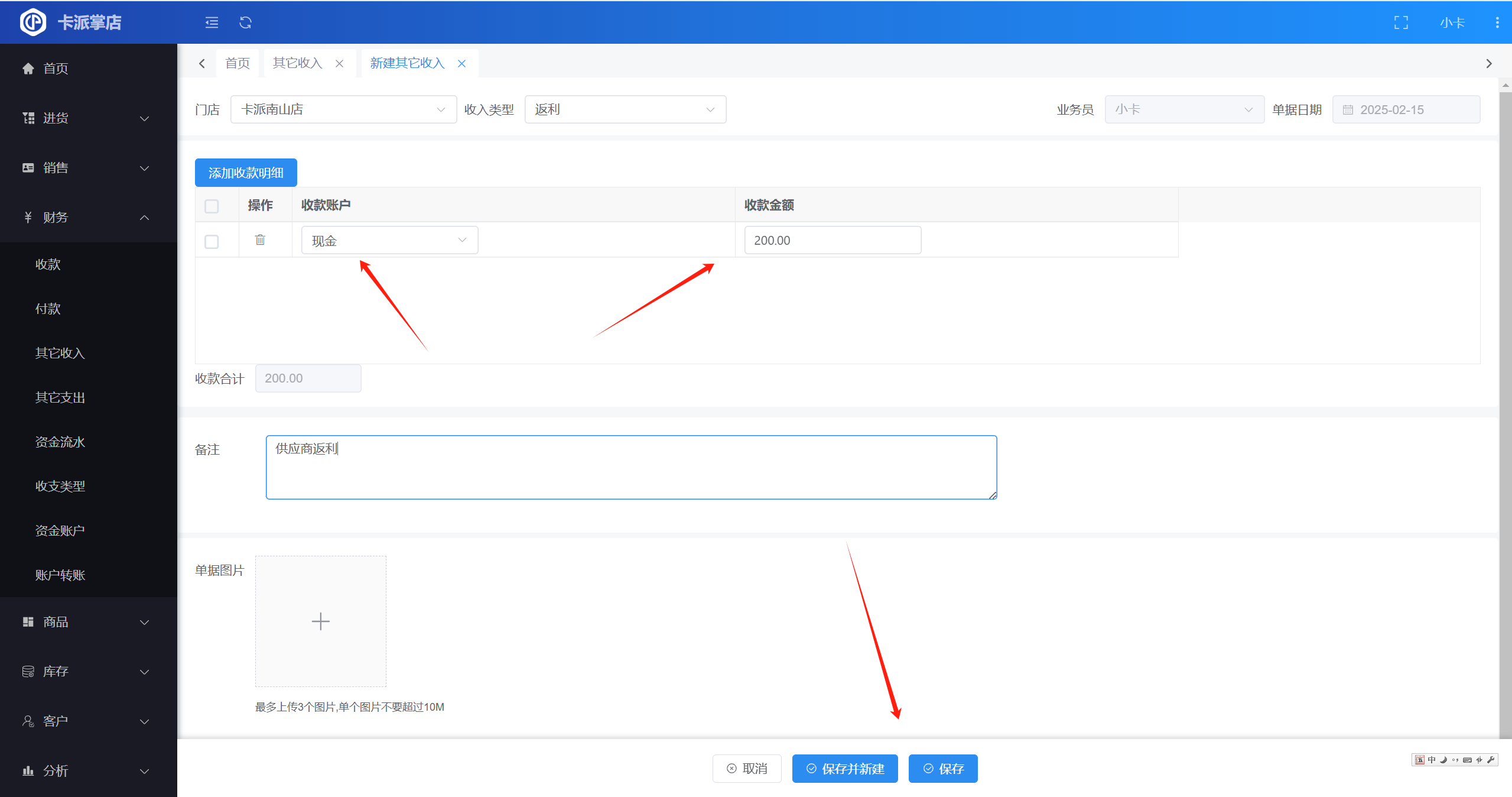 目录 搜索 了解卡派掌店新手指引如何导入原系统的商品及库存如何导入原系统的供应商或客户如何删除导入的数据常见问题导入数据时提示导入失败怎么办全部功能进货进货预订进货入库入错库怎么作废或撤销单据进货退货供应商销售销售预订销售出库没有库存,可以直接销售商品吗销售退货提成明细财务收款付款其它收入其它支出资金流水收支类型资金账户账户转账商品商品信息商品套餐提成设置单位设置属性设置收货行情如何订阅和使用收货行情如何复制订阅的行情表出货行情订阅记录库存库存查询库存盘点库存调拨库存流水库存预警质保期查询客户客户价格等级分析销售统计对账统计设置商户管理门店管理仓库管理角色管理为什么有些菜单或按钮我看不到员工管理打印设置无法打印或者系统提示未安装打印控件打印机默认配置系统设置系统初始化导出记录个人信息 暂无相关搜索结果! 本文档使用 MinDoc 发布 其它收入 新增其它收入单操作路径:【财务】-【其它收入】其他收入指商户经营活动外产生的收益,包括返利、废旧物资处置等非经常性所得。▲ 点击【新建】按钮 ▲ 输入其它收入的相关信息后点击保存 说明:1、收入类型可以在【财务】-【收支类型】中进行新增或修改 文档更新时间: 2025-02-15 15:12 作者:admin