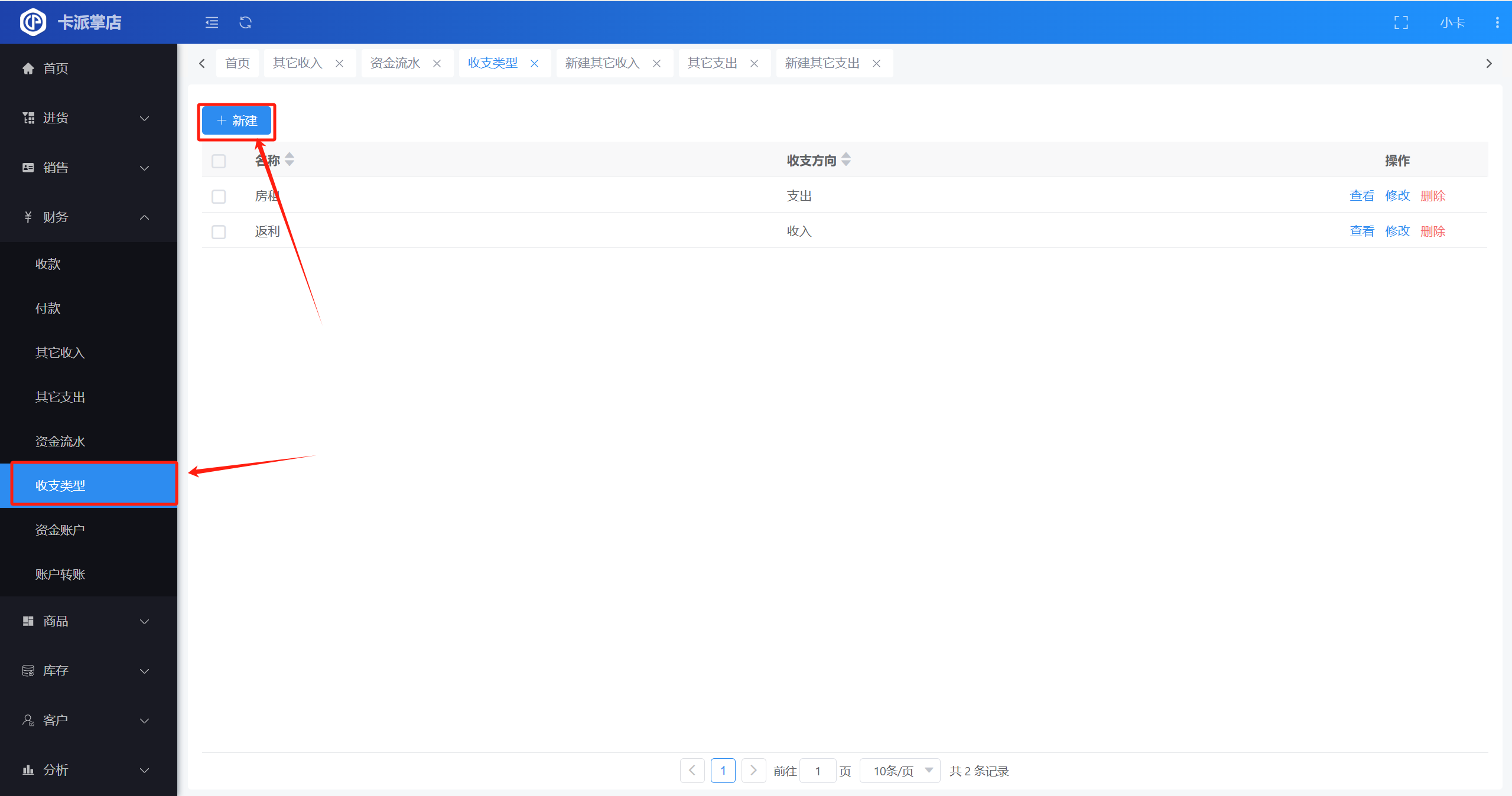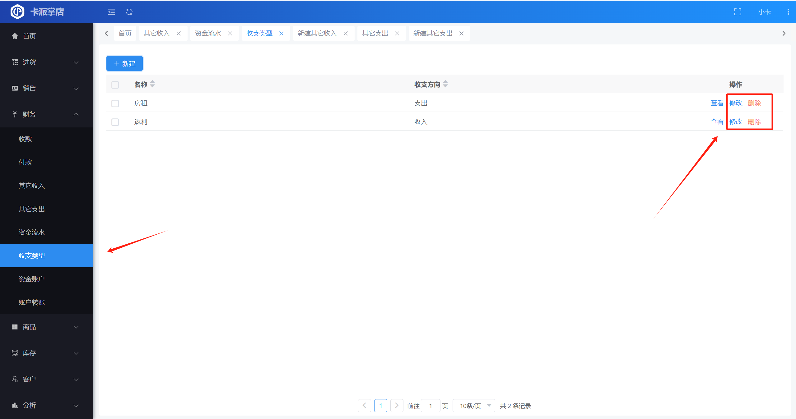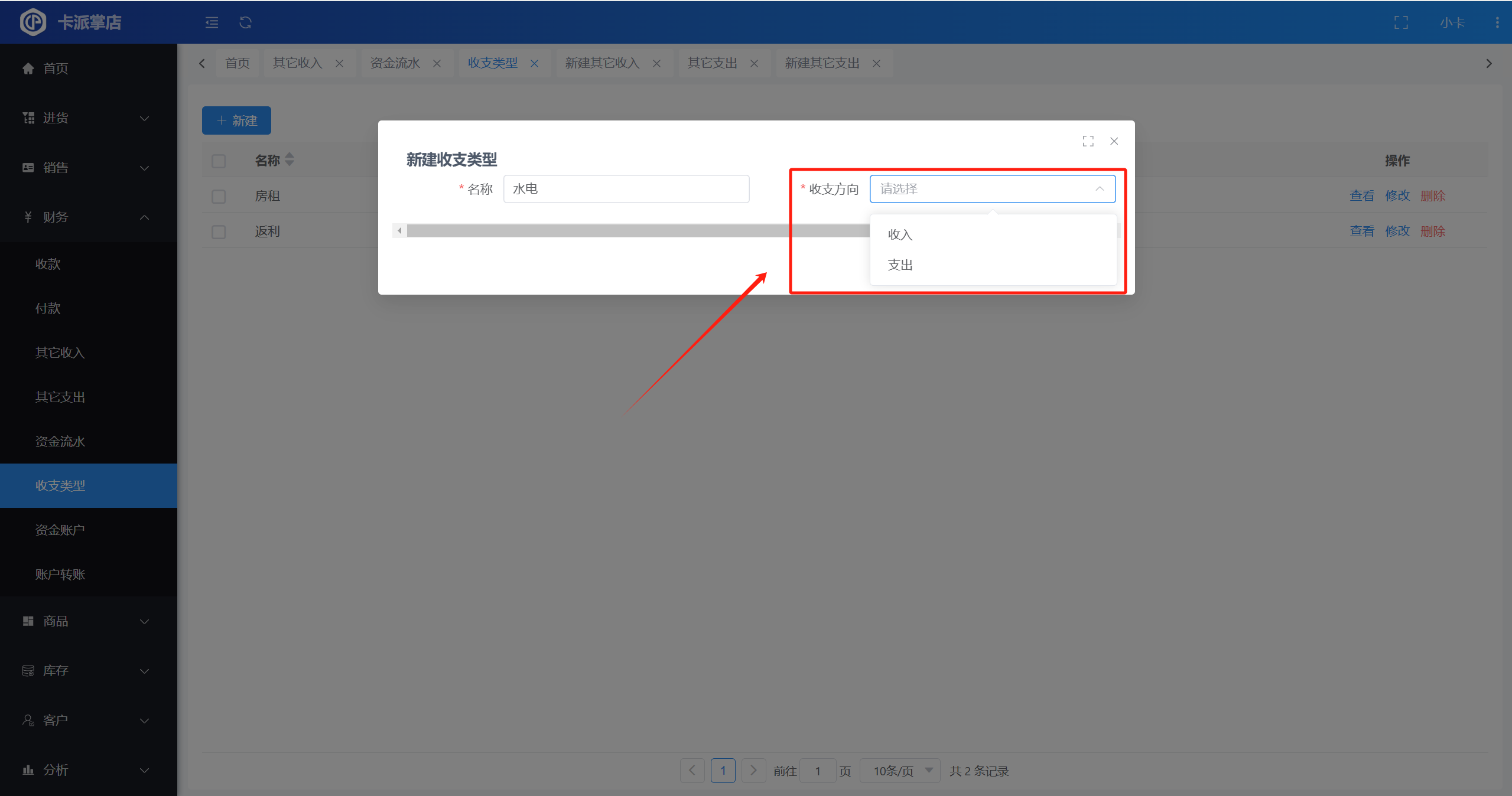 新增收支类型操作路径:【财务】-【收支类型】 ▲ 选择收支的方向,选择收入将在新增其它收入单时使用,选择支出将在新增其它支出单时使用 修改、删除收支类型操作路径:【财务】-【收支类型】文档更新时间: 2025-02-15 15:25 作者:admin