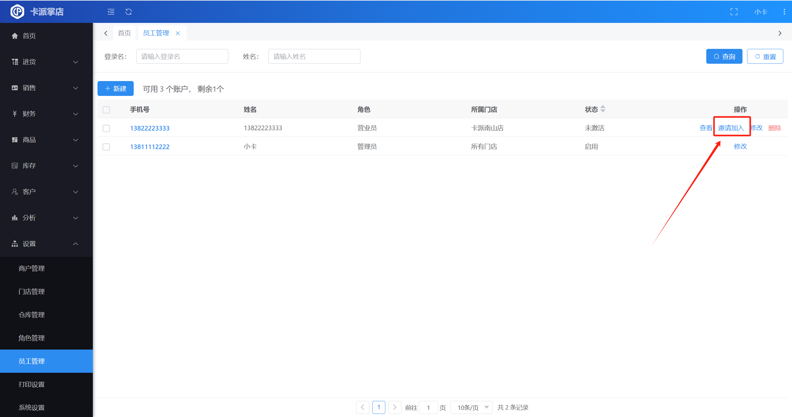 目录 搜索 了解卡派掌店新手指引如何导入原系统的商品及库存如何导入原系统的供应商或客户如何删除导入的数据常见问题导入数据时提示导入失败怎么办全部功能进货进货预订进货入库入错库怎么作废或撤销单据进货退货供应商销售销售预订销售出库没有库存,可以直接销售商品吗销售退货提成明细财务收款付款其它收入其它支出资金流水收支类型资金账户账户转账商品商品信息商品套餐提成设置单位设置属性设置收货行情如何订阅和使用收货行情如何复制订阅的行情表出货行情订阅记录库存库存查询库存盘点库存调拨库存流水库存预警质保期查询客户客户价格等级分析销售统计对账统计设置商户管理门店管理仓库管理角色管理为什么有些菜单或按钮我看不到员工管理打印设置无法打印或者系统提示未安装打印控件打印机默认配置系统设置系统初始化导出记录个人信息 暂无相关搜索结果! 本文档使用 MinDoc 发布 员工管理 新增员工操作路径:【设置】-【员工管理】▲ 点击【新建】按钮 ▲ 点击【邀请加入】按钮,让职员扫二维码操作加入 修改员工▲ 点击【修改】按钮 说明:1、系统默认的老板角色不能删除,只能修改姓名。2、职员删除后,相关的单据信息不会被删除 文档更新时间: 2025-02-19 09:48 作者:admin