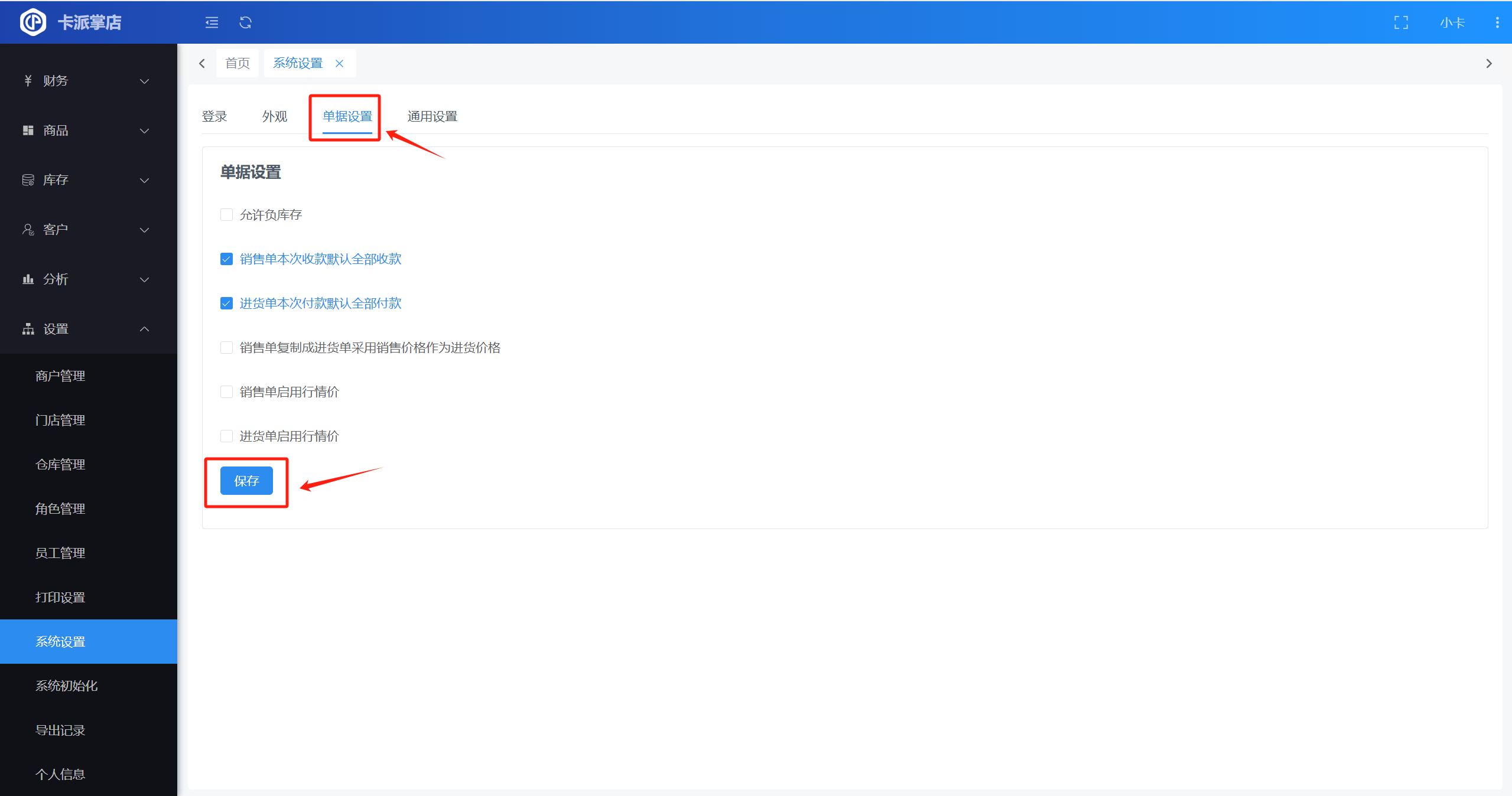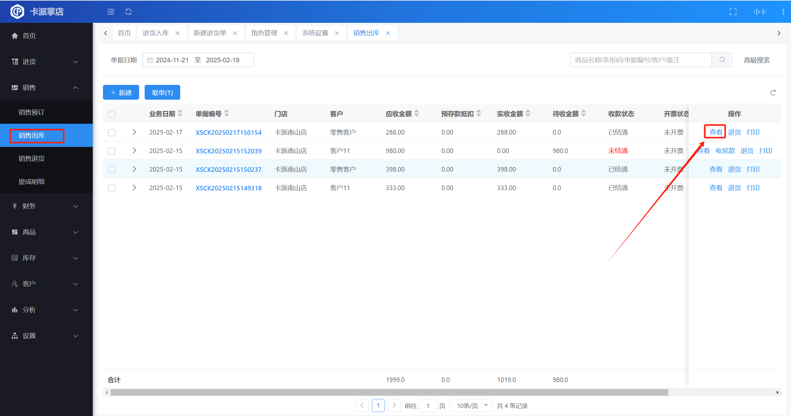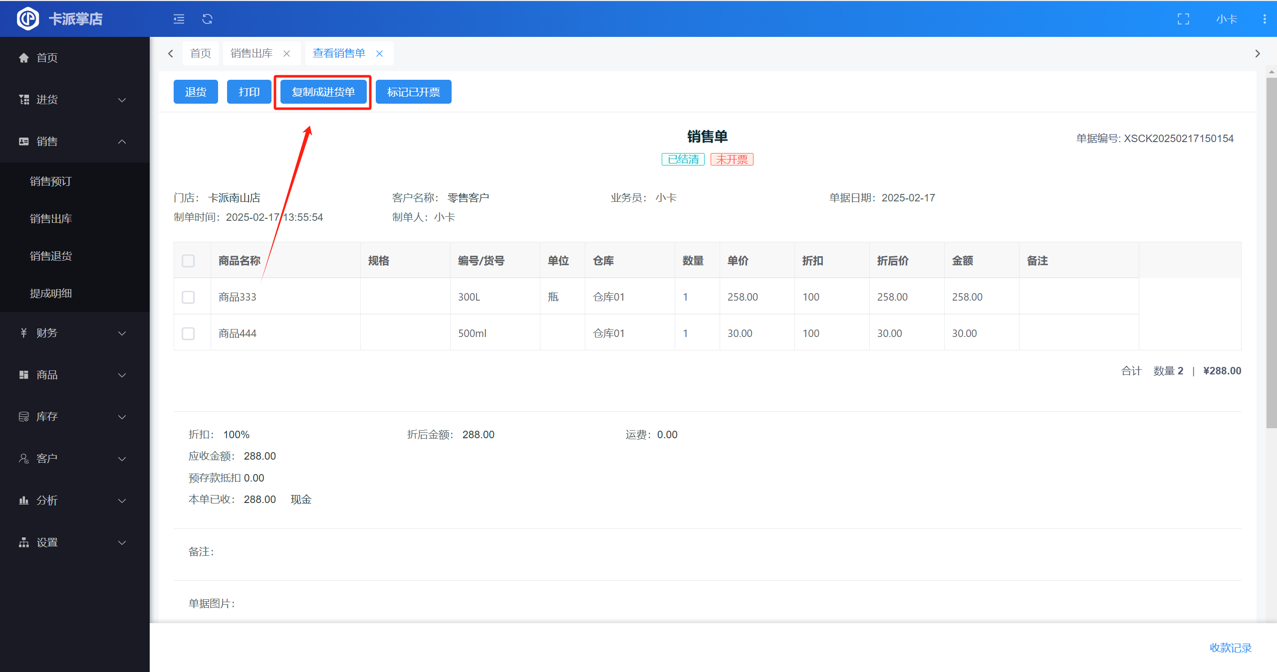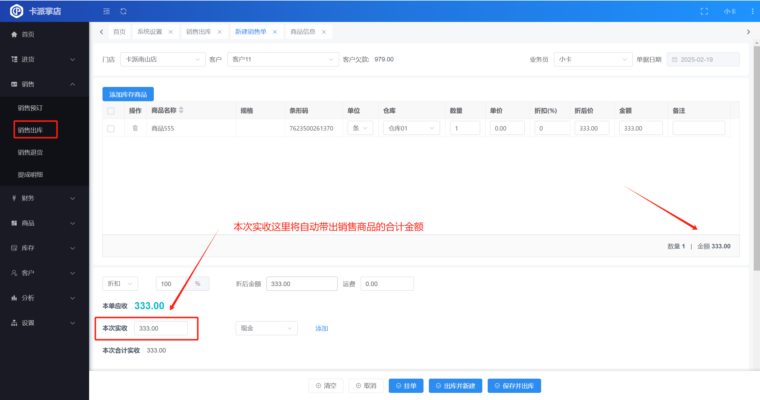 ▲ 勾选后,销售单的本次实收金额这里将自动带出所有销售商品的合计金额