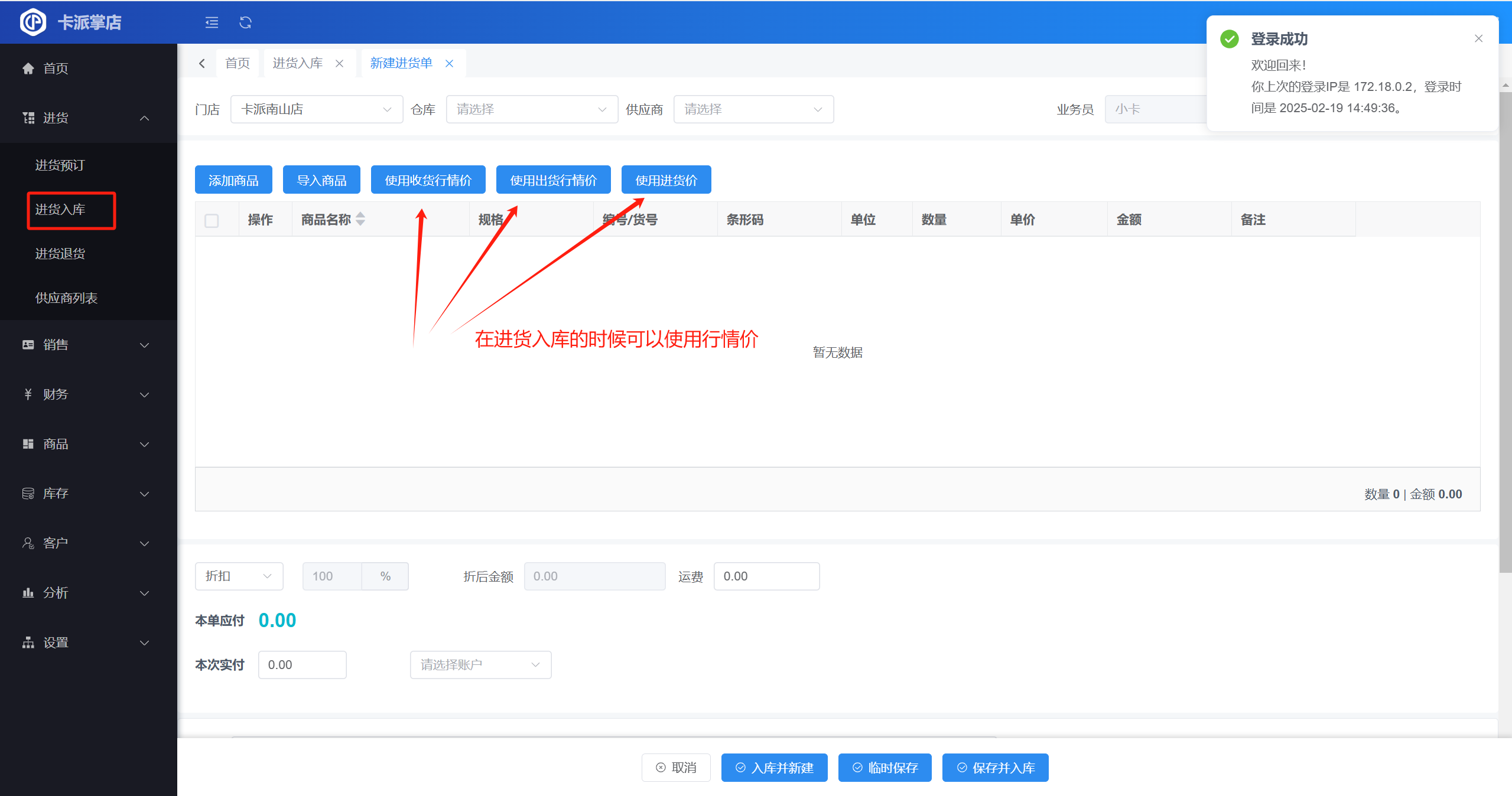 ▲ 勾选后,在进货入库的单据页面可以选择使用行情价