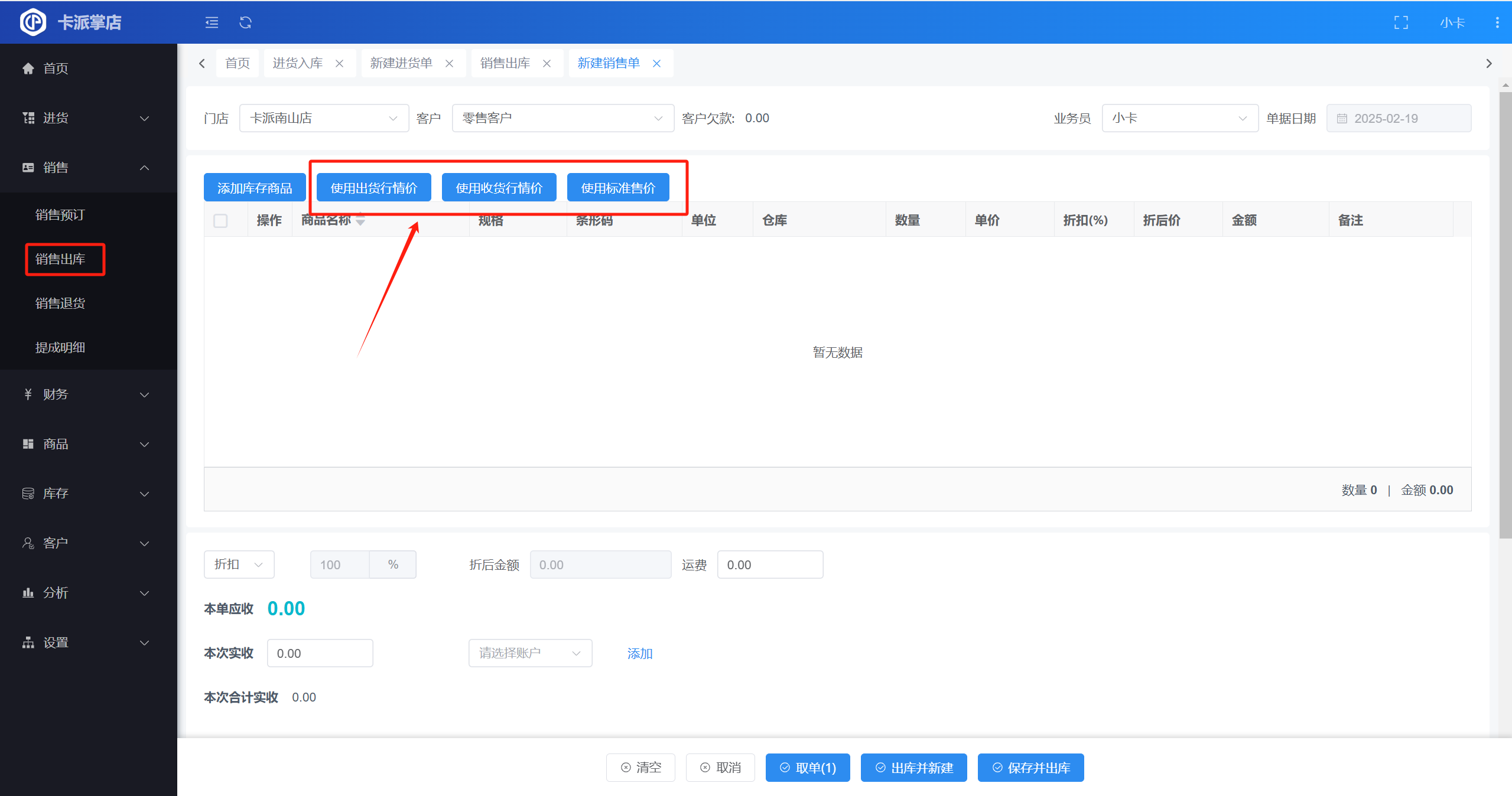 ▲ 勾选后,在销售出库的单据页面可以选择使用行情价