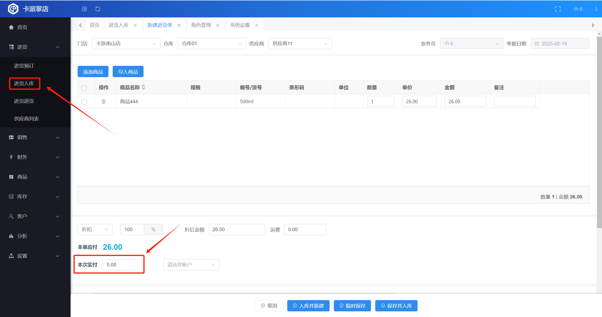 ▲ 未勾选时,进货单的本次实付金额这里将显示为0,需要手动输入本次实付金额