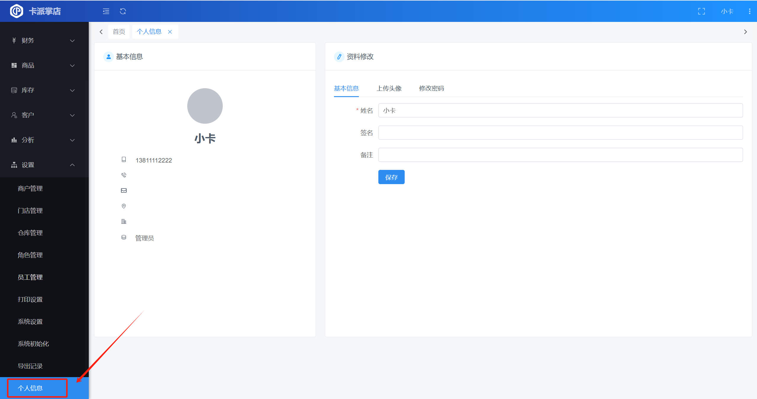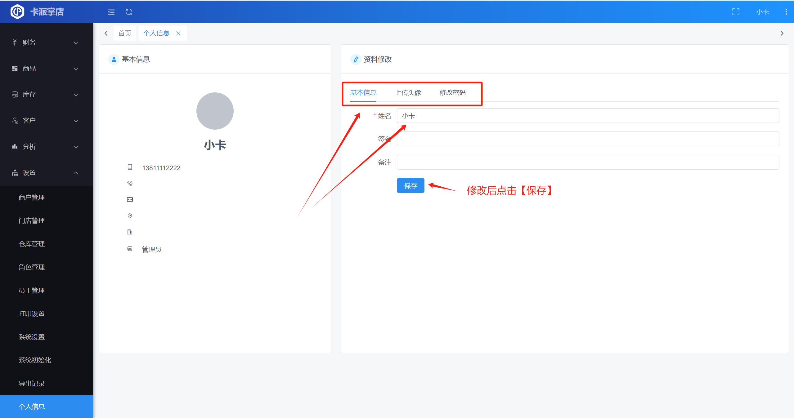 目录 搜索 了解卡派掌店新手指引如何导入原系统的商品及库存如何导入原系统的供应商或客户如何删除导入的数据常见问题导入数据时提示导入失败怎么办全部功能进货进货预订进货入库入错库怎么作废或撤销单据进货退货供应商销售销售预订销售出库没有库存,可以直接销售商品吗销售退货提成明细财务收款付款其它收入其它支出资金流水收支类型资金账户账户转账商品商品信息商品套餐提成设置单位设置属性设置收货行情如何订阅和使用收货行情如何复制订阅的行情表出货行情订阅记录库存库存查询库存盘点库存调拨库存流水库存预警质保期查询客户客户价格等级分析销售统计对账统计设置商户管理门店管理仓库管理角色管理为什么有些菜单或按钮我看不到员工管理打印设置无法打印或者系统提示未安装打印控件打印机默认配置系统设置系统初始化导出记录个人信息 暂无相关搜索结果! 本文档使用 MinDoc 发布 个人信息 查看个人信息操作路径:【设置】-【个人信息】 修改个人信息文档更新时间: 2025-02-19 15:01 作者:admin