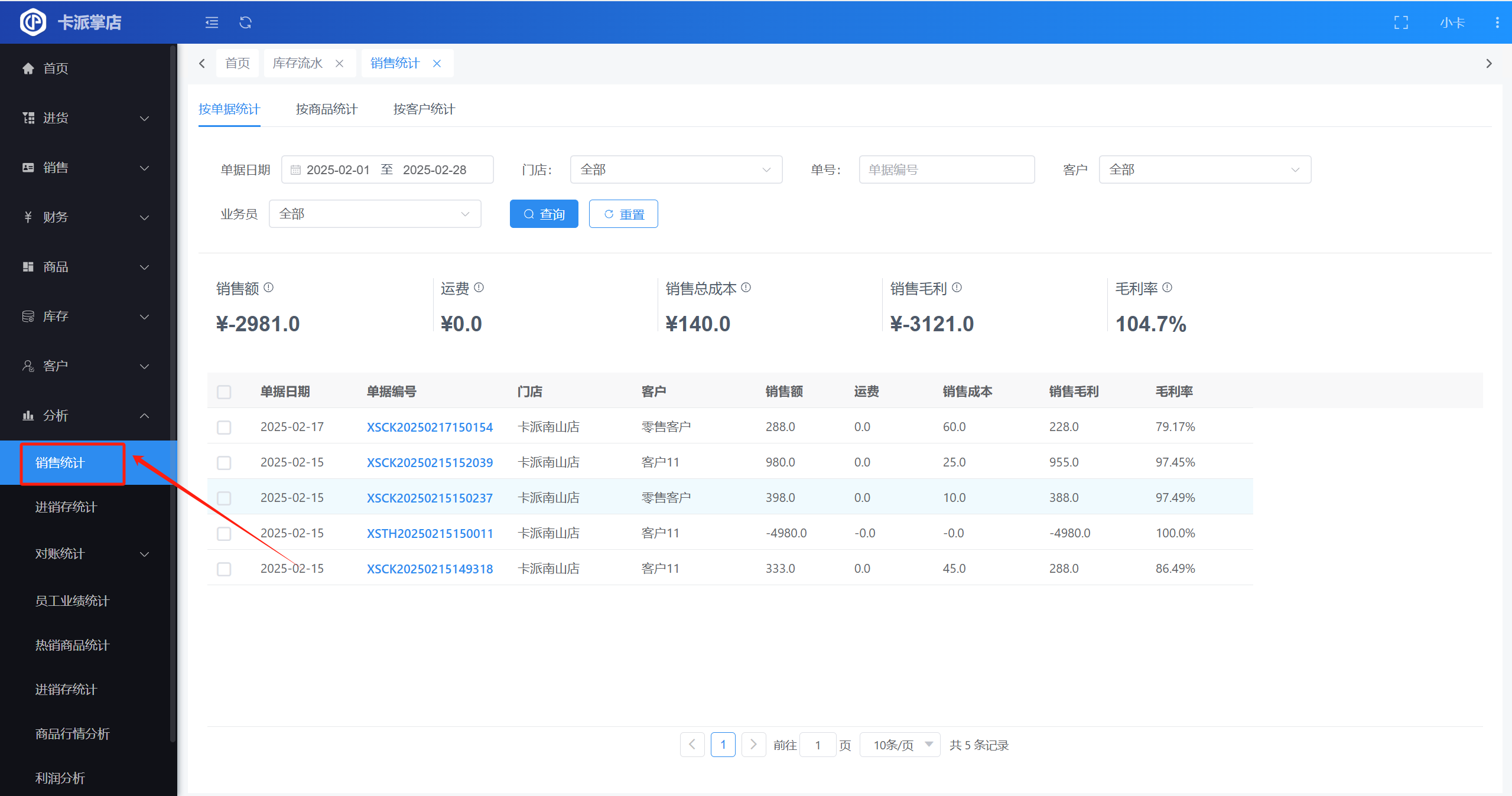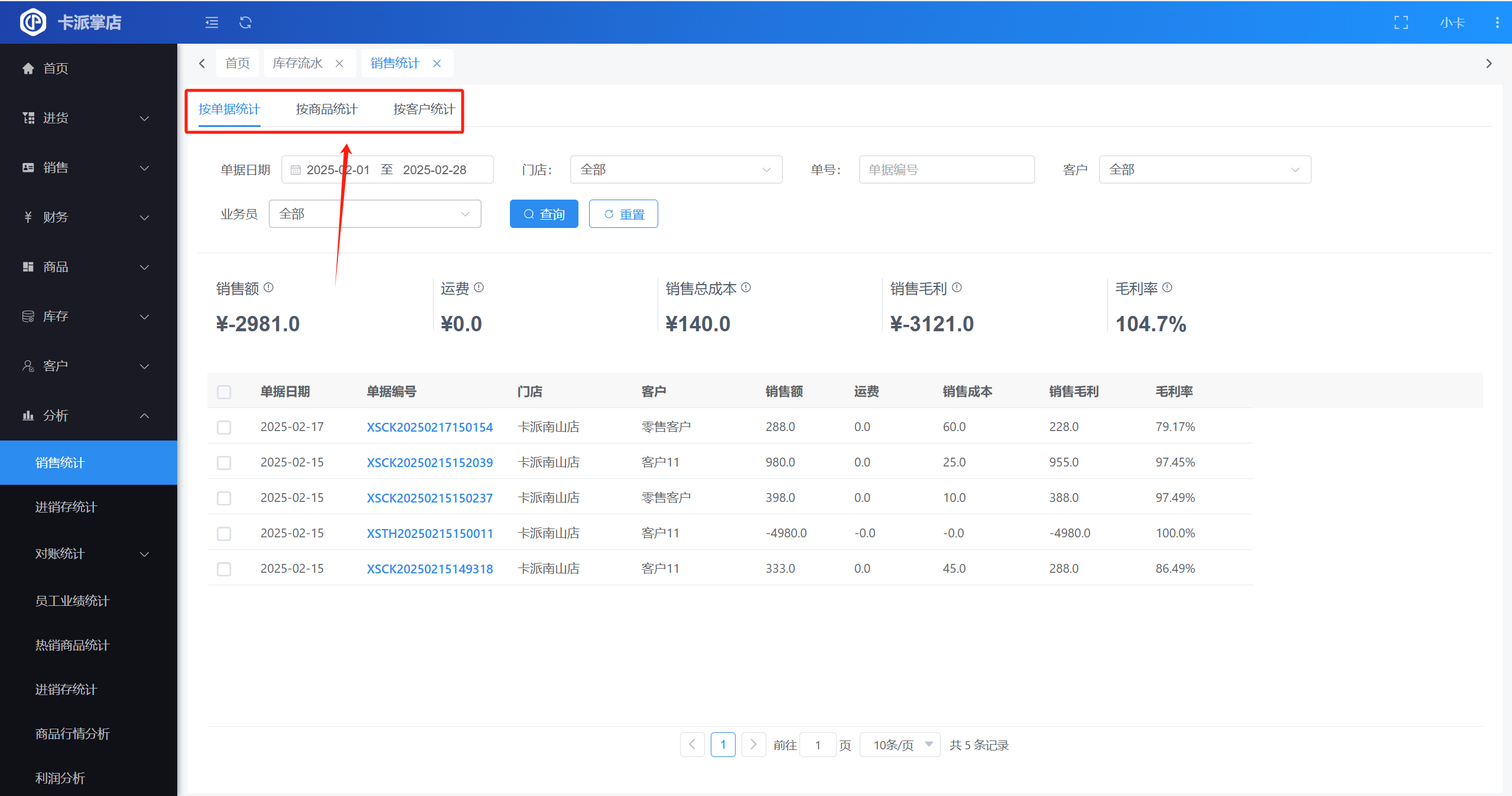目录 搜索 了解卡派掌店新手指引如何导入原系统的商品及库存如何导入原系统的供应商或客户如何删除导入的数据常见问题导入数据时提示导入失败怎么办全部功能进货进货预订进货入库入错库怎么作废或撤销单据进货退货供应商销售销售预订销售出库没有库存,可以直接销售商品吗销售退货提成明细财务收款付款其它收入其它支出资金流水收支类型资金账户账户转账商品商品信息商品套餐提成设置单位设置属性设置收货行情如何订阅和使用收货行情如何复制订阅的行情表出货行情订阅记录库存库存查询库存盘点库存调拨库存流水库存预警质保期查询客户客户价格等级分析销售统计对账统计设置商户管理门店管理仓库管理角色管理为什么有些菜单或按钮我看不到员工管理打印设置无法打印或者系统提示未安装打印控件打印机默认配置系统设置系统初始化导出记录个人信息 暂无相关搜索结果! 本文档使用 MinDoc 发布 销售统计 销售统计能精准汇总商品销量、销售额、毛利、毛利率等数据,生成直观报表,助您洞察销售状况,科学决策。查看销售统计操作路径:【分析】-【销售统计】 销售统计报表可【按单据统计】【按商品统计】【按客户统计】操作路径:【分析】-【销售统计】文档更新时间: 2025-02-17 14:49 作者:admin