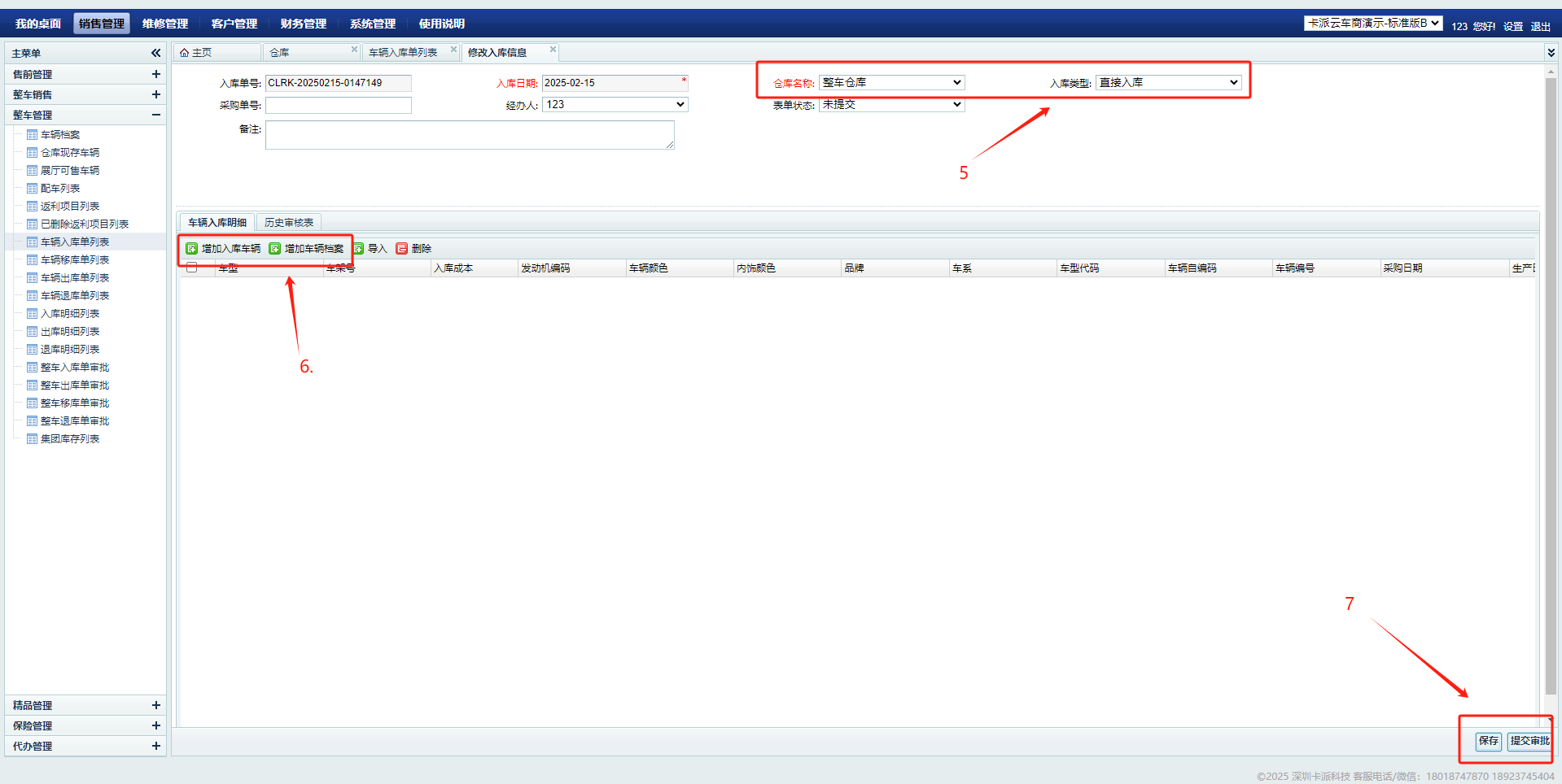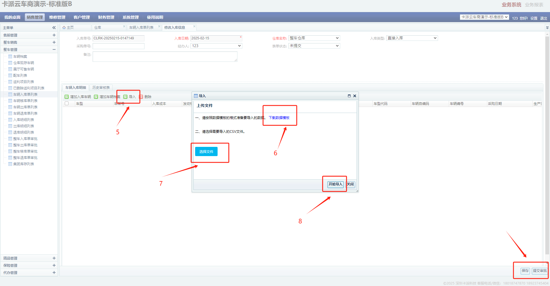 操作:点击车辆入库单列表上方的“车辆入库登记”按钮,创建一张新的入库单,然后“保存”入库单,保存之后就可以进行车辆的导入,如下图: