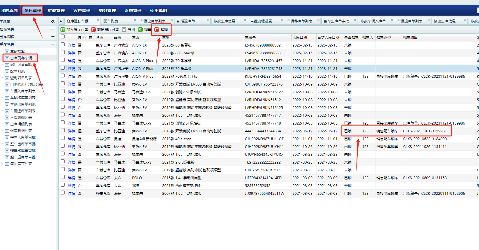 ▲在仓库现存车辆列表找到对应车辆锁车的类型,如果是属于销售配车的锁车,需要去配车列表进行解锁