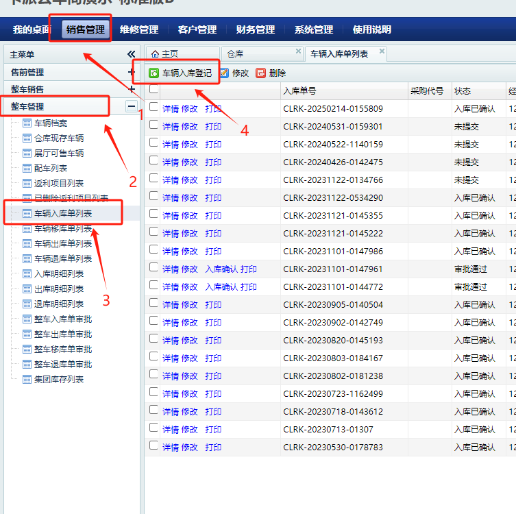 路径:销售管理→整车管理→车辆档案→车辆档案登记