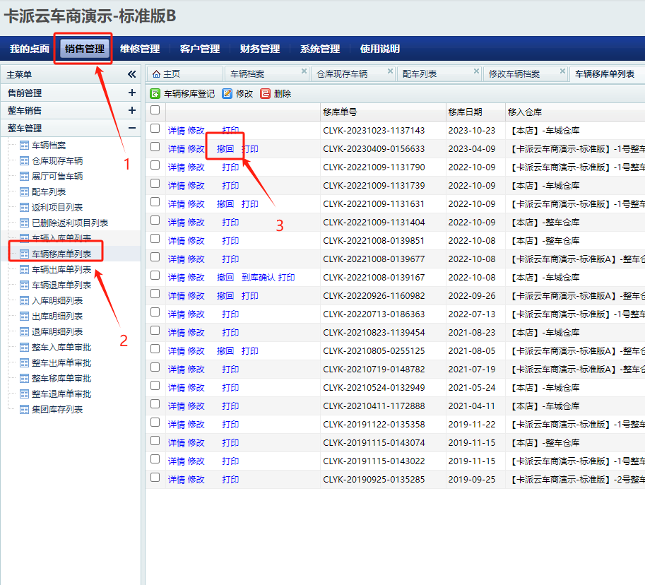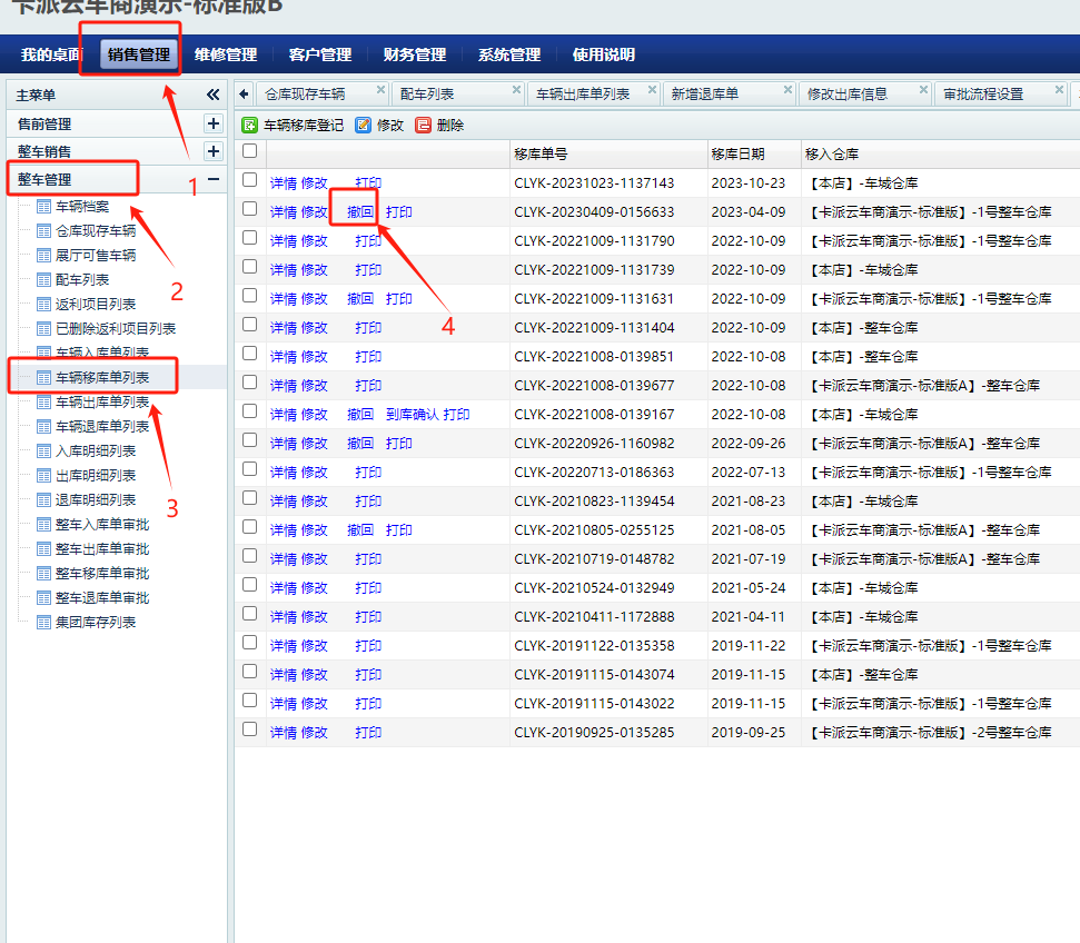 第一种集团统一管理经营车型:需要移出车辆的公司在移库单列表,找到对应的移库单,点击【撤回】,然后在车辆档案列表修改车辆,并重新选择品牌、车系、车型后再重新移库(如果集团统一车型没有配置此款经营车型,需要系统管理员去集团统一车型配置的店去添加此款车型)