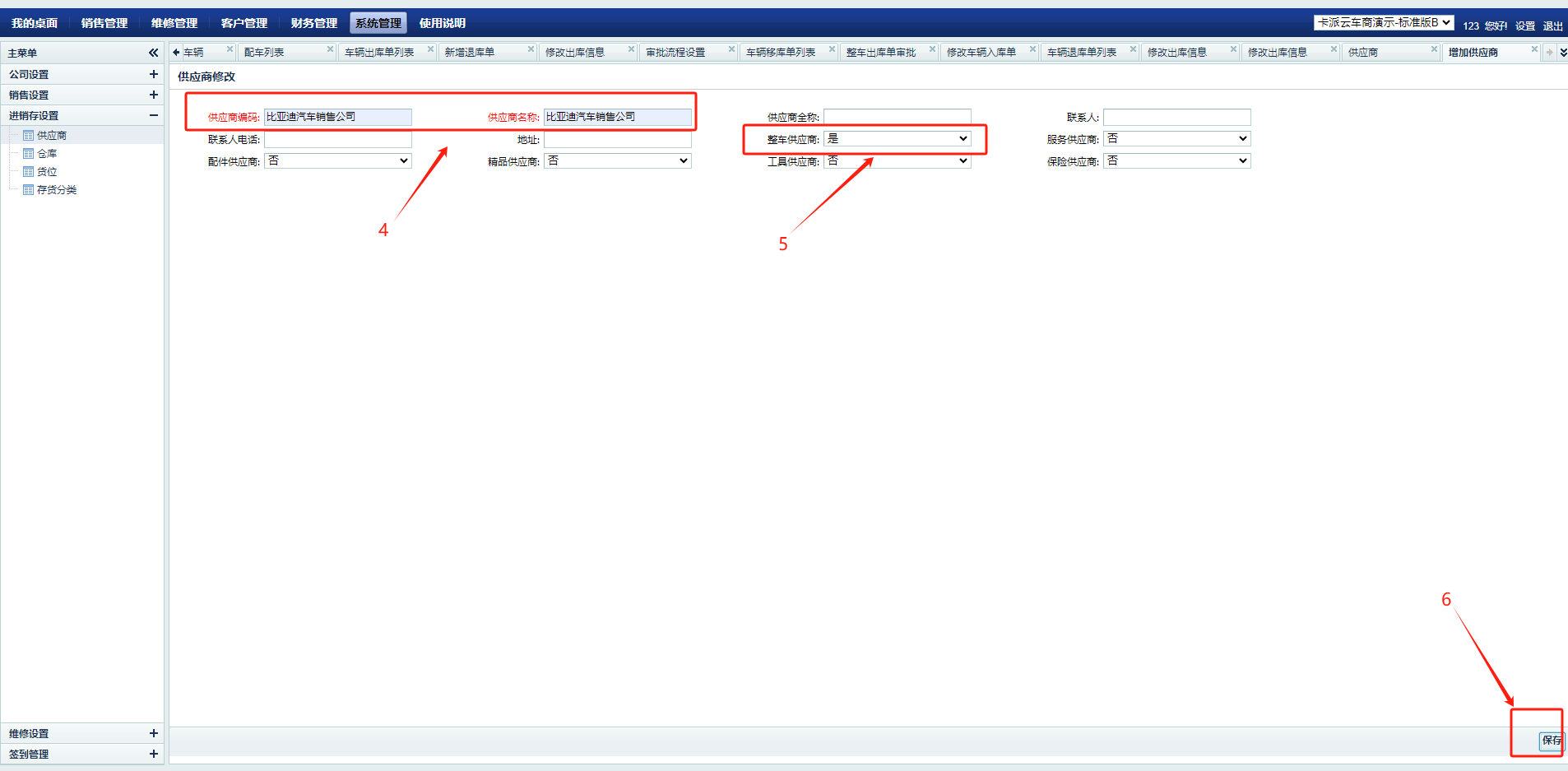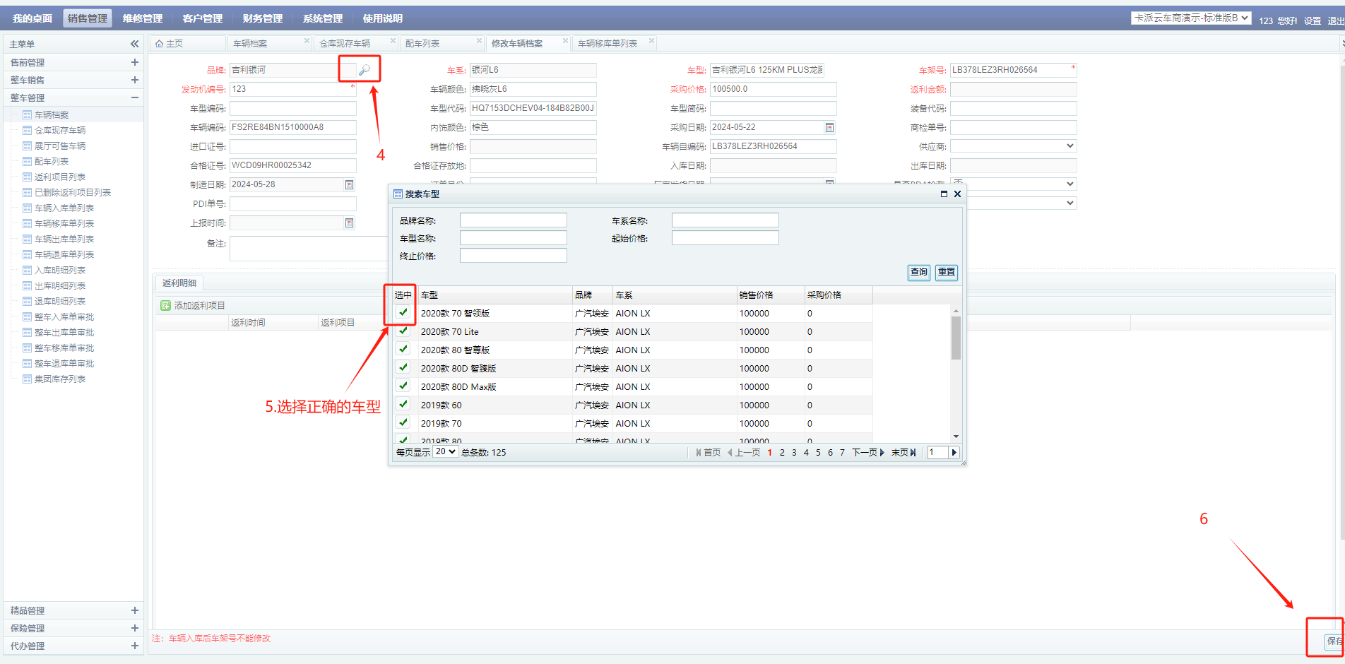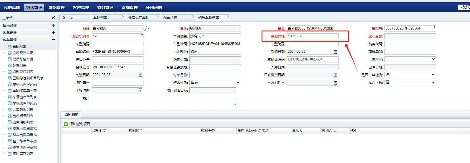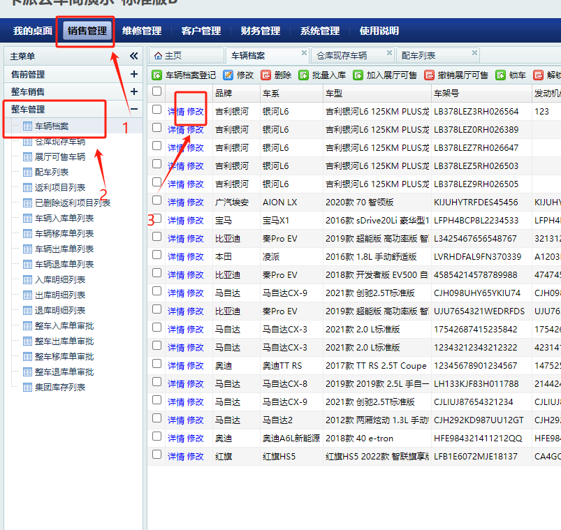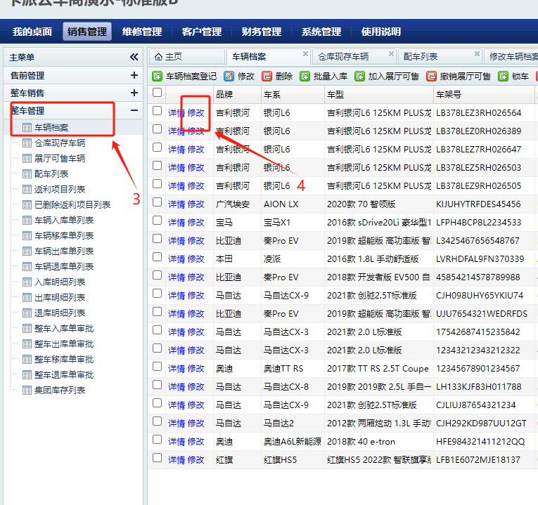第三种情况:如果是整车库存车辆的档案信息填写错误,信息员可以在“车辆档案”中进行修改。