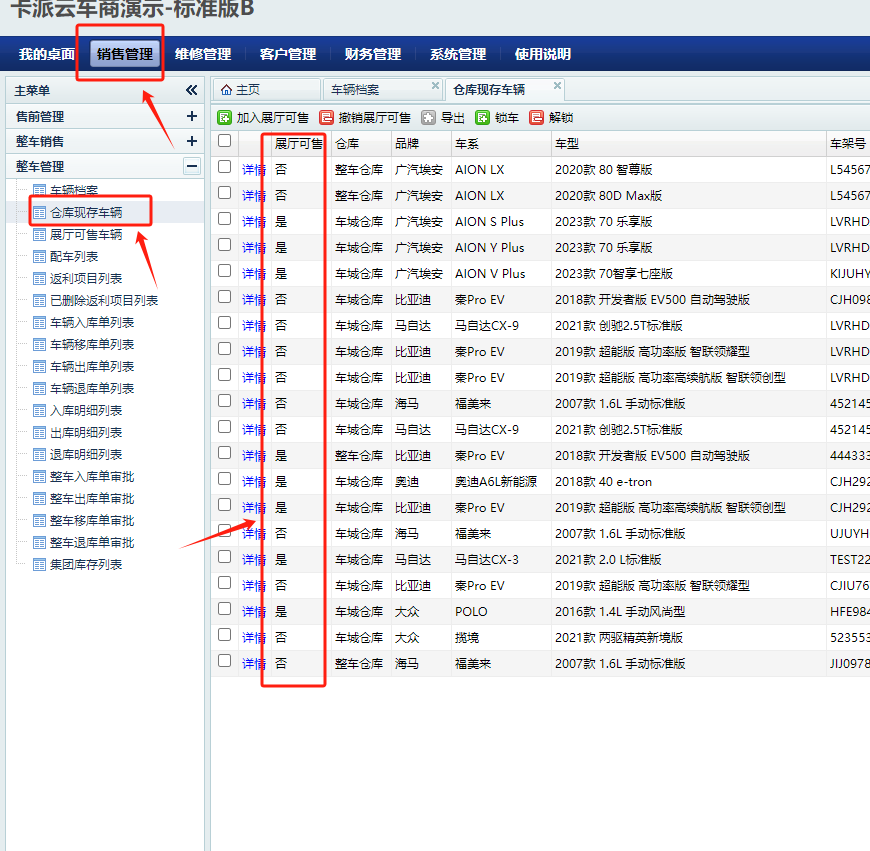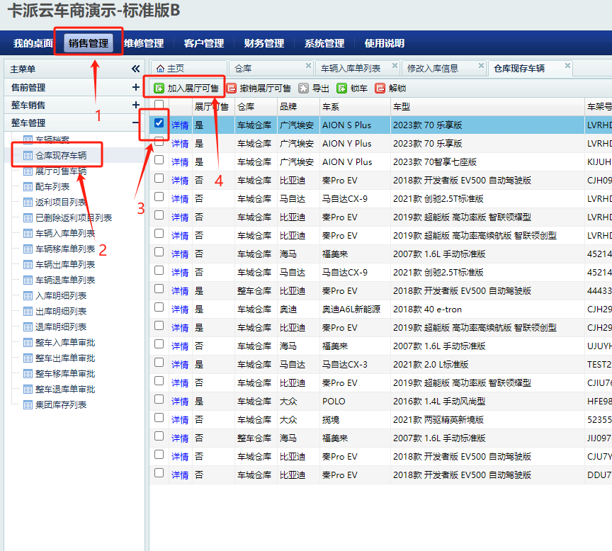 操作:在弹出的页面勾选上需要加入展厅的车辆,点击上方菜单栏的“加入展厅可售”即可。