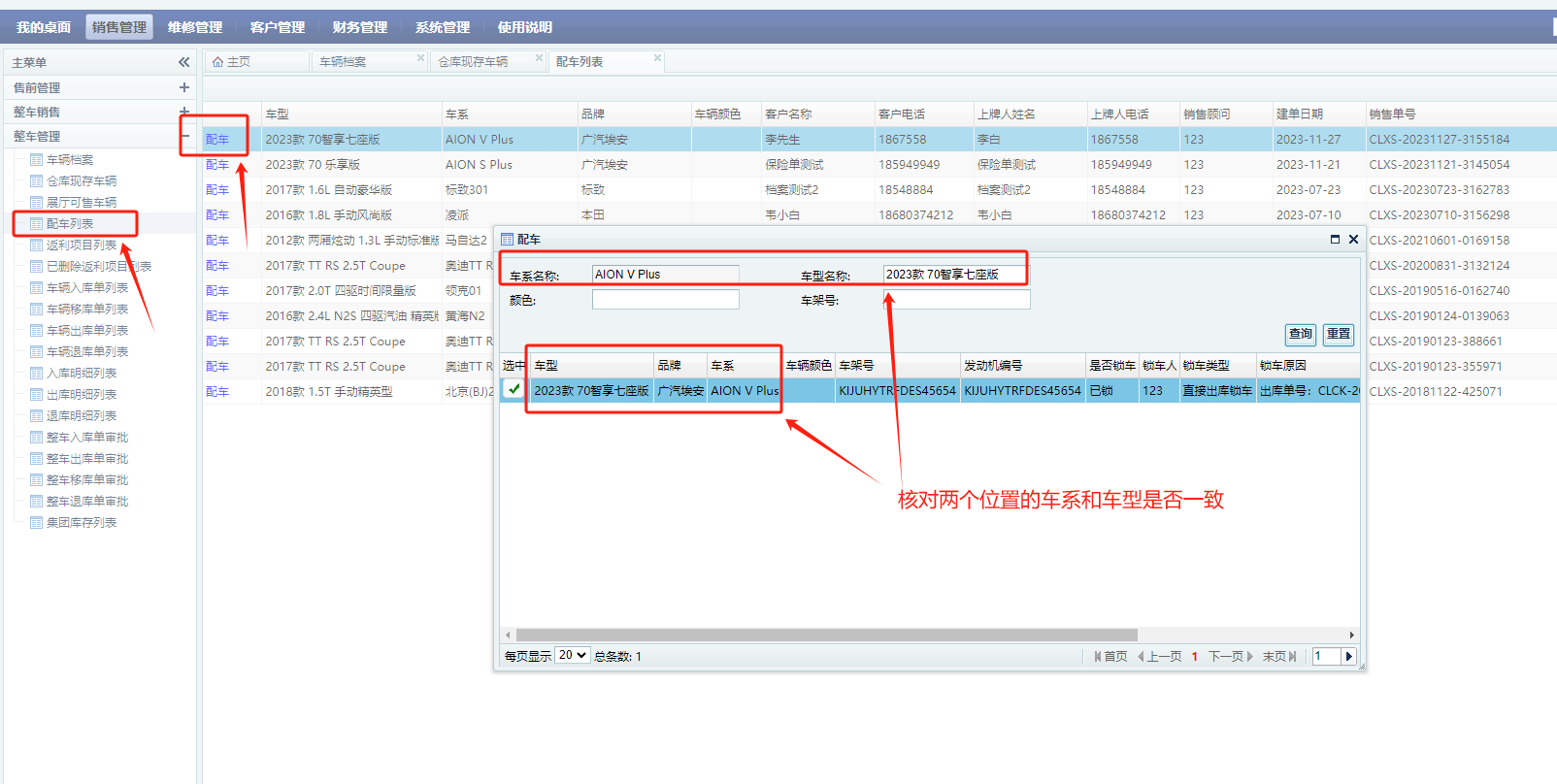 小贴士:财务人员完成收款后,信息员才可以去操作配车。注:点击“配车”弹出库存中查找不到您需要的车,请入库并加入展厅可售,才能配车。