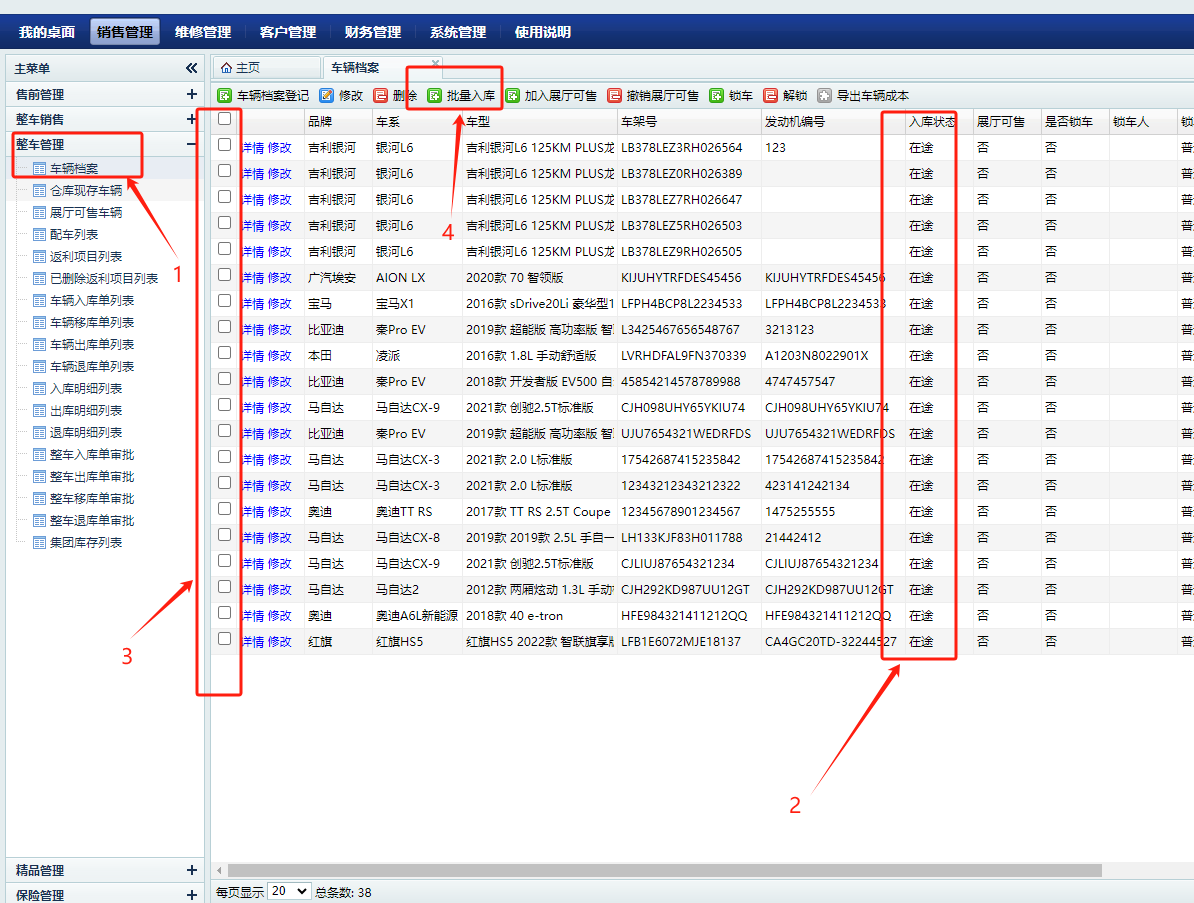 ▲在“车辆档案”中找到在途的车辆,点击“批量入库”