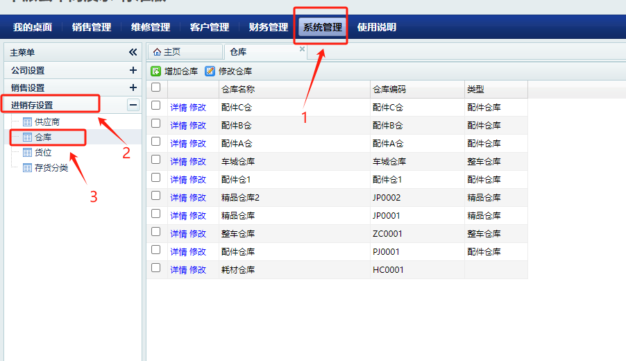 小贴士:仓库名称需要在系统管理→进销存设置→仓库模块去增加仓库。