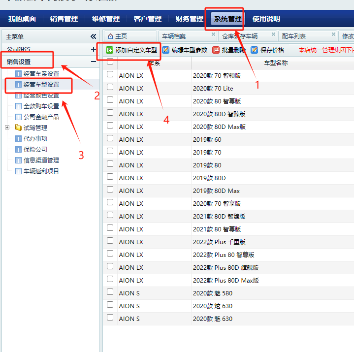 第二种各店独立管理经营车型:需要移入车辆的公司,找销售经理或者系统管理员在本店经营车型中添加移库单对应的车辆品牌、车系及车型 (如果已经有移入车辆的品牌及车系则在系统管理—销售设置—经营车型列表添加自定义车型)