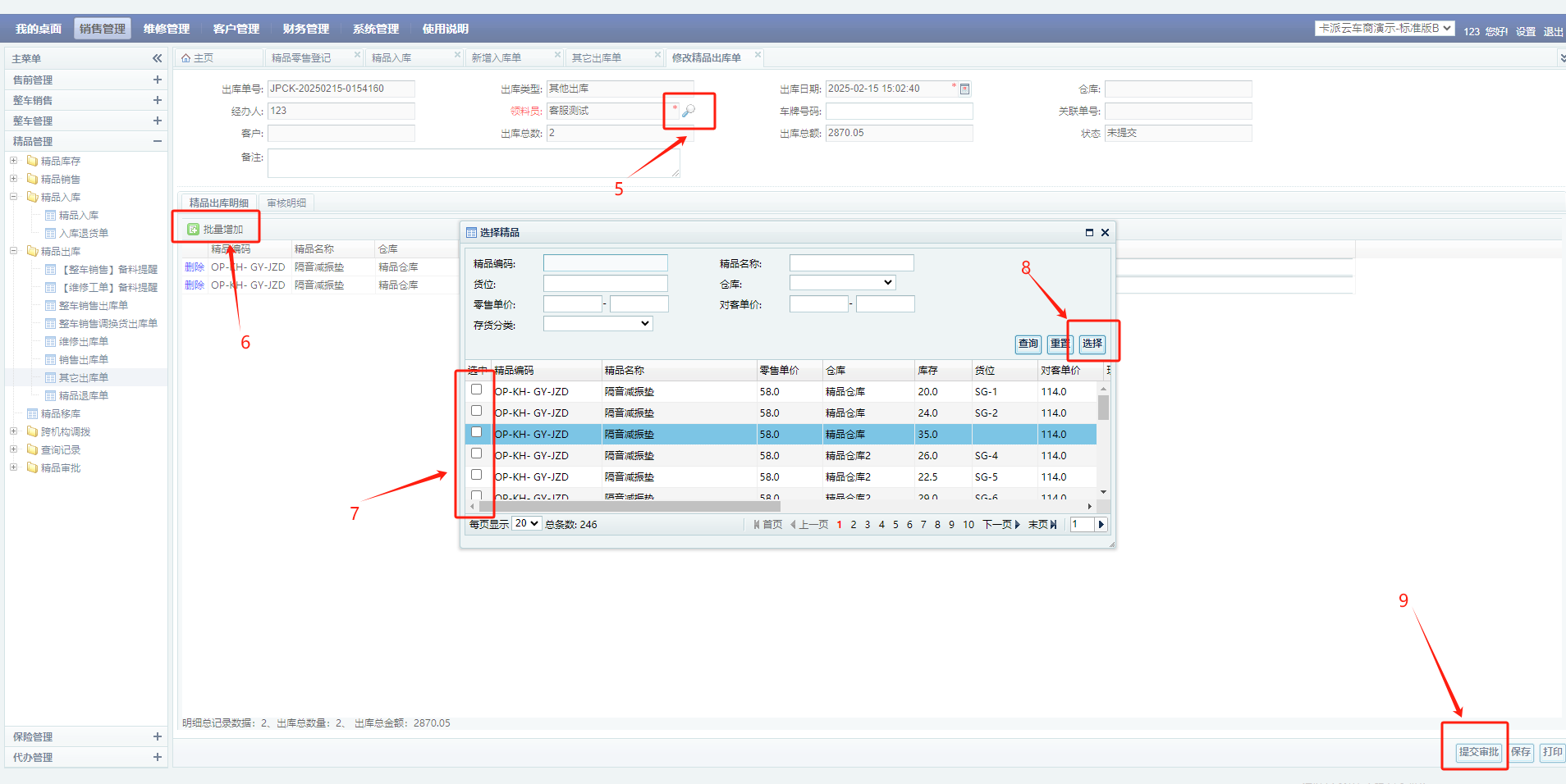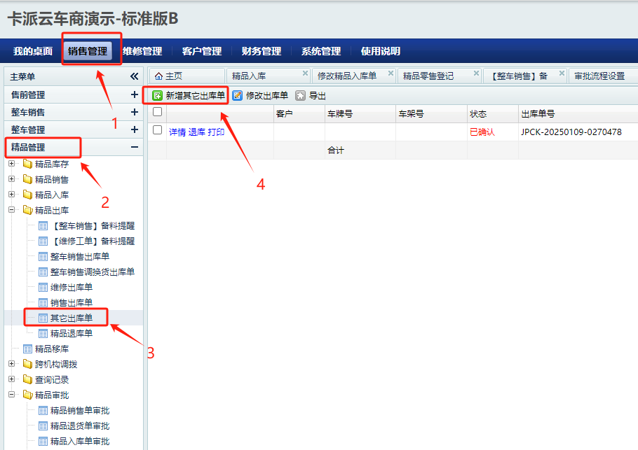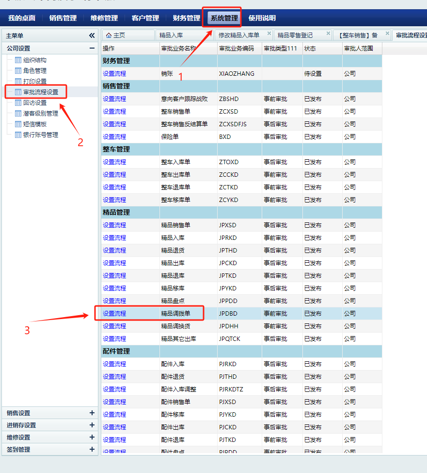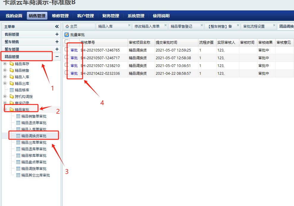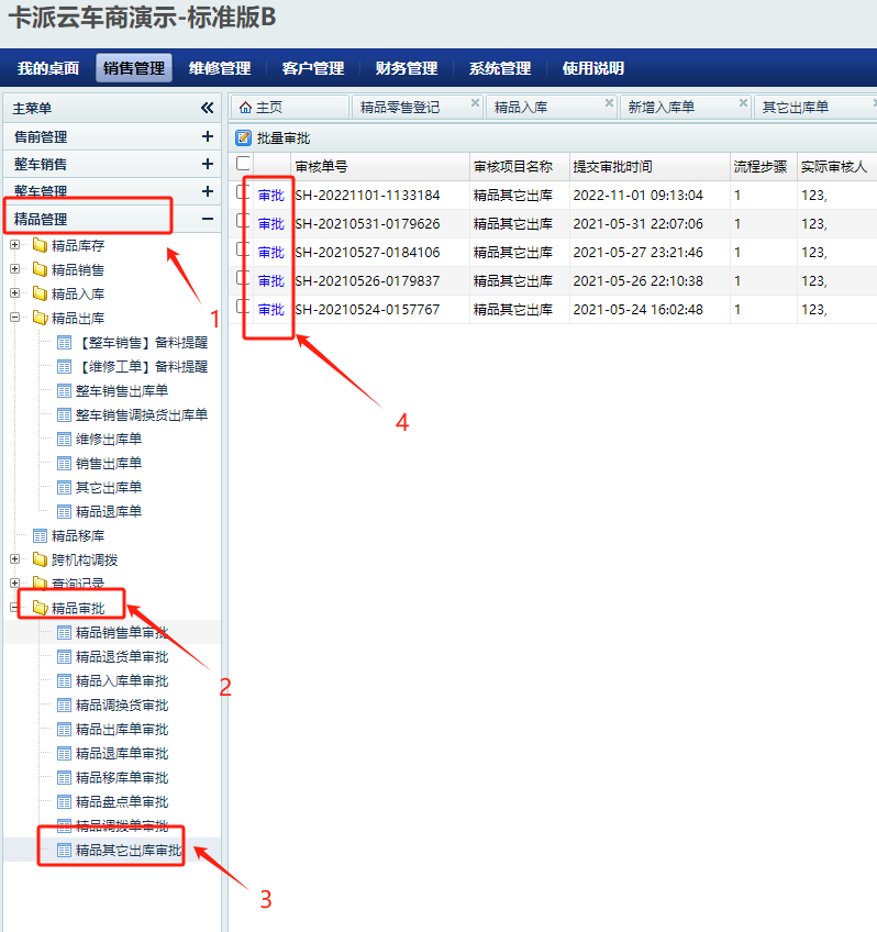 3、审批:流程中配置了审批权限的人员可以在【销售管理->精品管理->精品审批->精品其它出库审批】中点击“审批”
