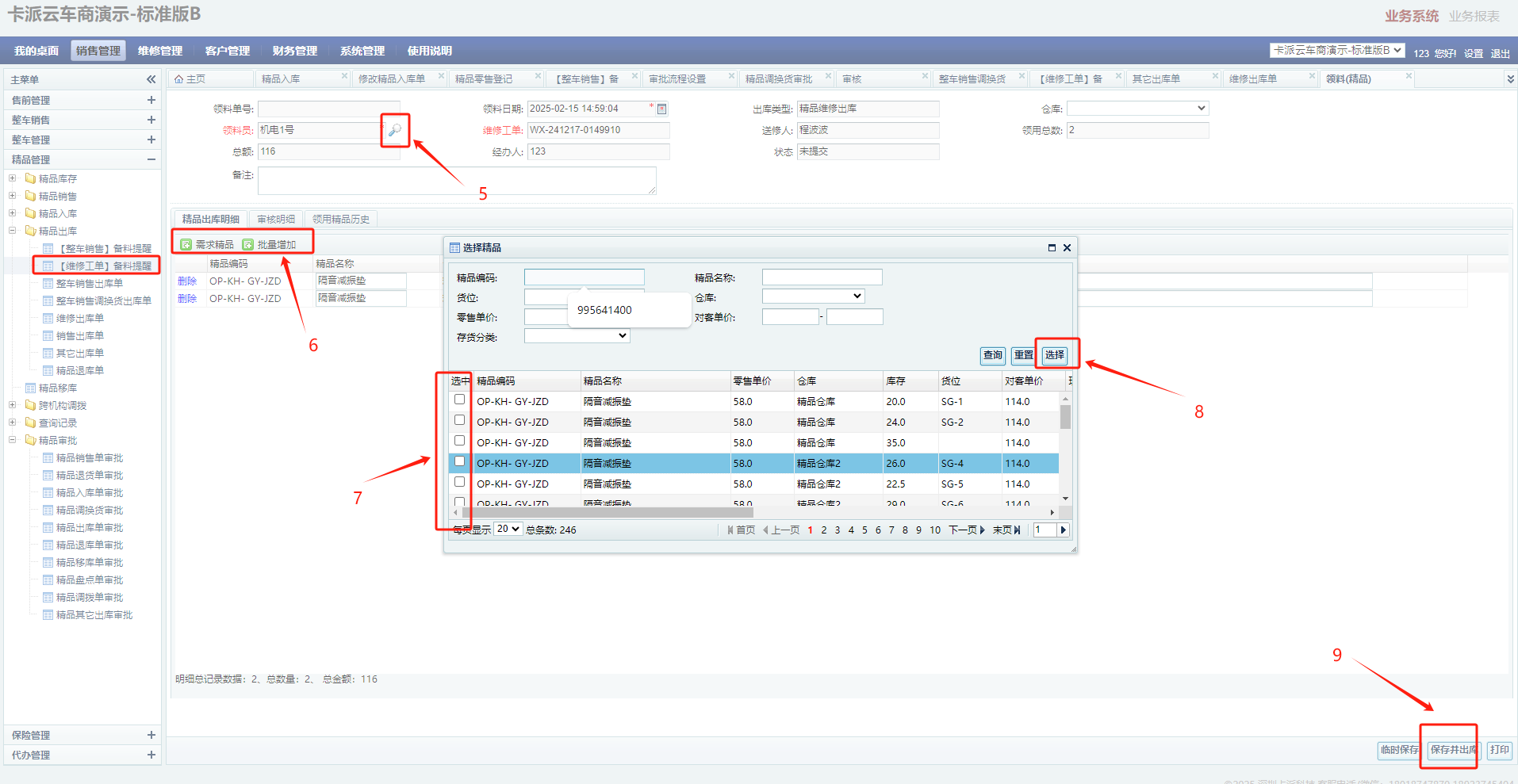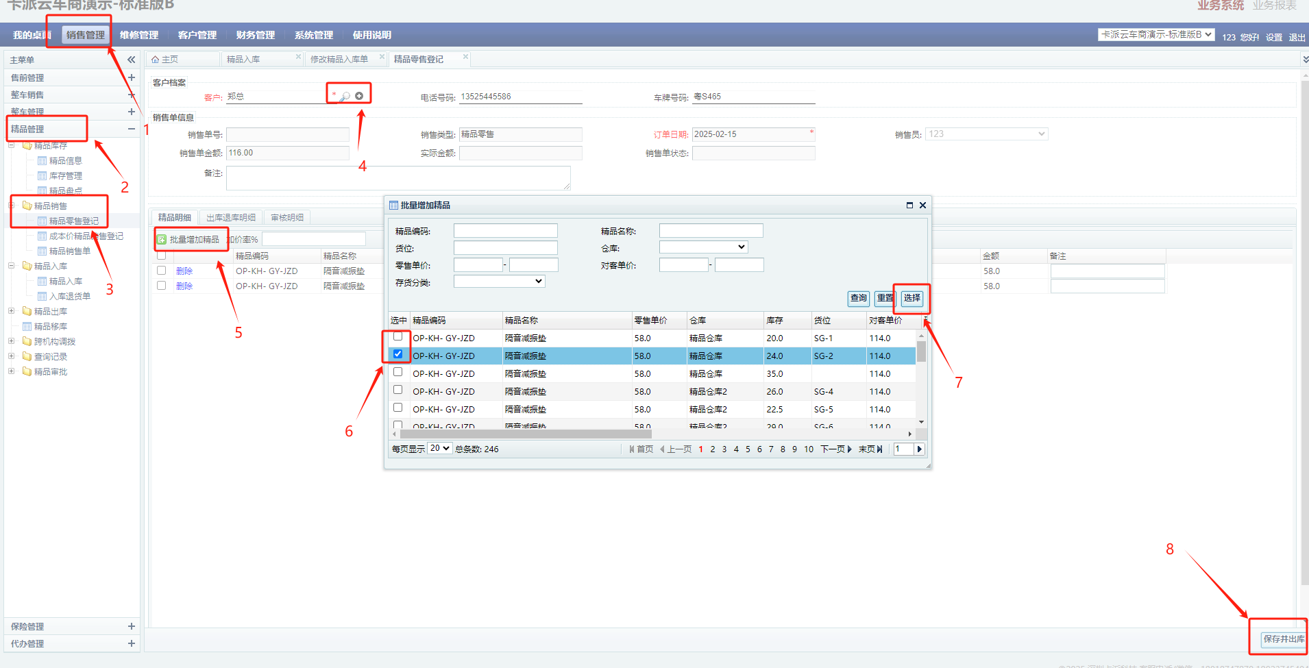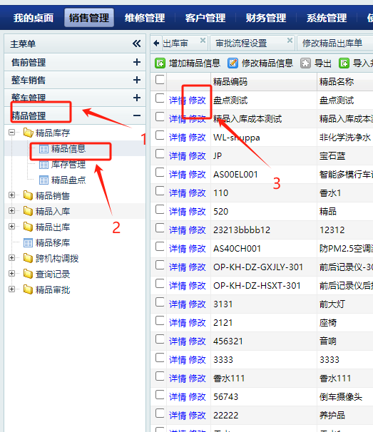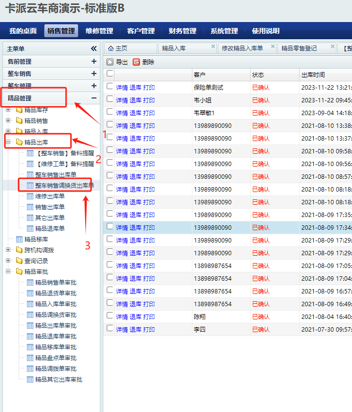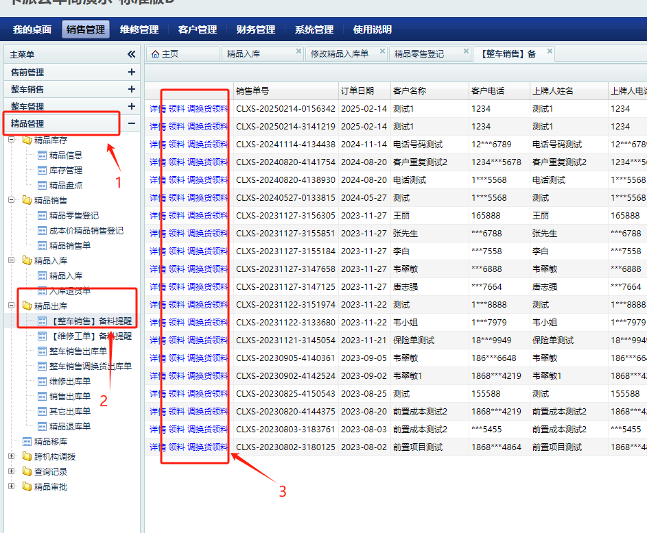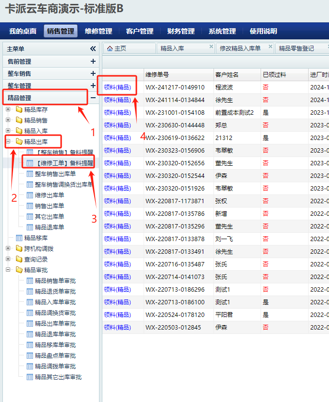 注:精品领料及调换货是一对一进行的,比如A精品2件,在领料的时候,一次性需出库2件,调换货时也是用2件精品去换,如果需要单独1件进行领料或调换货,需要修改整车销售单中的精品明细,将A精品添加2次,每次一件。