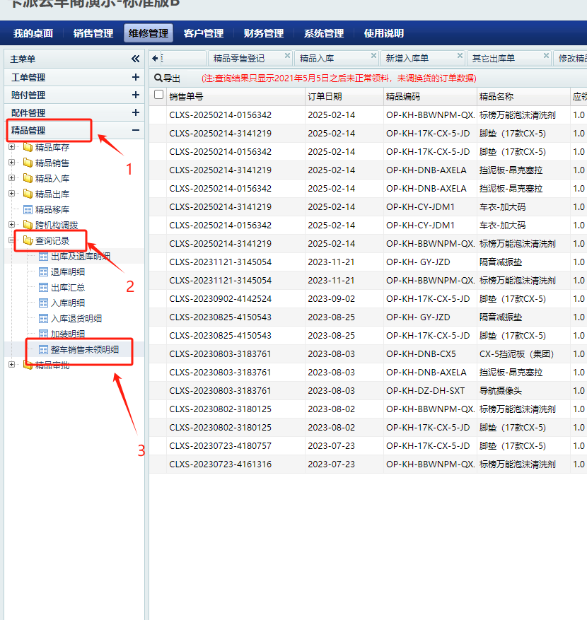 ▲在整车销售未领明细中可以查看所有整车销售单待领取的精品明细