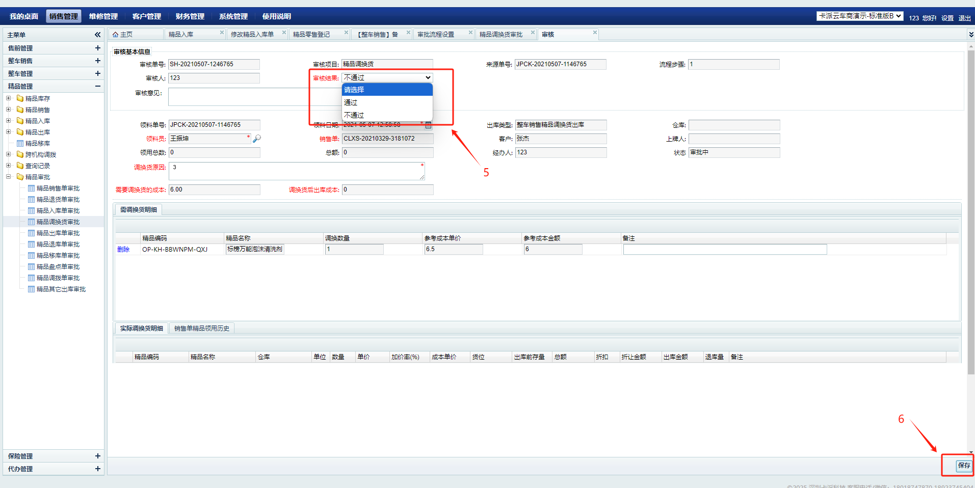 整车销售单中未领料的精品可以进行调换货,当调换货后精品成本小于需调换货精品时,可以直接出库完成,当调换货后精品成本大于需调换货精品时,需要走审核流程后才能出库完成,审核流程需要配置成事前审核