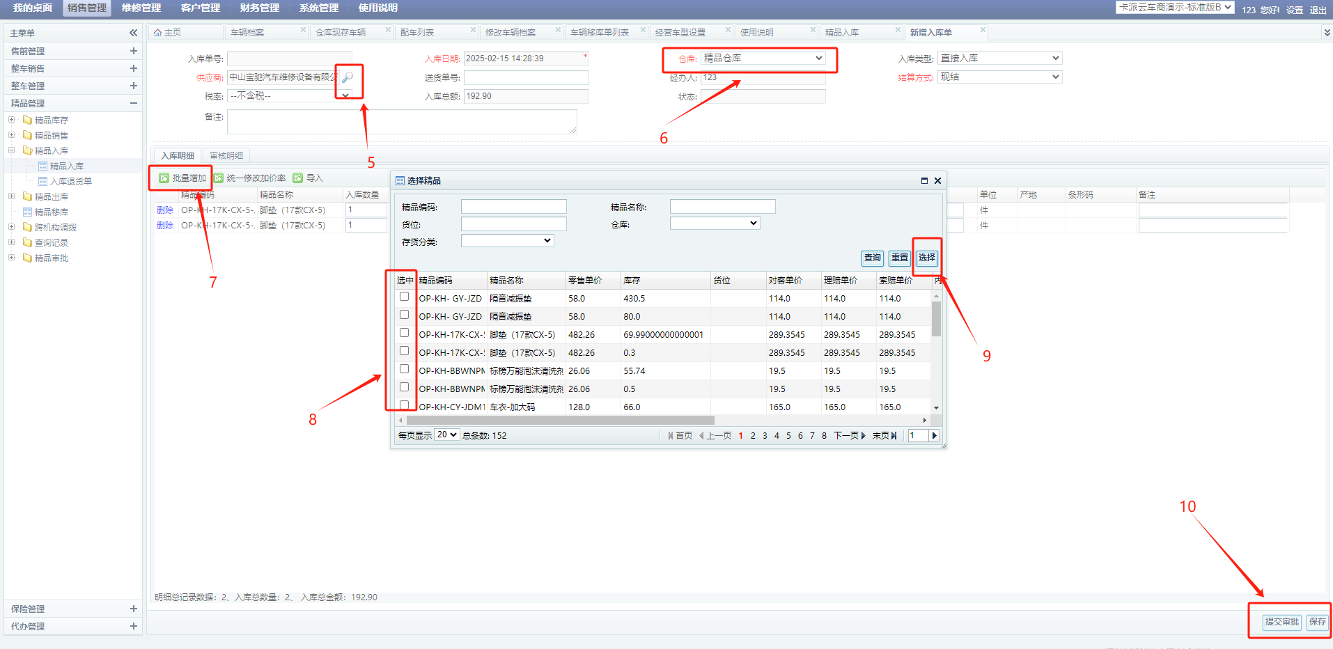 操作:点击上方菜单栏的“新增入库单”在弹出的页面选择好精品仓库、供应商、结算方式,然后点击中间菜单栏的“批量增加”在弹出的页面勾选上需要入库的精品点击“选择”,点击右下角的“提交审批”按钮。(红色*号为必填项)