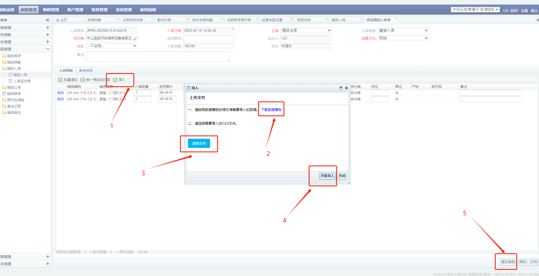 ▲先下载导入模板,将数据按模板要求整理好后,再点击“选择文件”进行批量导入库存,如果导入不成功系统会返回导入不成功的数据文件,打开后可查看不成功原因