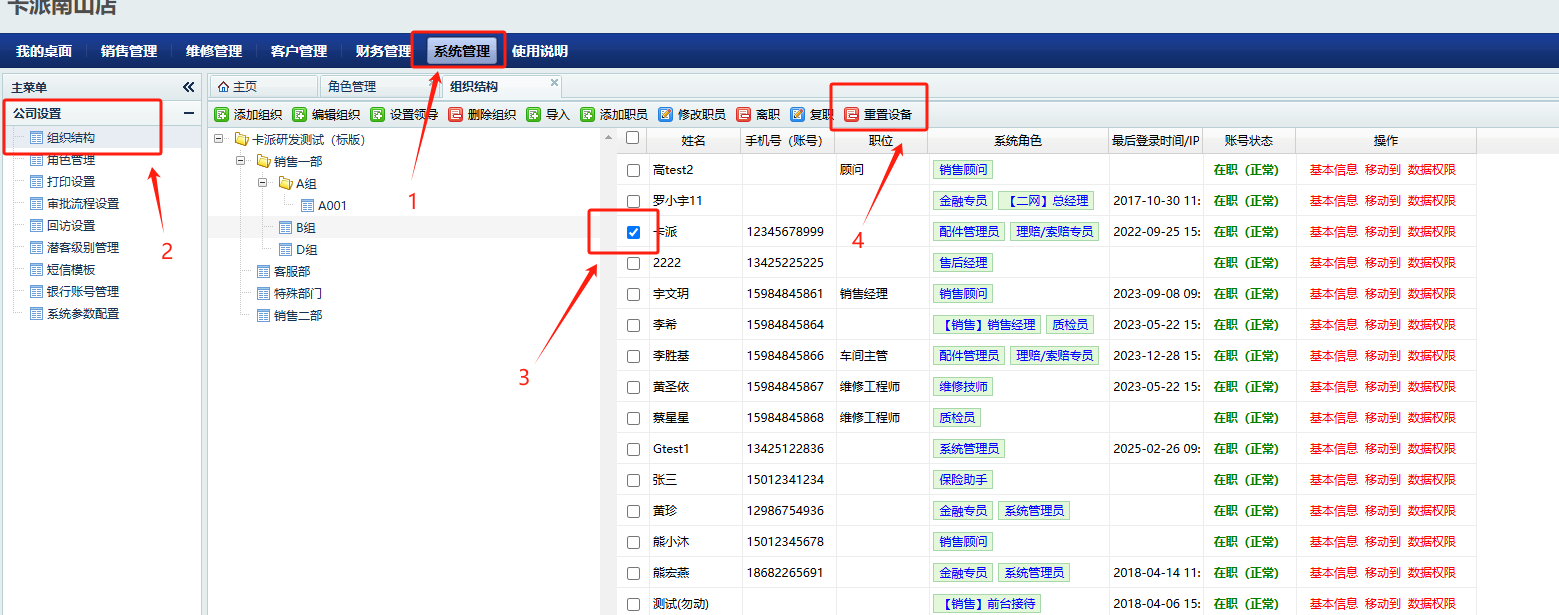 路径:系统管理→公司设置→组织结构,勾选需重置设备绑定的人员,点击工具栏上方“重设设备”