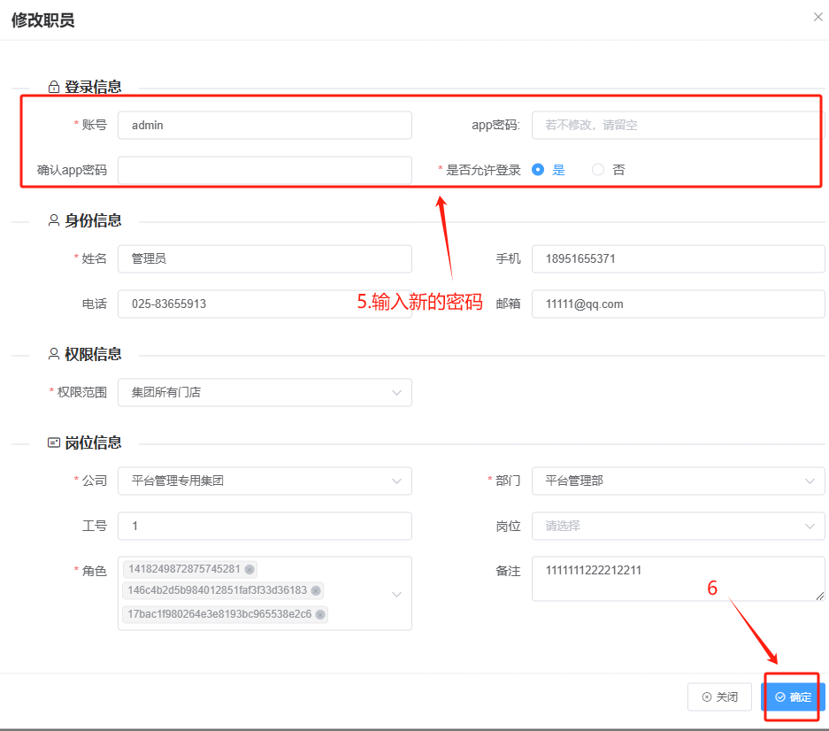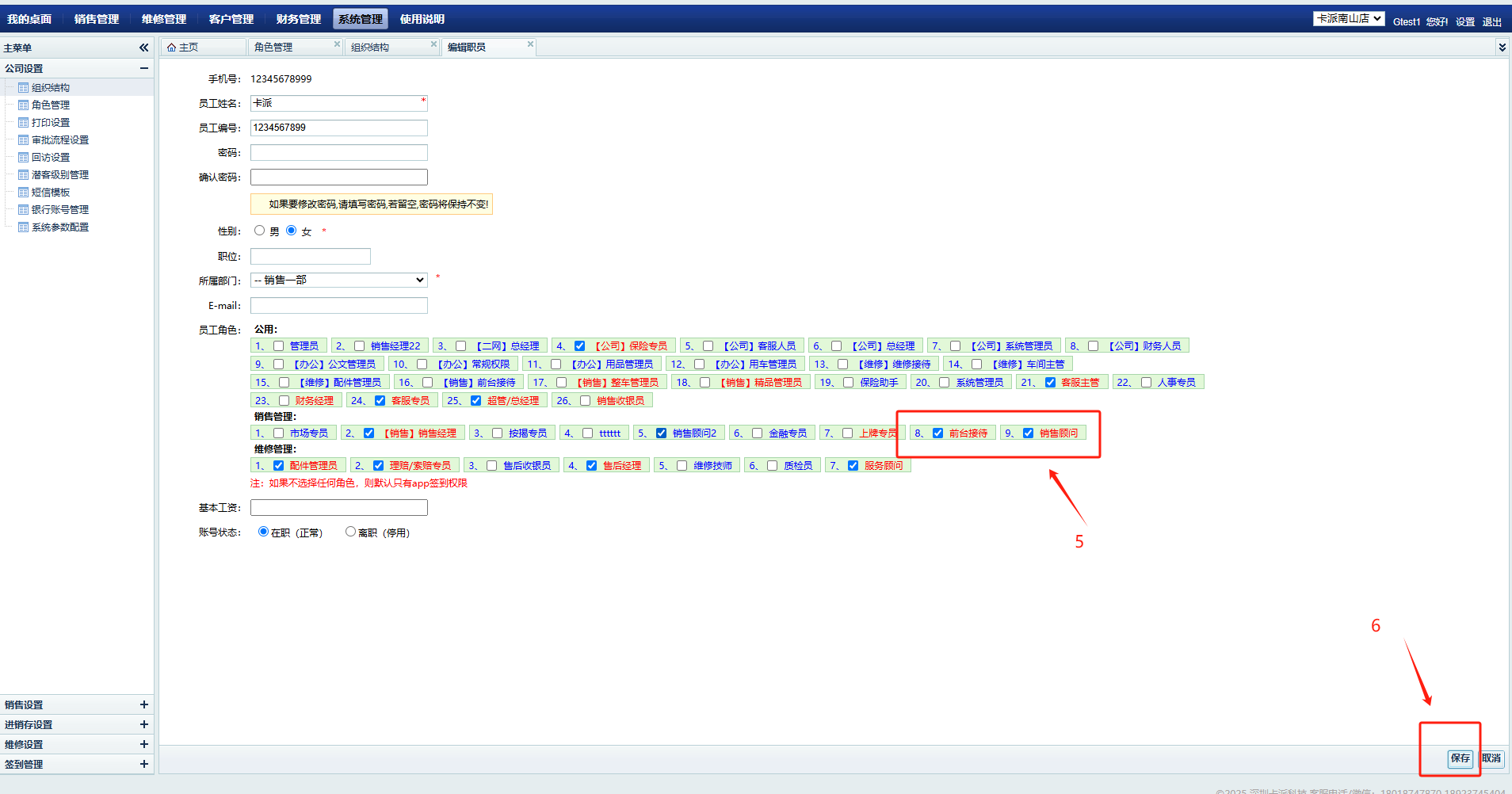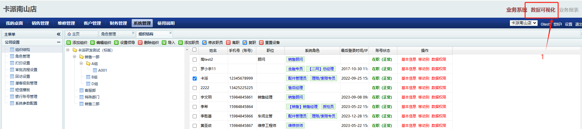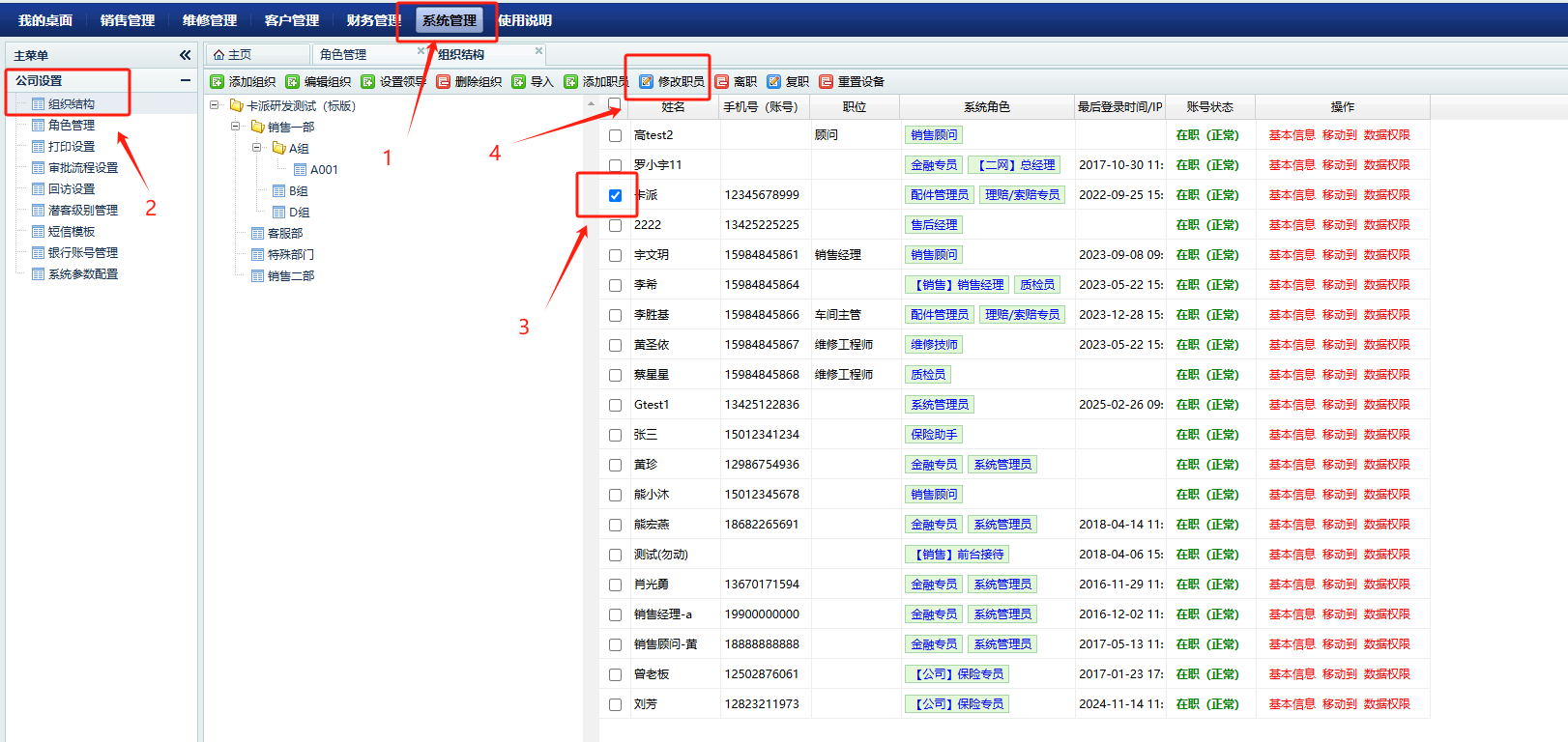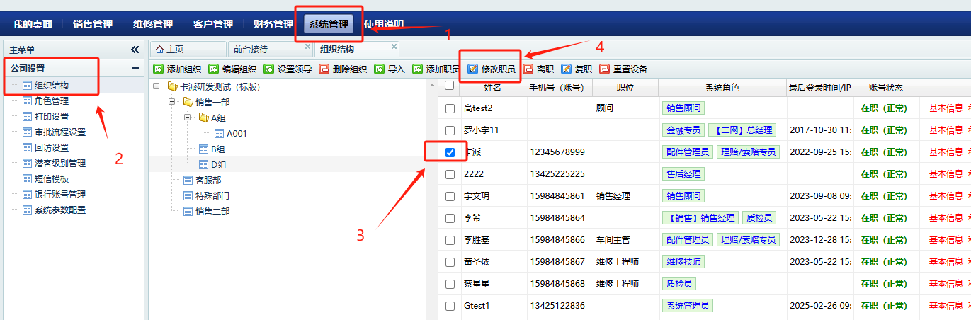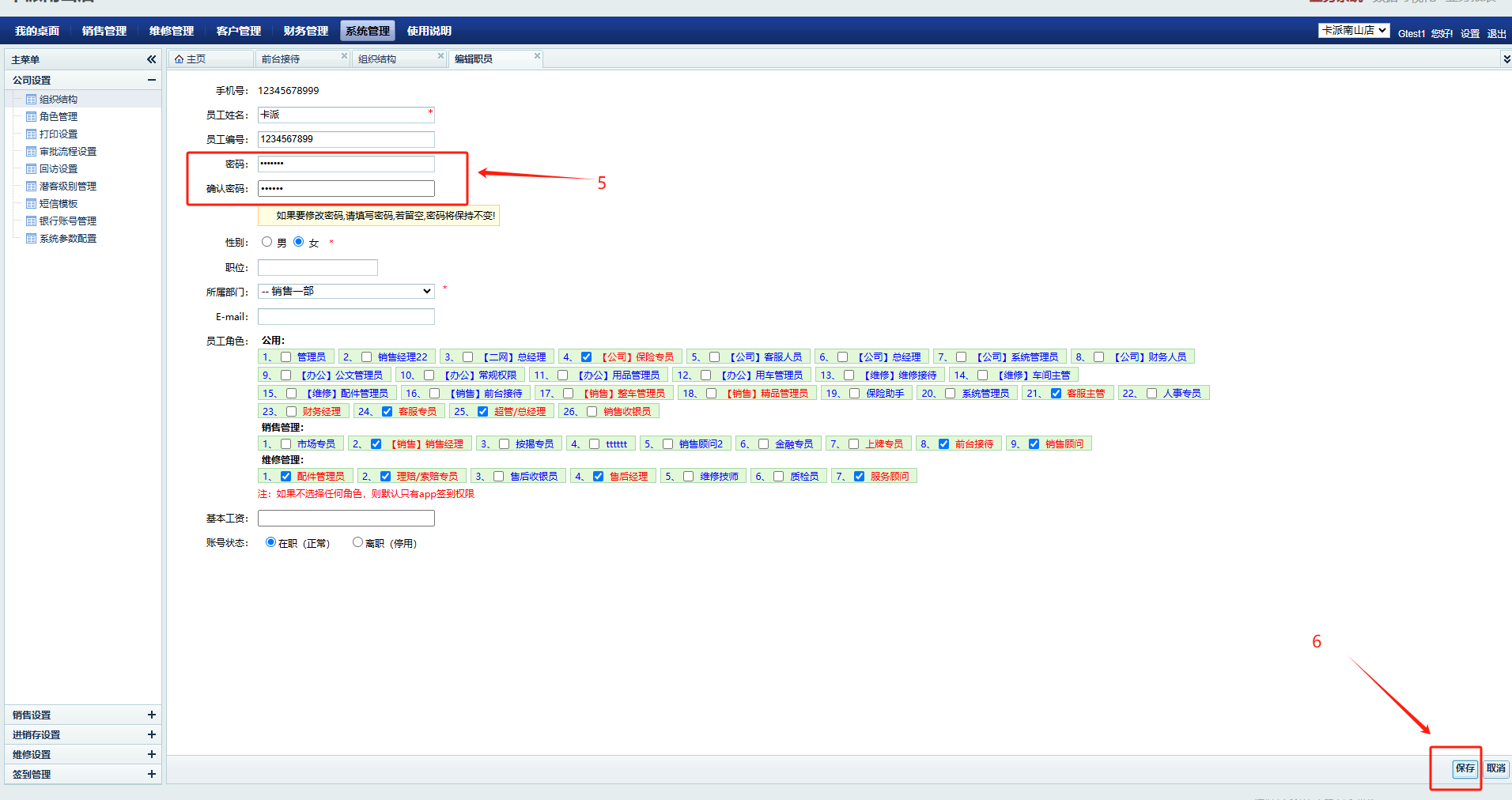 方法1:可以找贵司的系统管理员在后台DMS端去修改,系统管理→公司设置→组织结构,找到相关账号,然后勾选,点击上方工具栏“修改职员”将密码和确认密码填写好,保存即可。