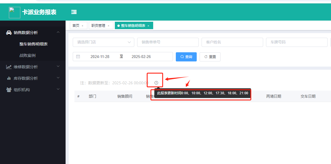 整车销售明细表、接车员明细表更新时间:10:00、12:00、17:30、18:00、21:00、00:00,每天更新6次