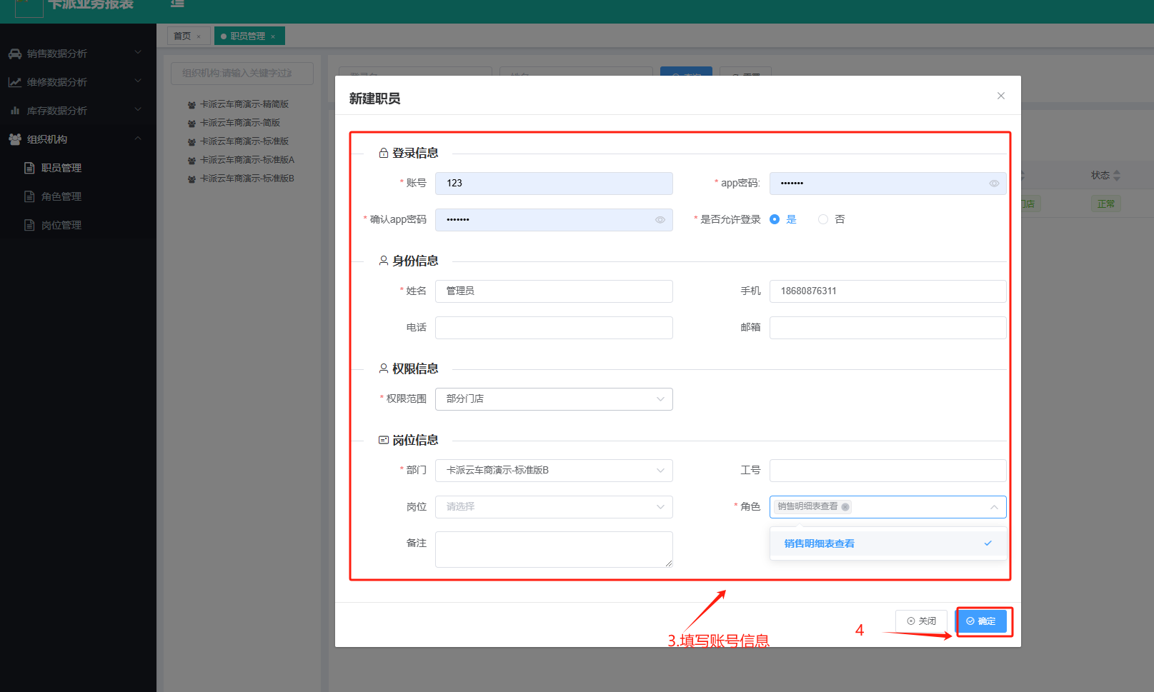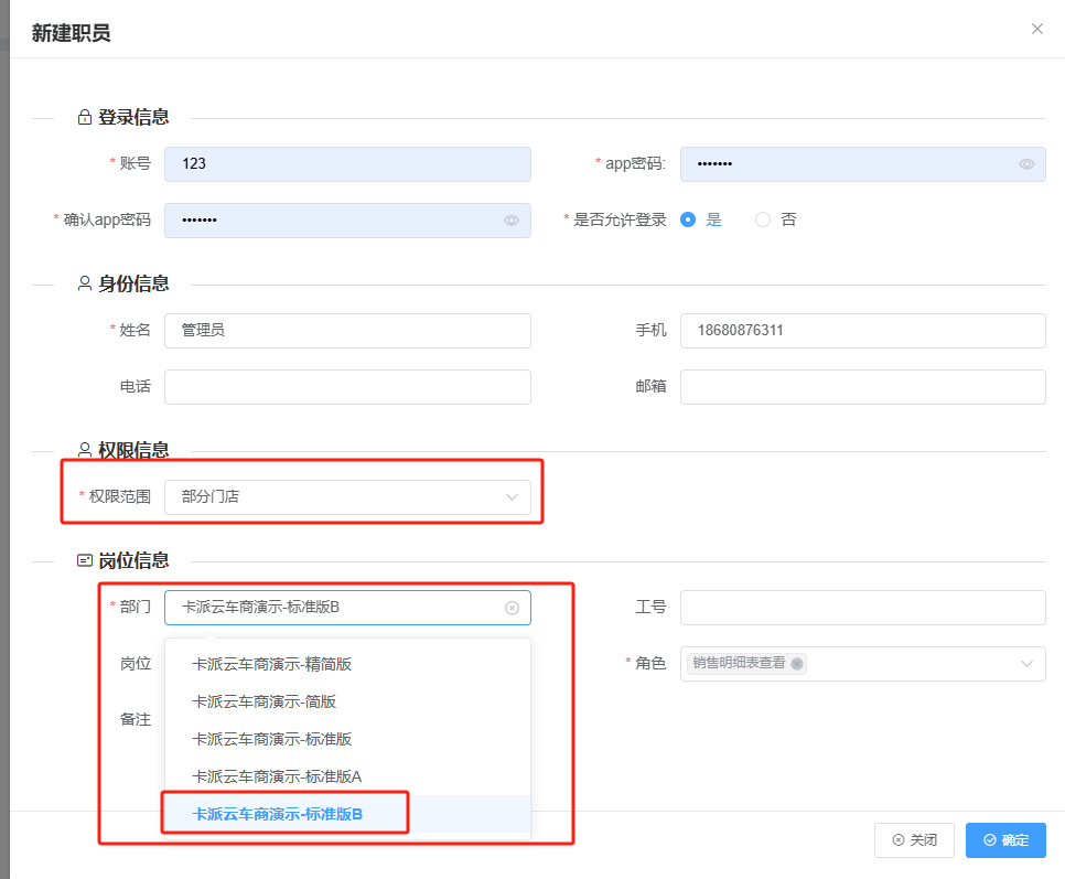 ▲只能创建DMS中已有的账号,当新建职员中“权限范围”选择了“部分门店”时,可以在列表的“门店权限”中配置可以查看的具体的门店