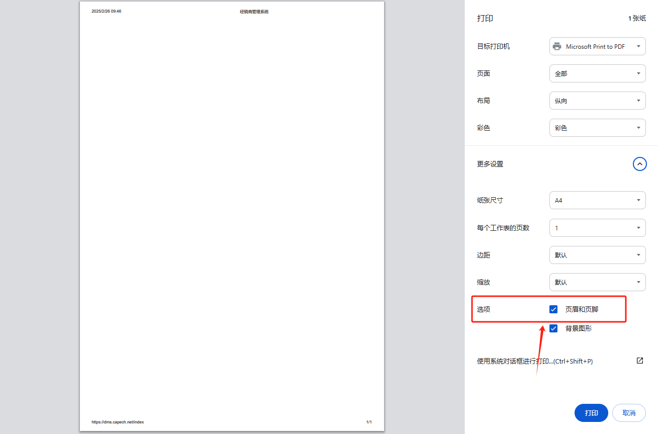 ▲在更多设置中找到页眉页脚,取消打勾即可。