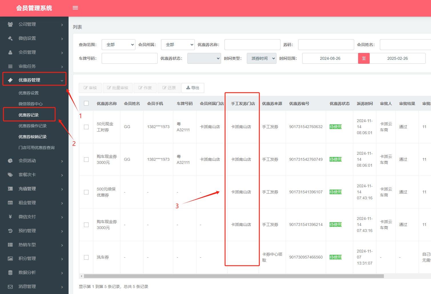 登录会员系统,在【优惠券记录】列表可以查看到优惠券发放的门店