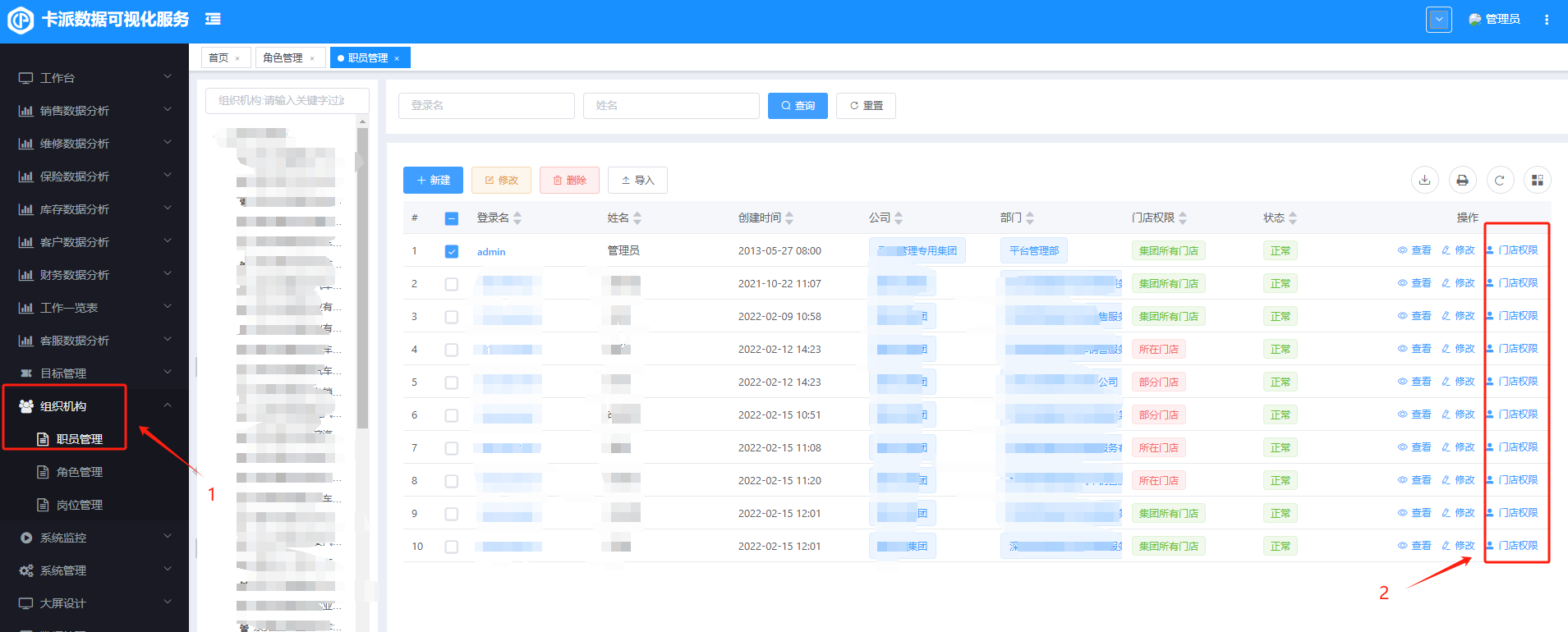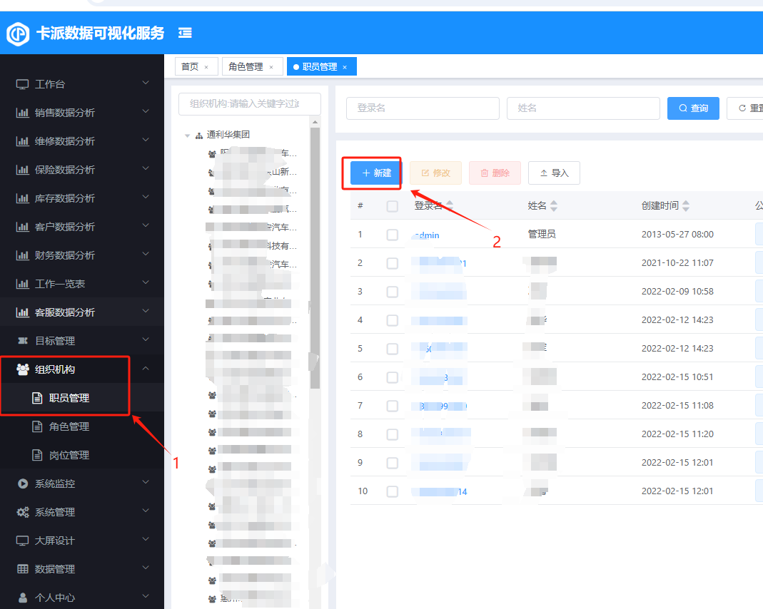 2、可按“新建”按钮增加职员,也可按“导入”批量导入职员信息;点击下载:数据可视化服务职员导入模板
